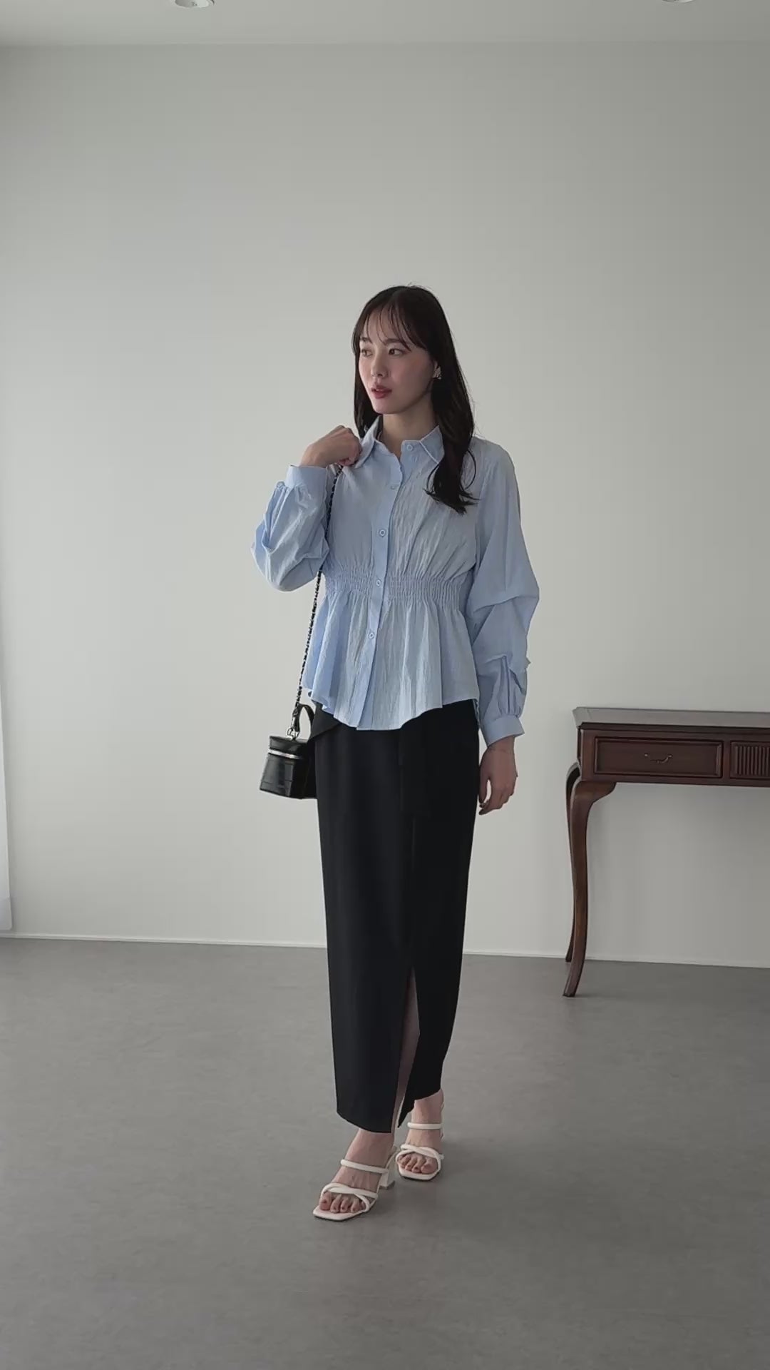 袖に品の良いボリュームを出すタックスリーブと、ウエストからふんわり広がるペプラムラインの組み合わせが、