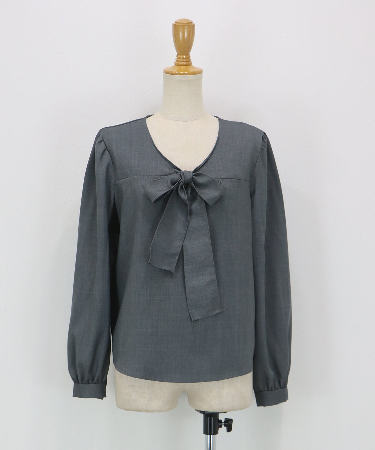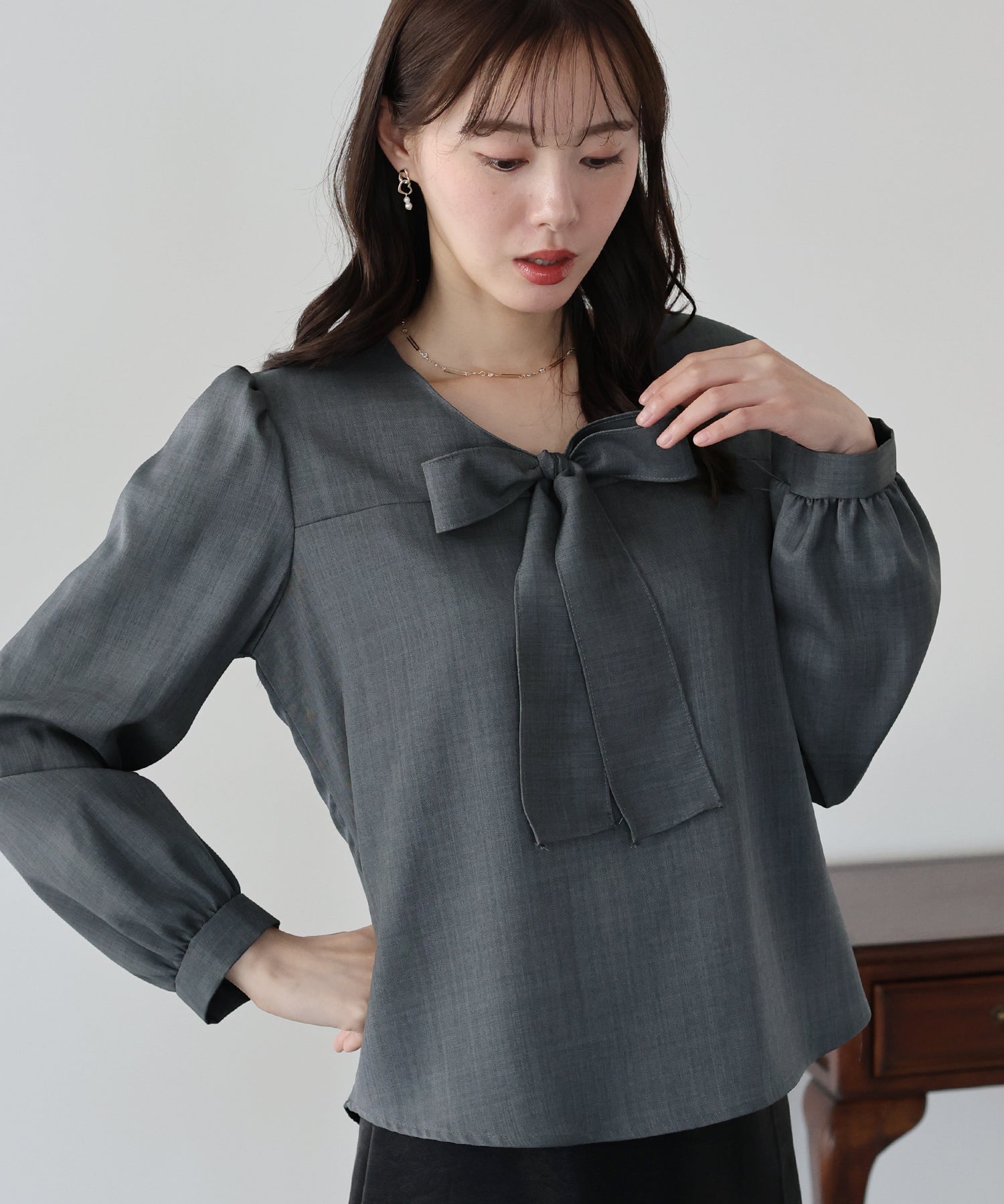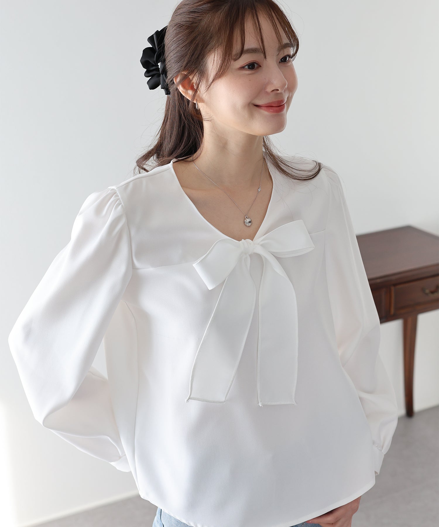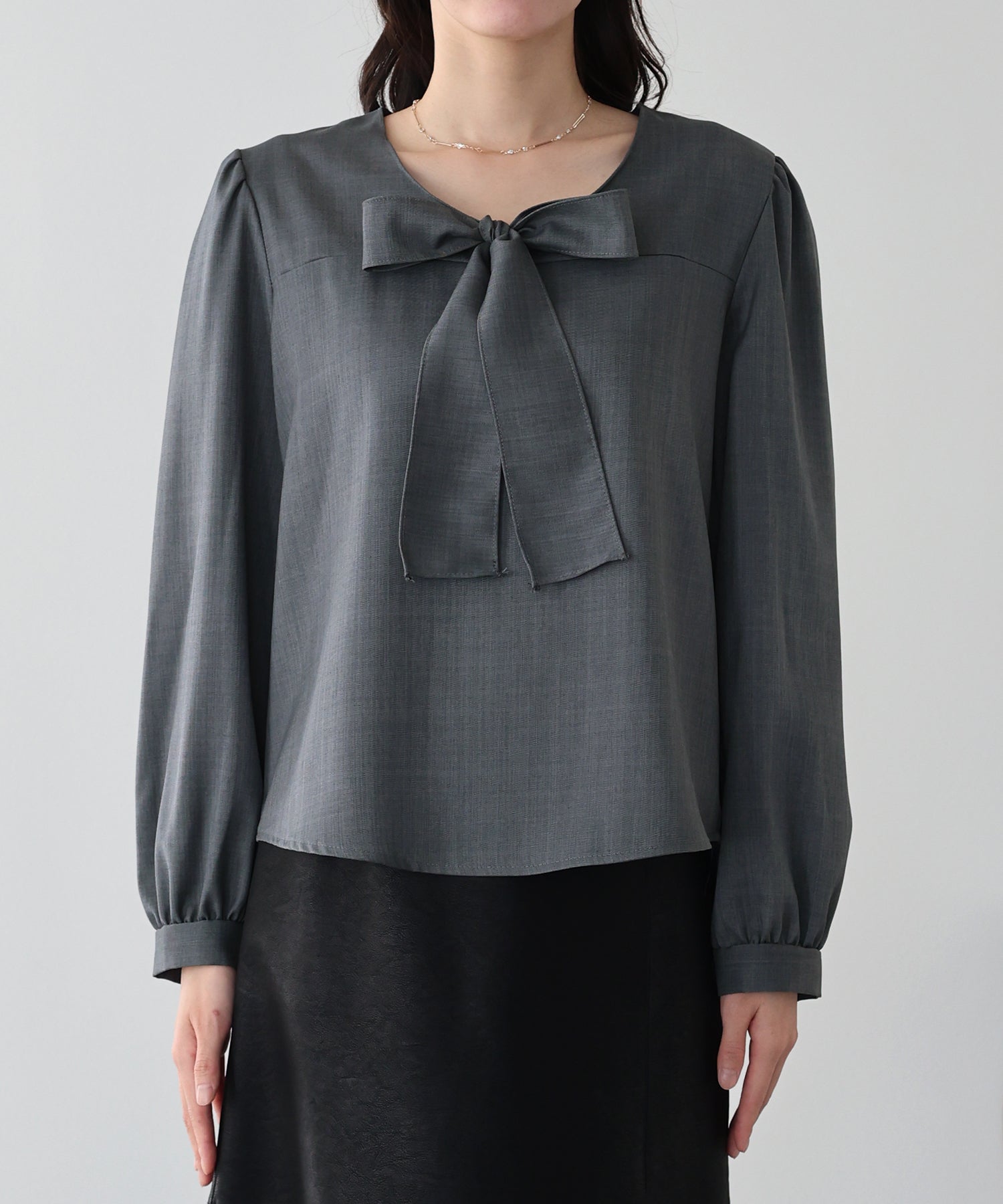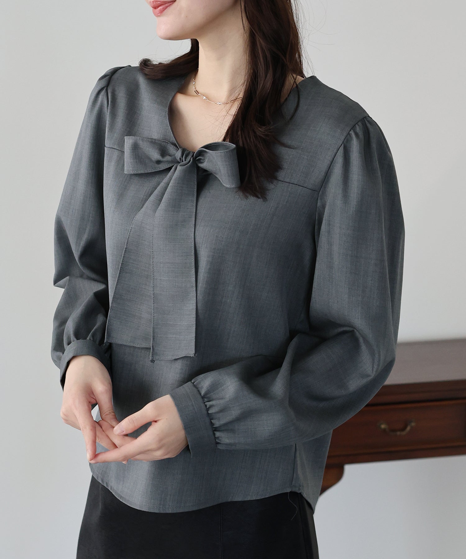 ノーカラーのすっきりとした首元に、フロントのリボンを結ぶだけで簡単にボウタイが完成するデザインが魅力のきれいめブラウス。