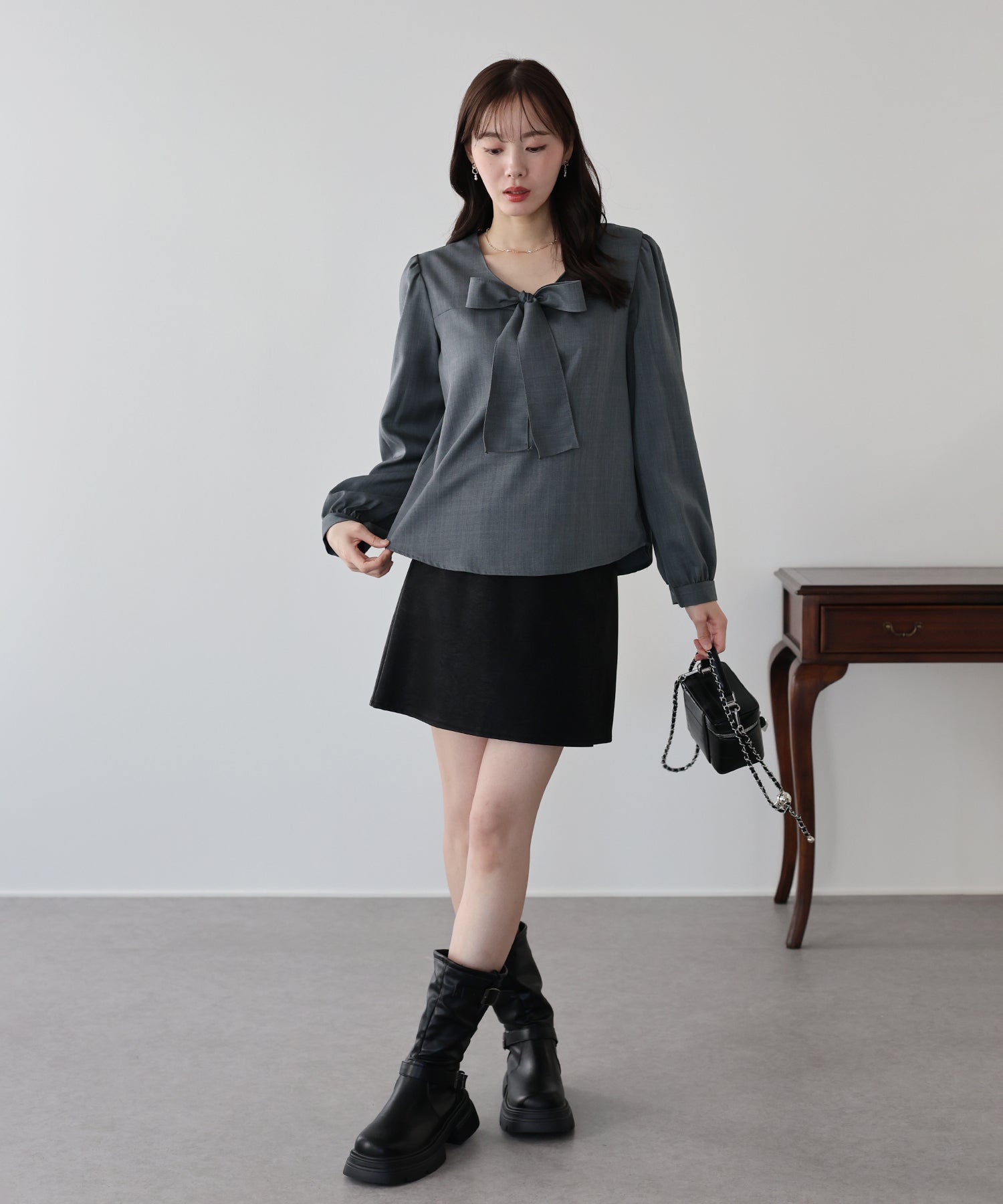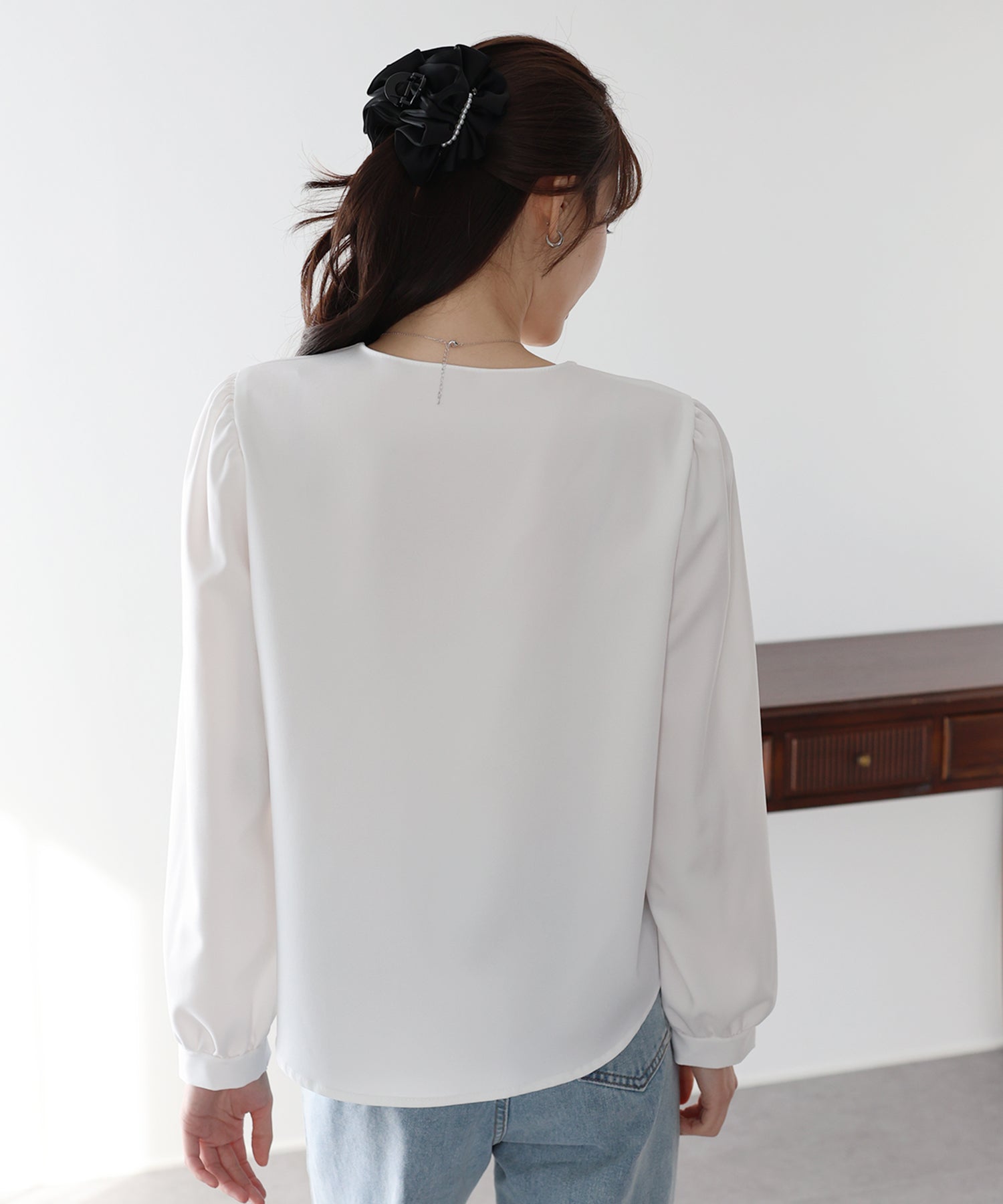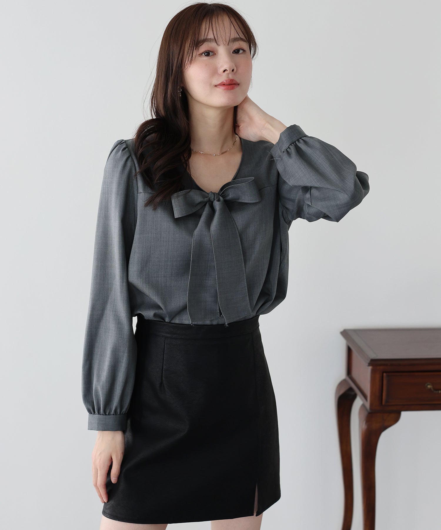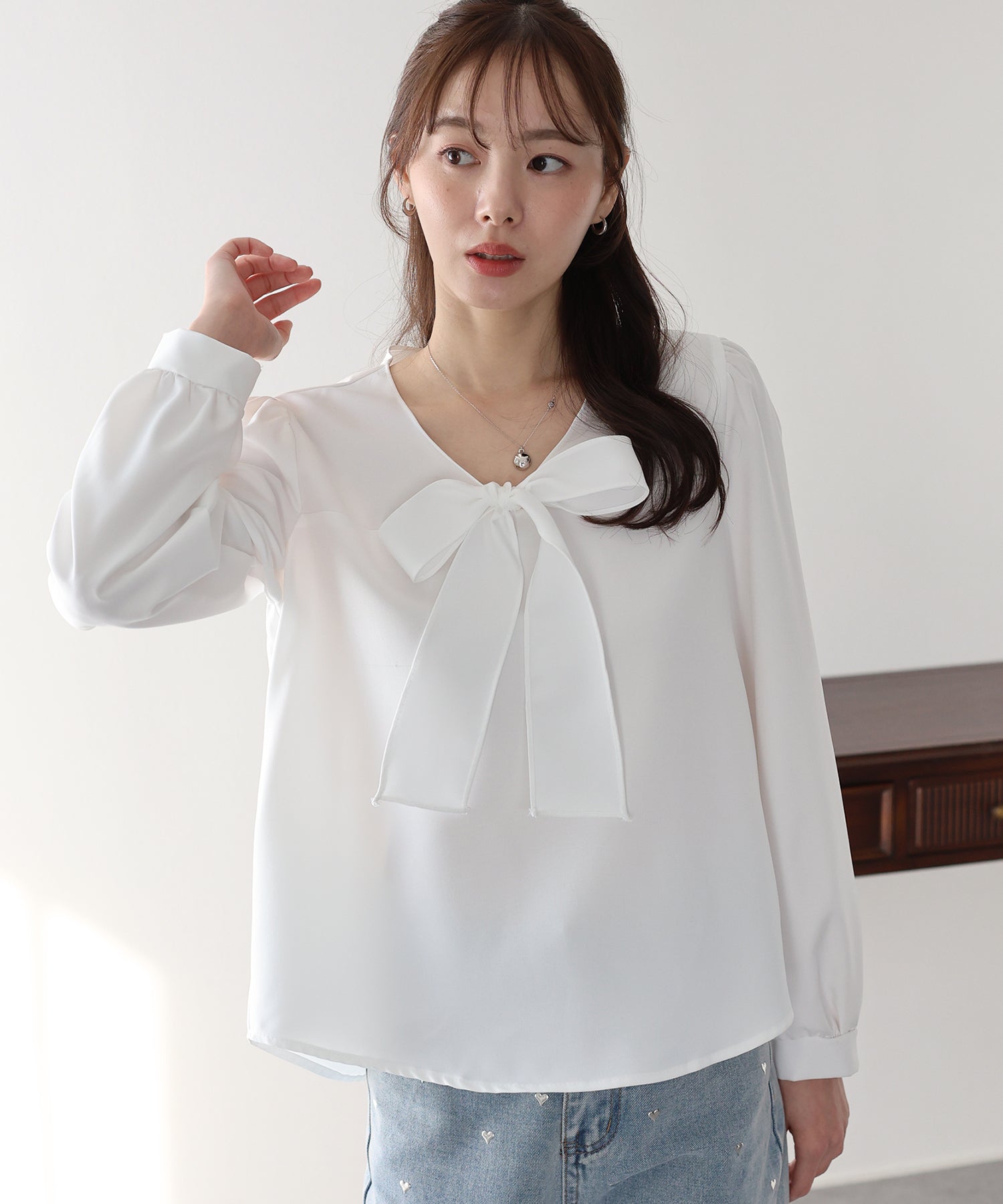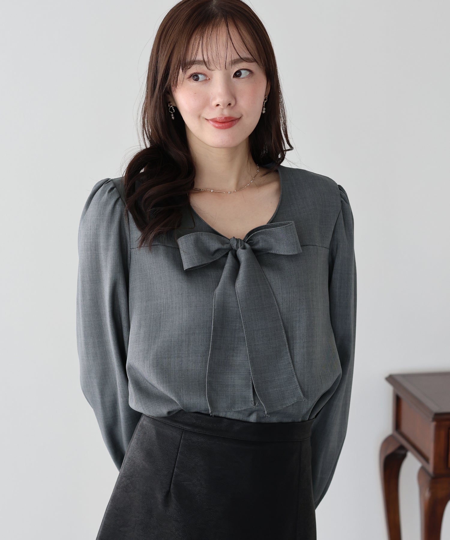 ノーカラーのすっきりとした首元に、フロントのリボンを結ぶだけで簡単にボウタイが完成するデザインが魅力のきれいめブラウス。