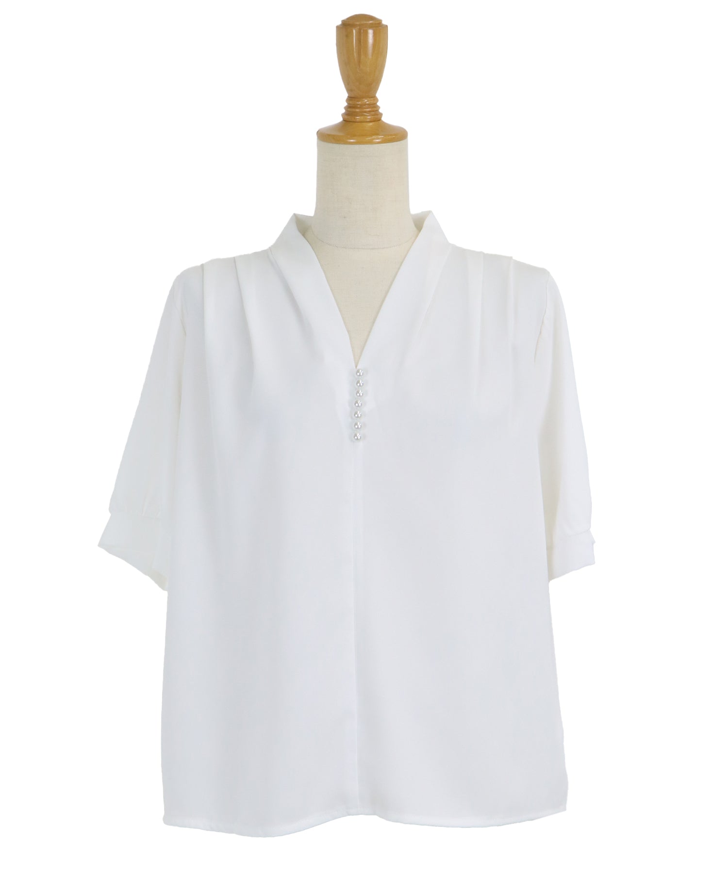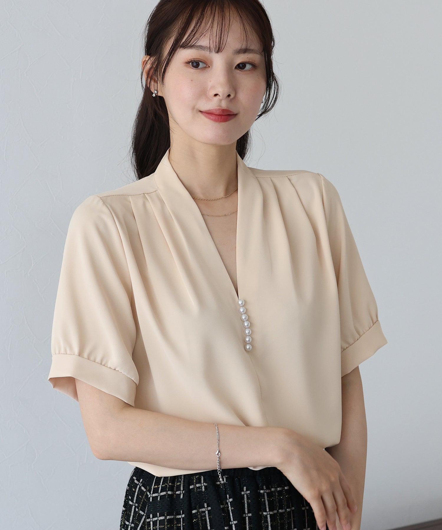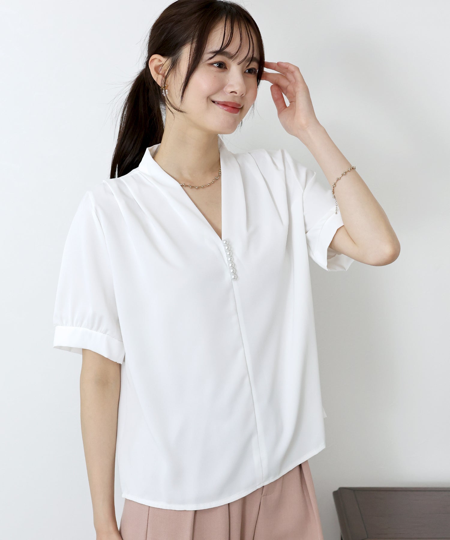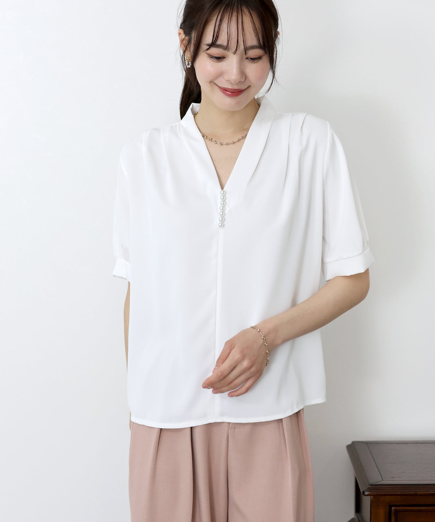 顔周りがすっきりと見えるVネックのきれいめブラウス。