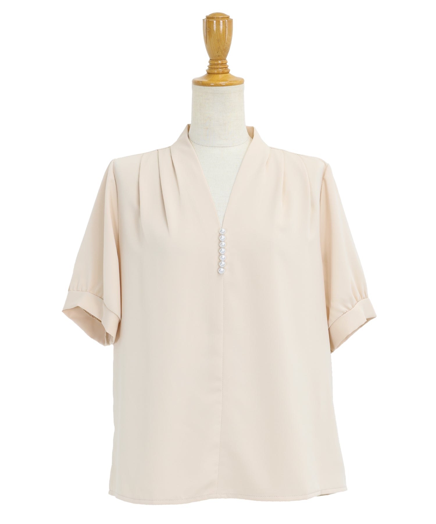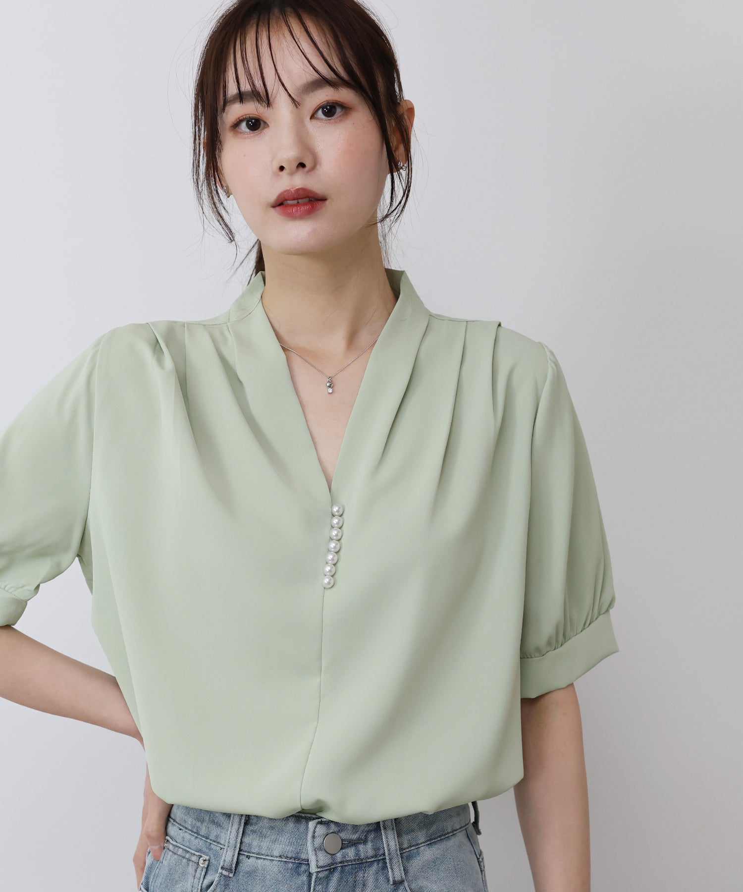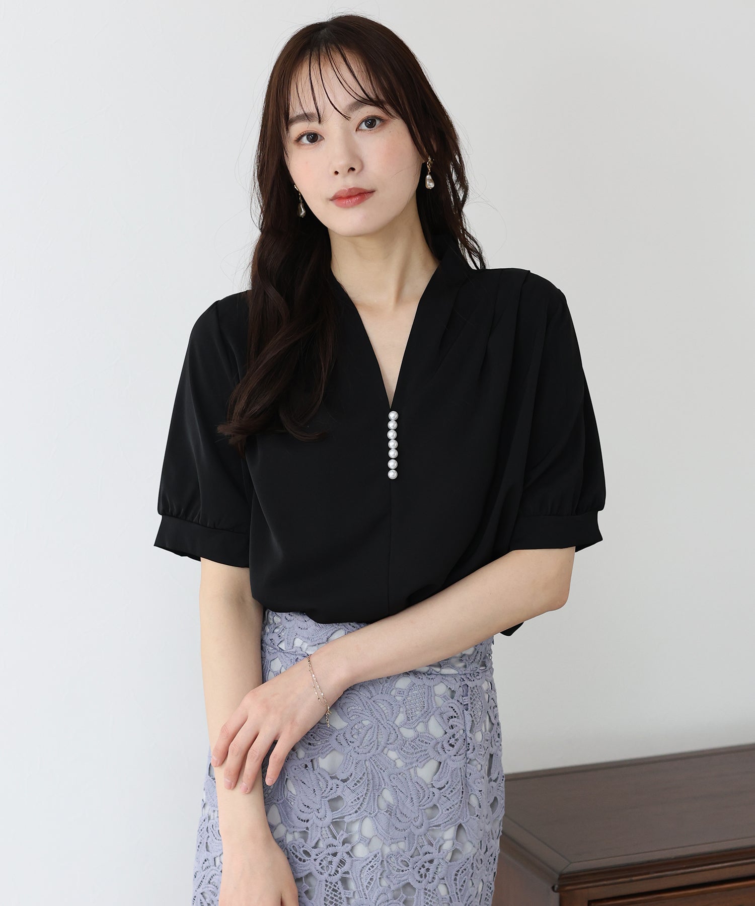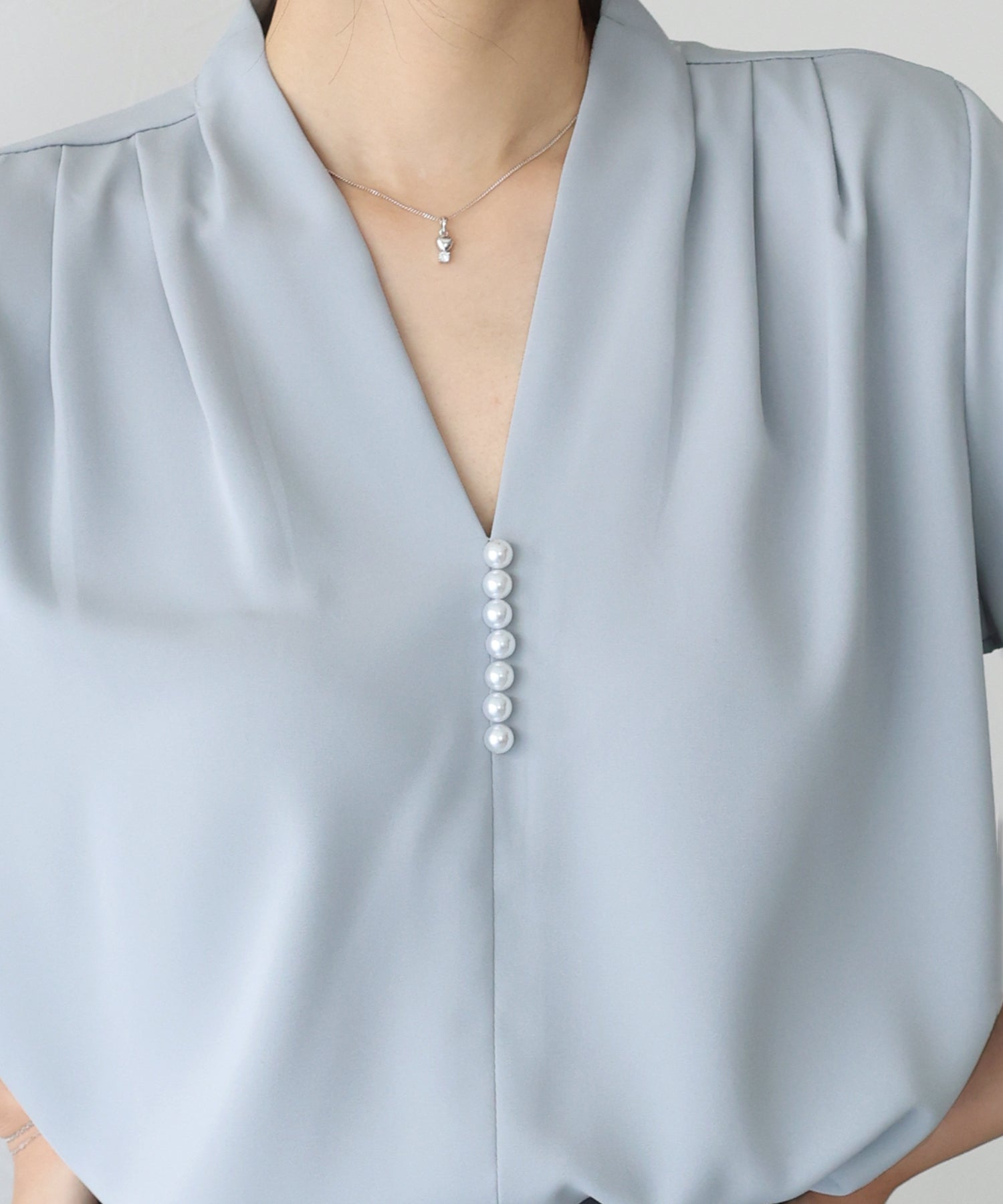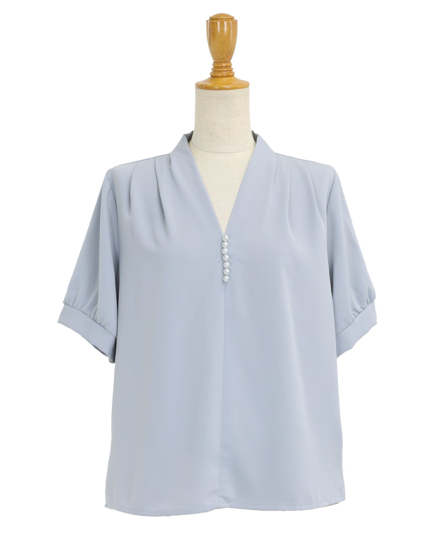 顔周りがすっきりと見えるVネックのきれいめブラウス。