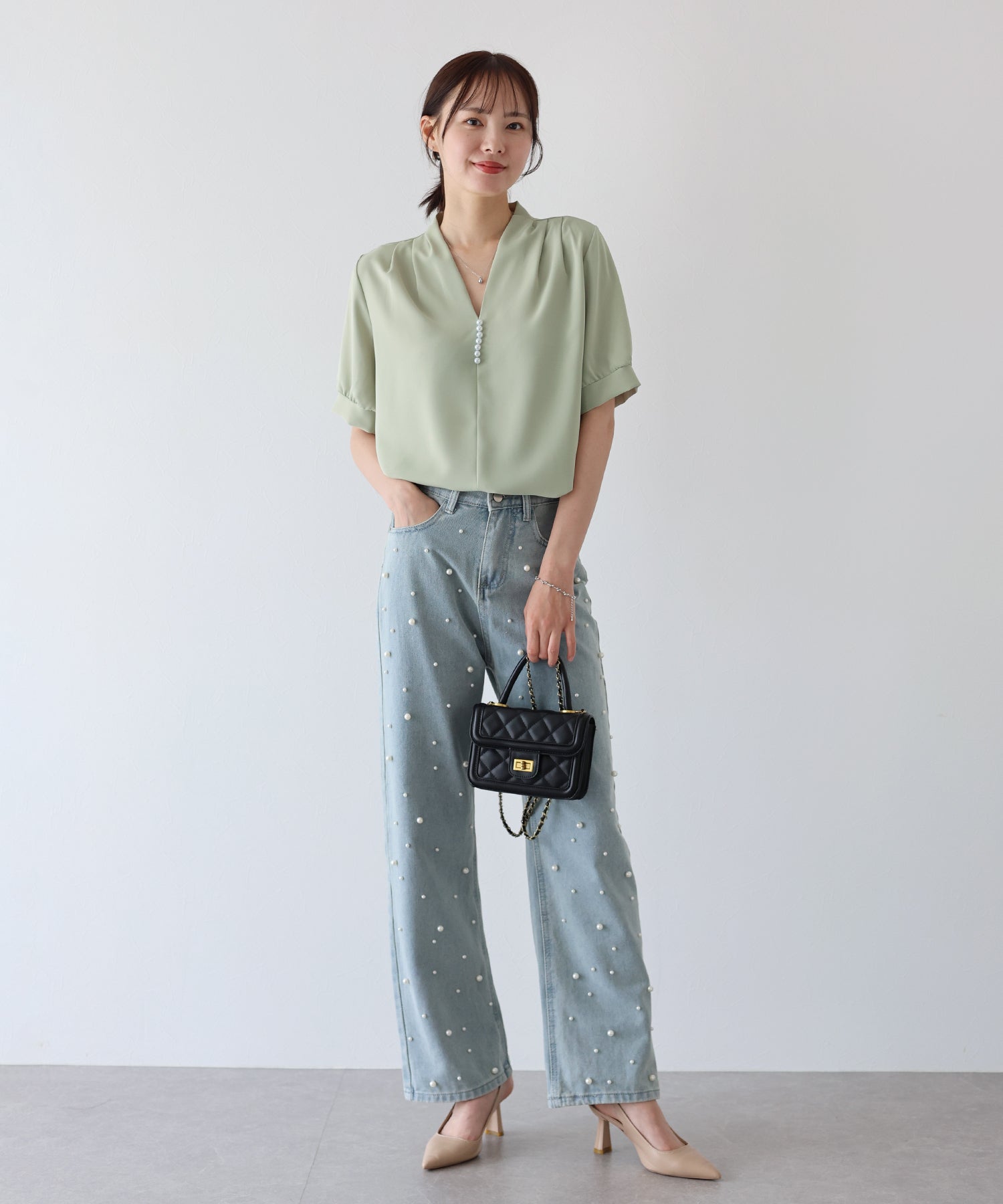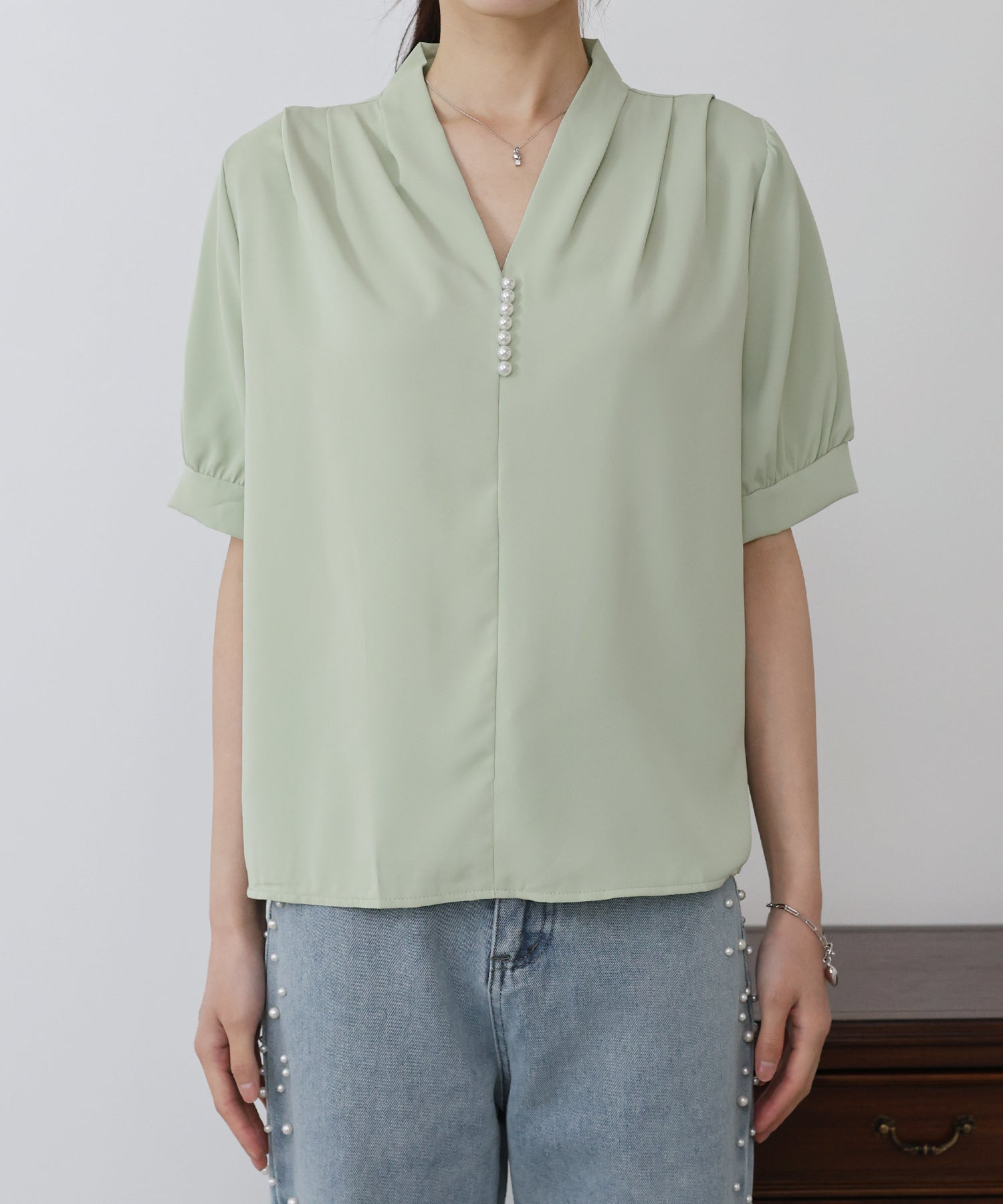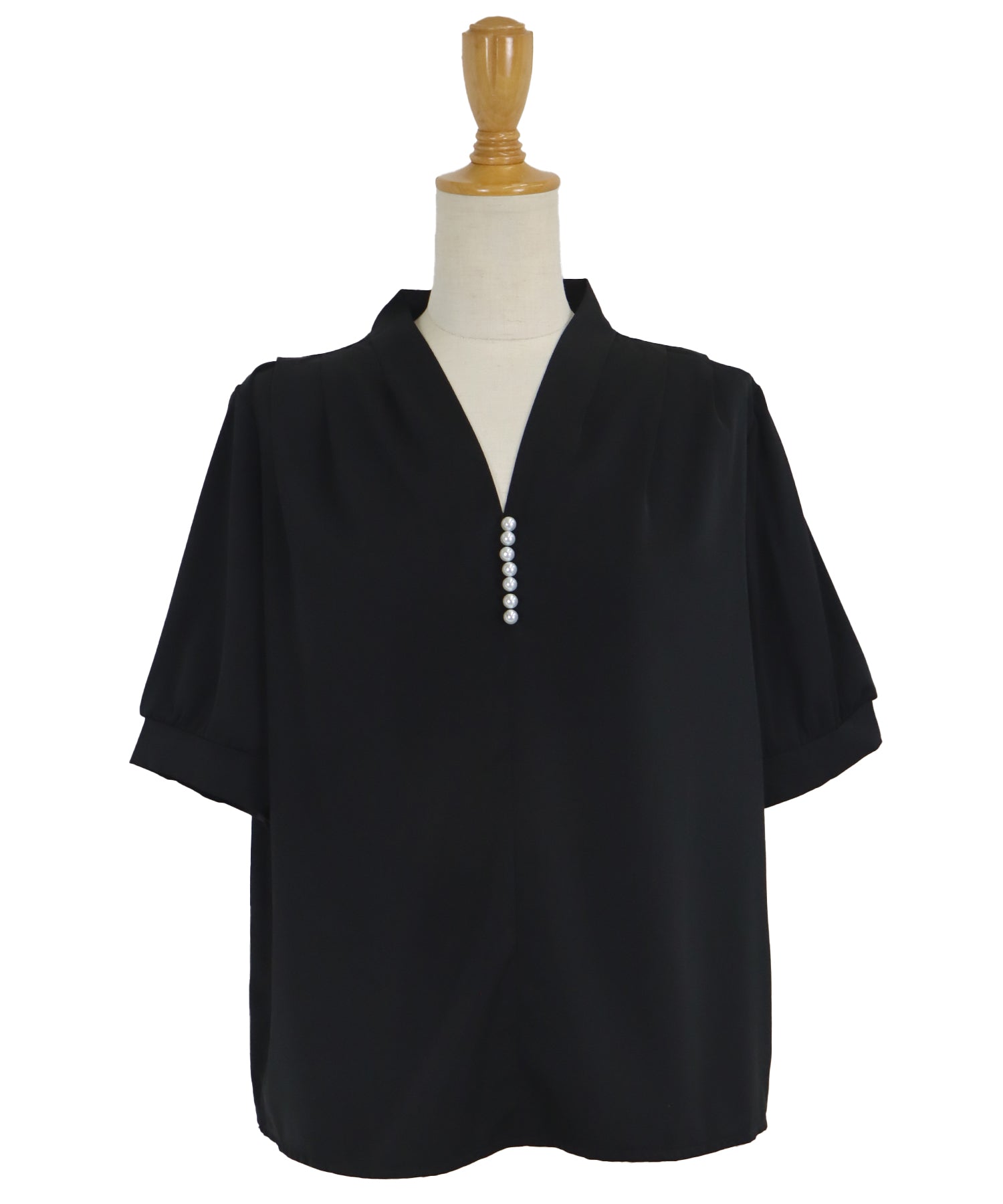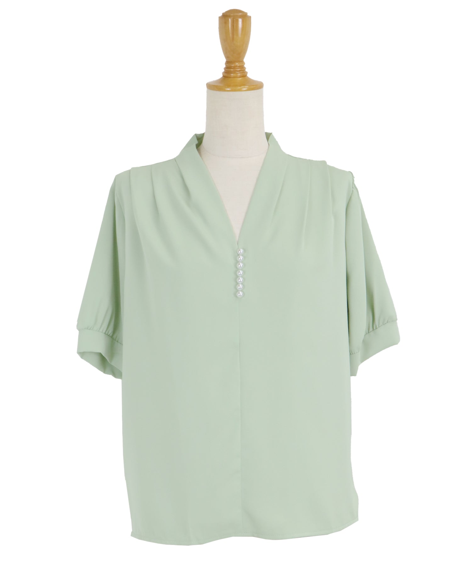 顔周りがすっきりと見えるVネックのきれいめブラウス。