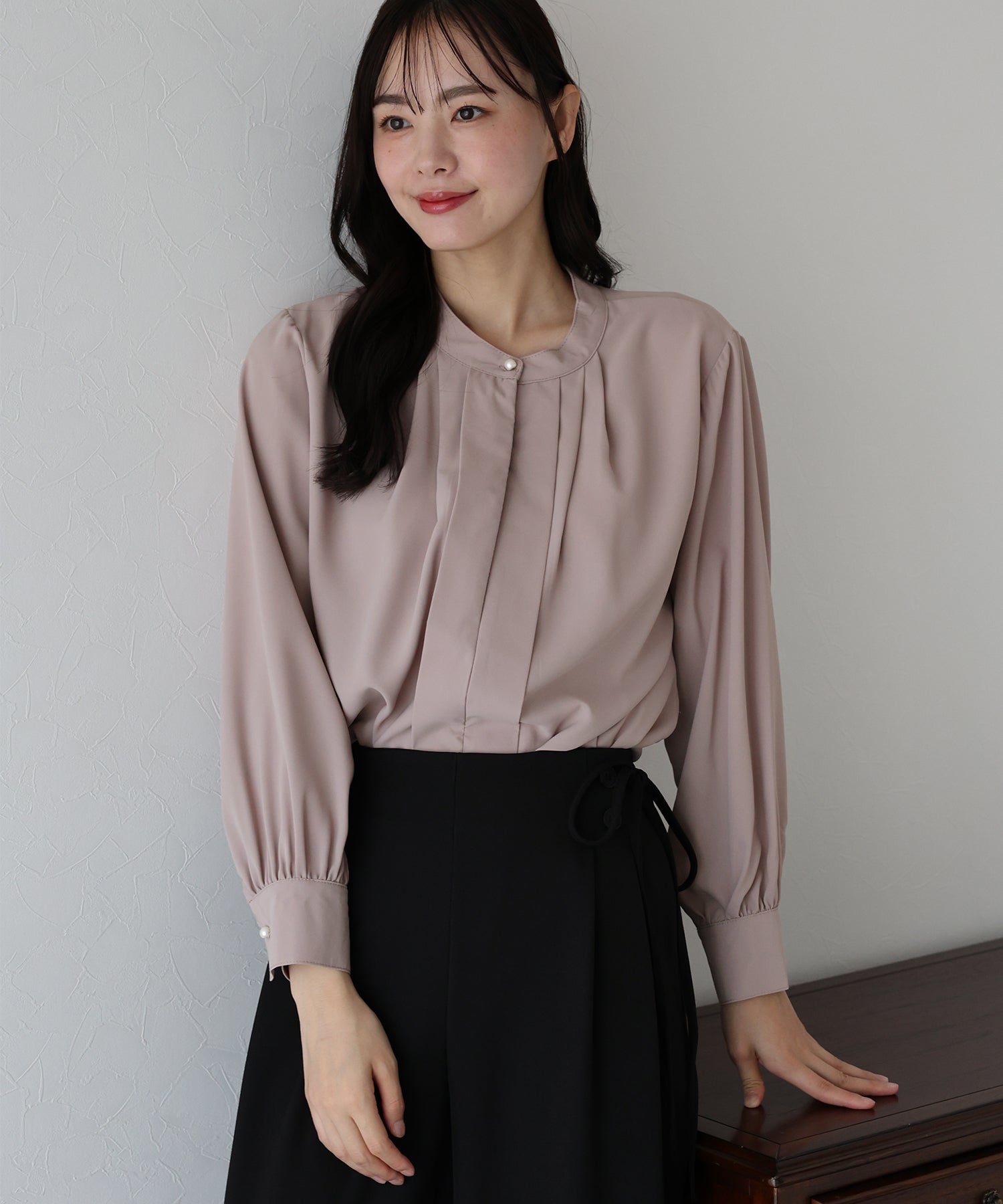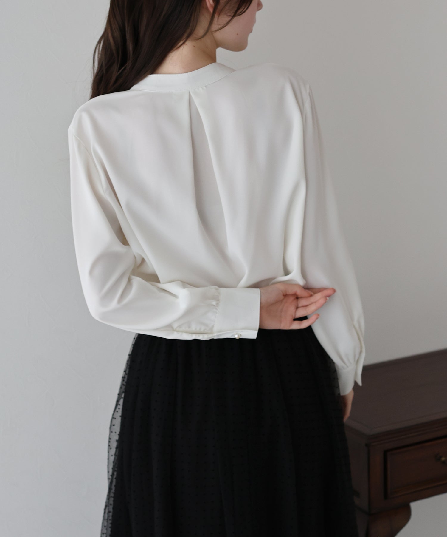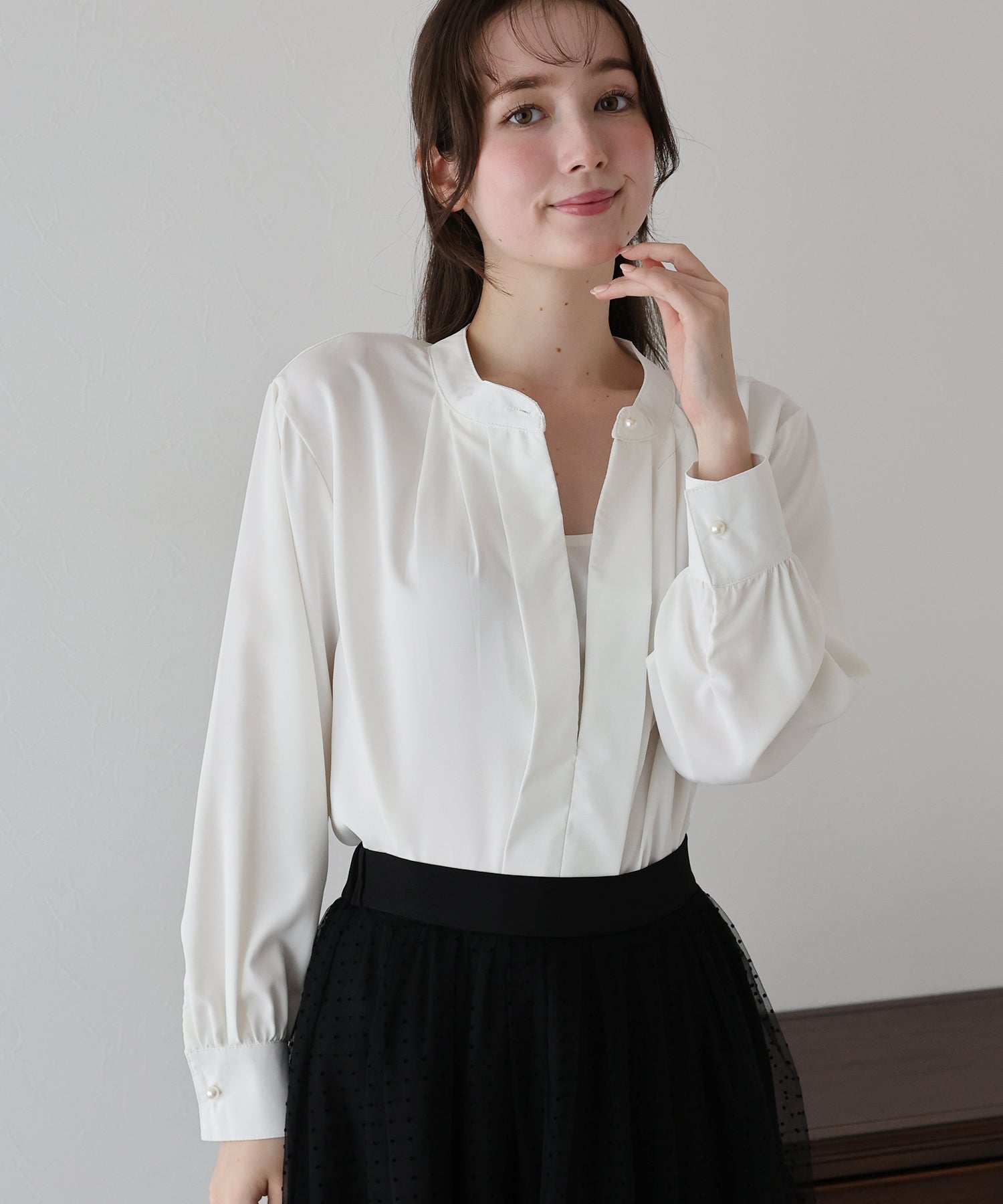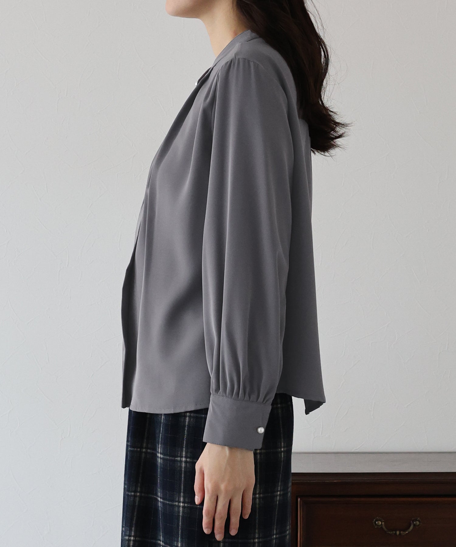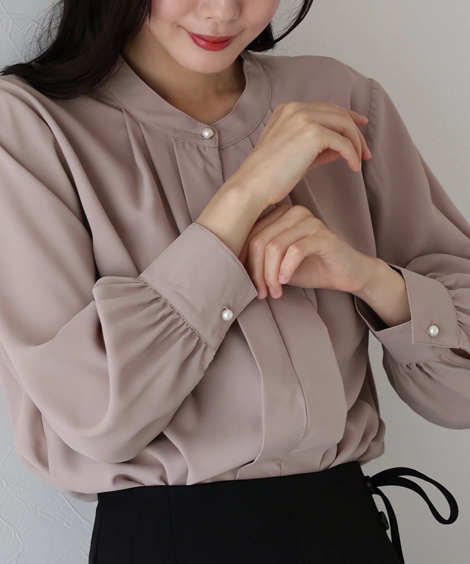 フロント部分のタックやネックと袖口にパールボタンをあしらい、上品なポイントを加えました。