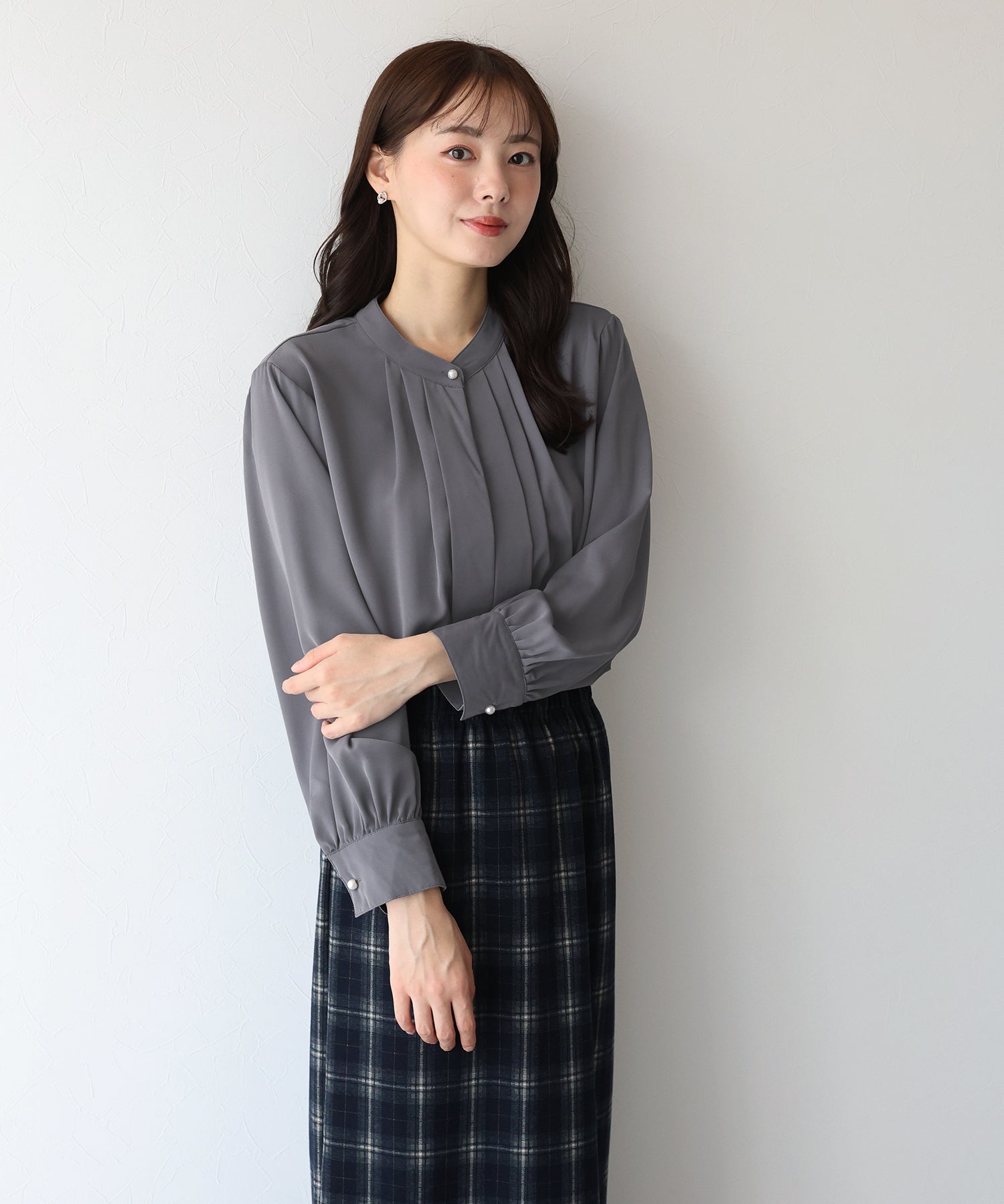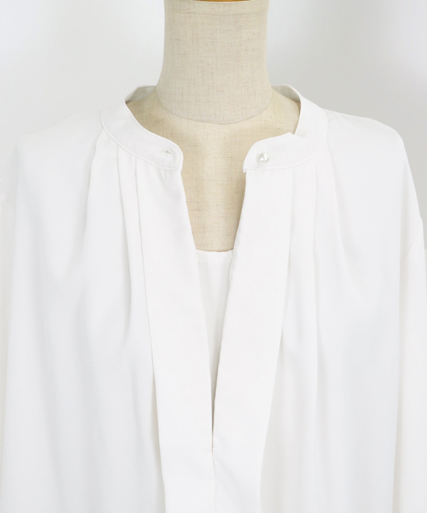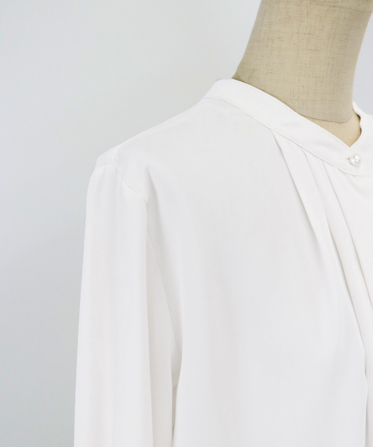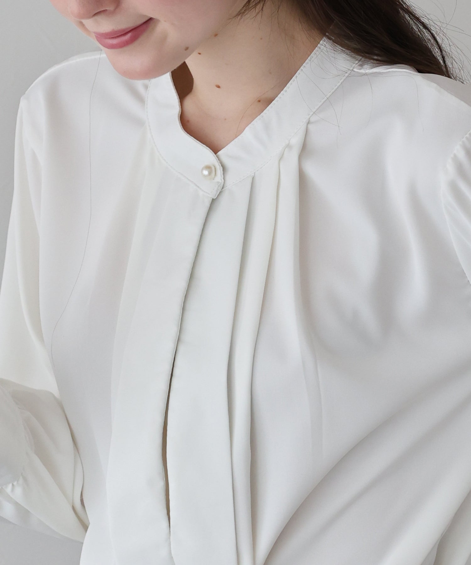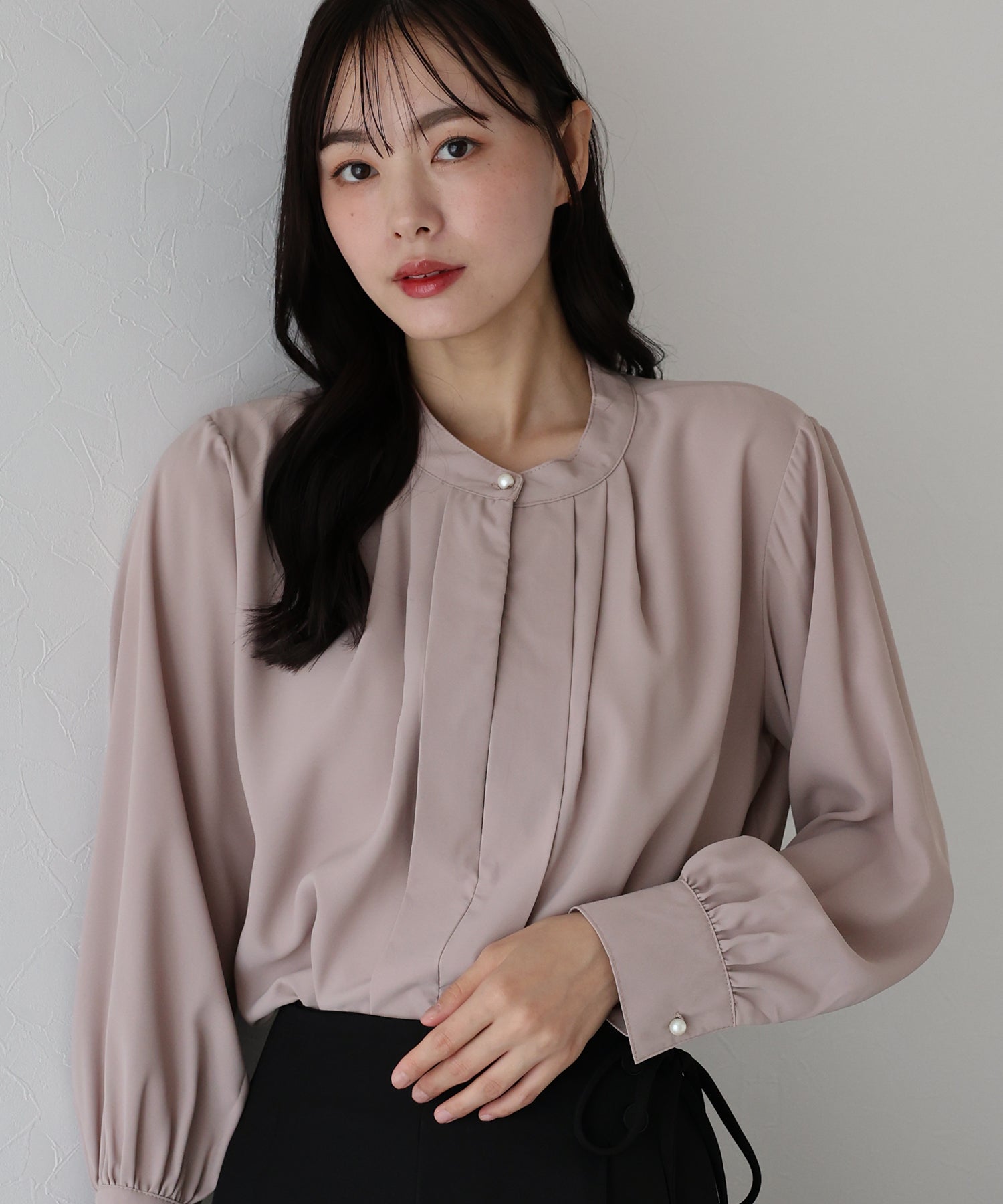 フロント部分のタックやネックと袖口にパールボタンをあしらい、上品なポイントを加えました。
