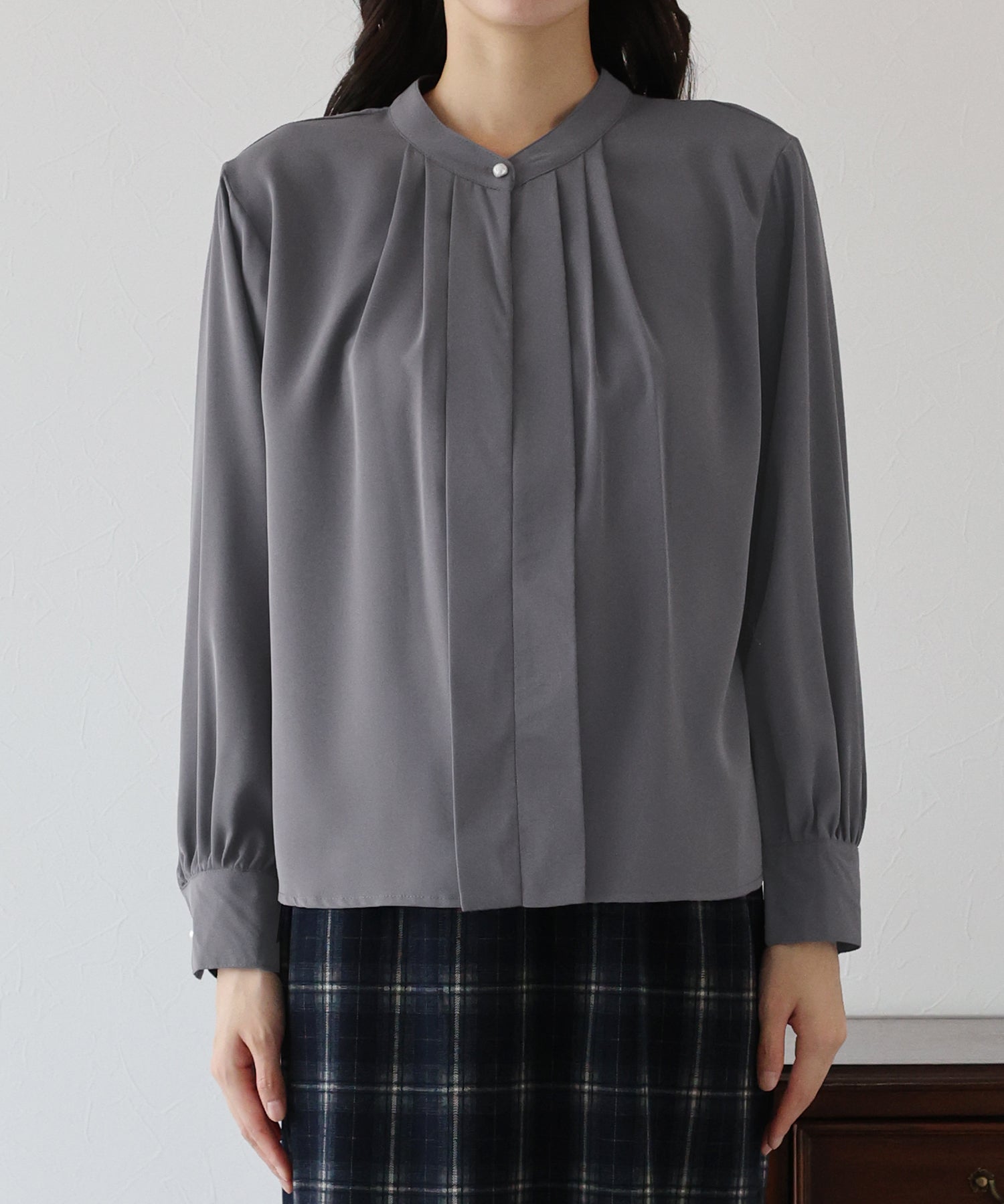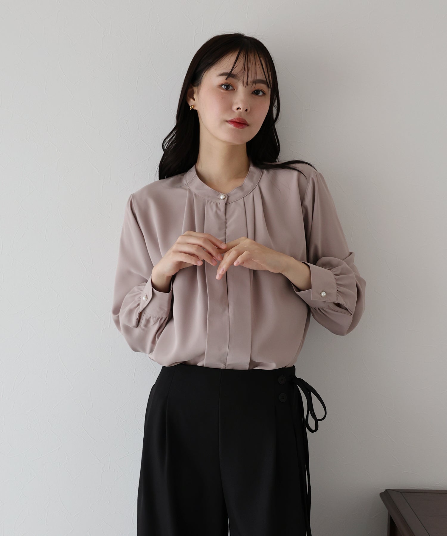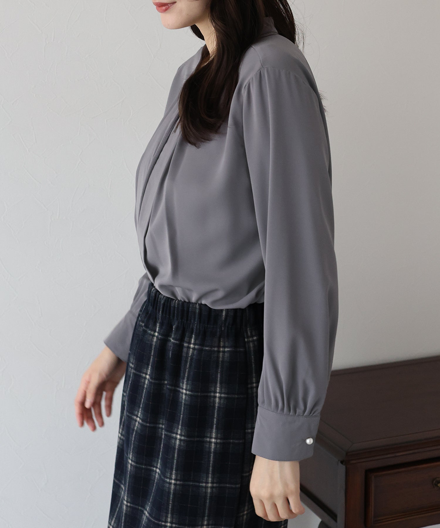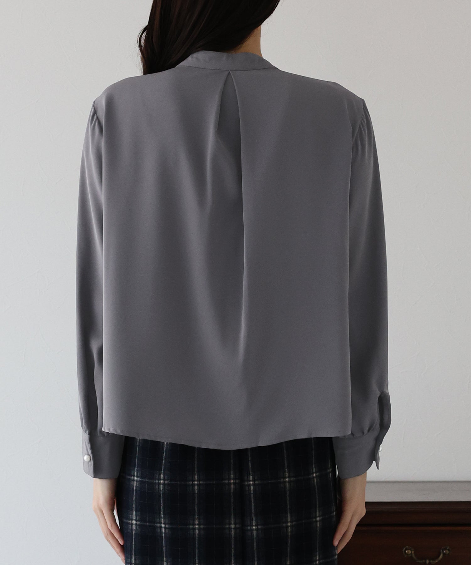 フロント部分のタックやネックと袖口にパールボタンをあしらい、上品なポイントを加えました。