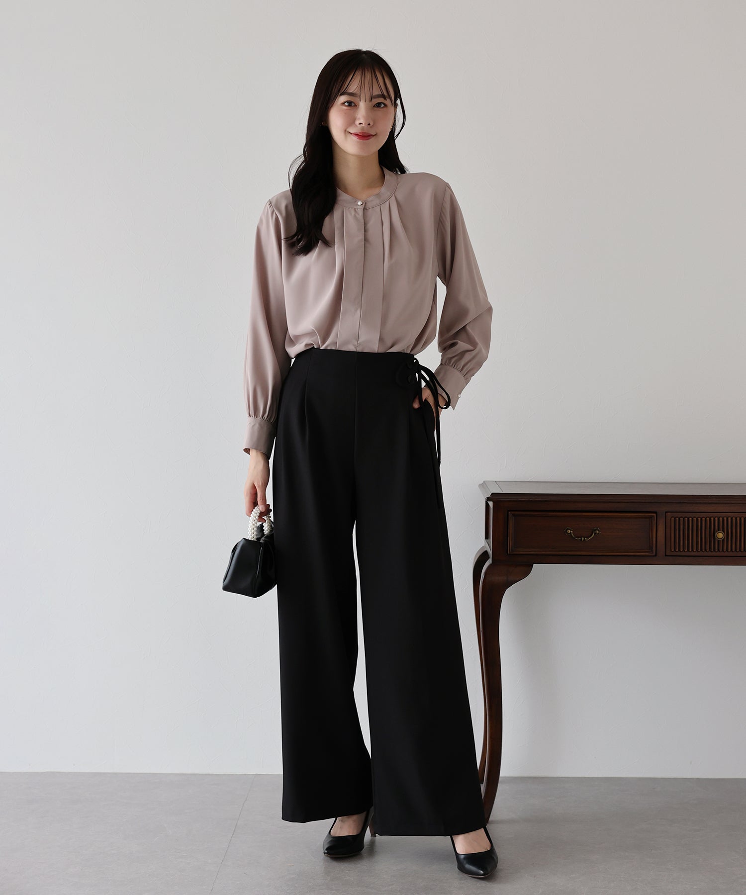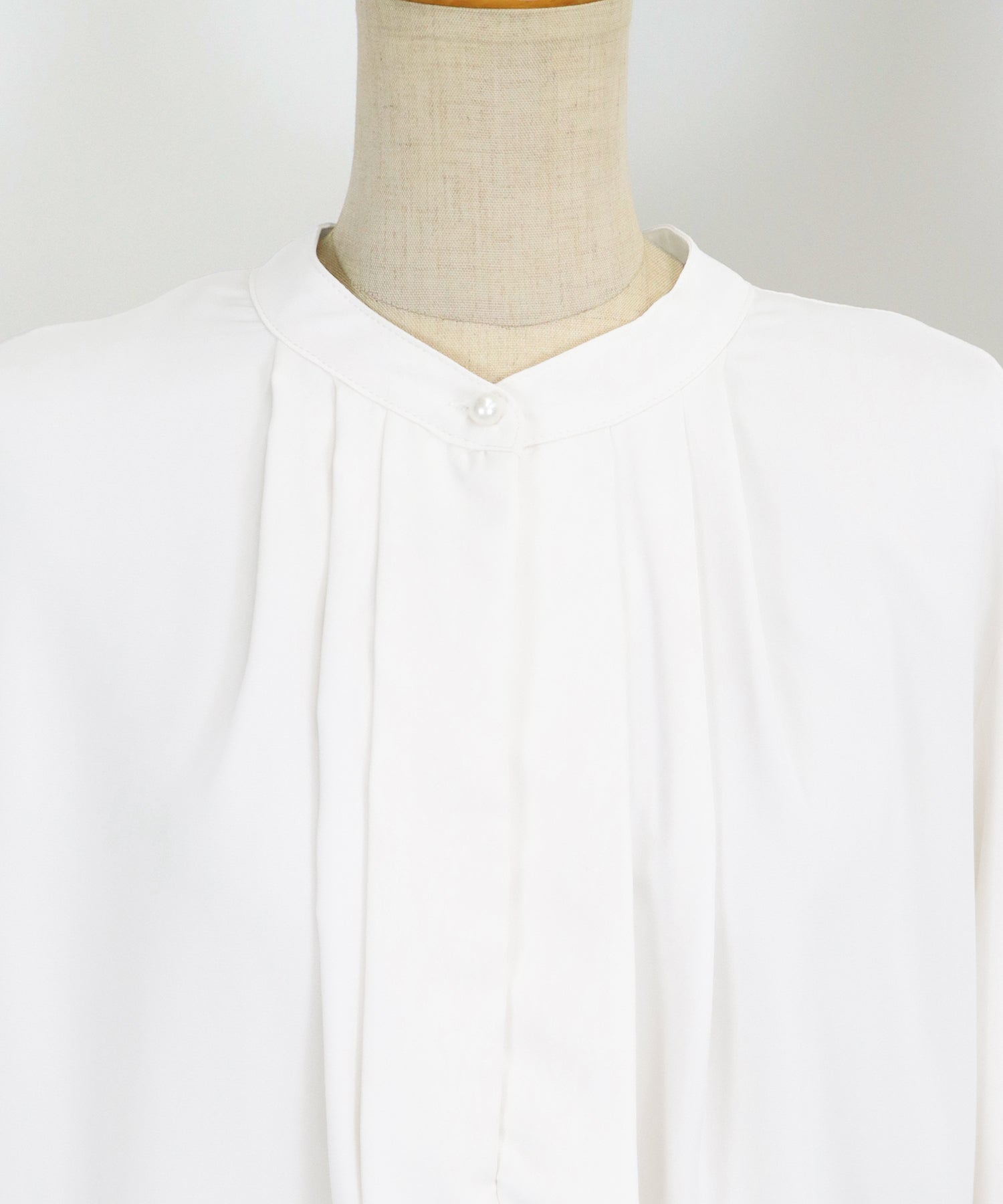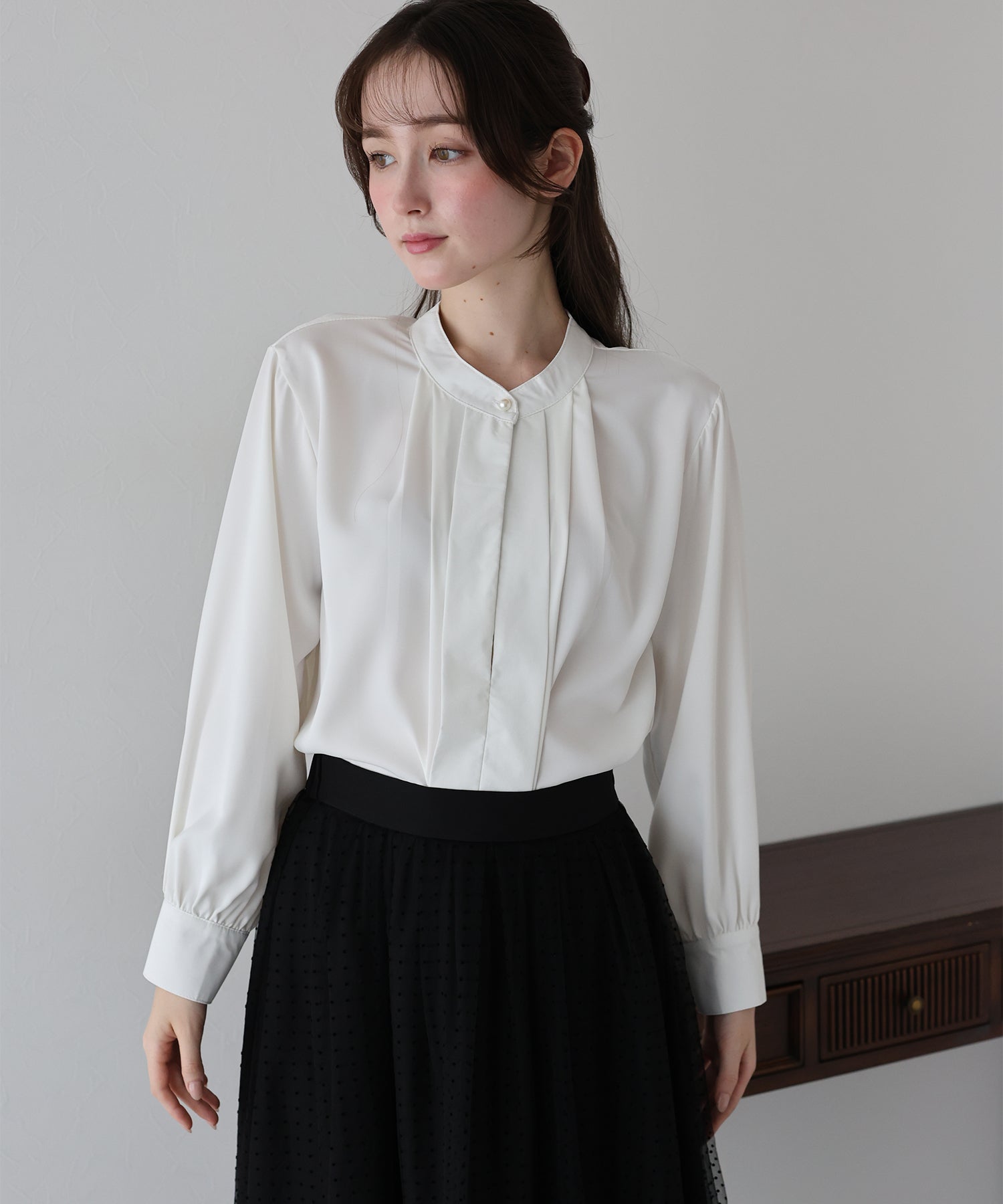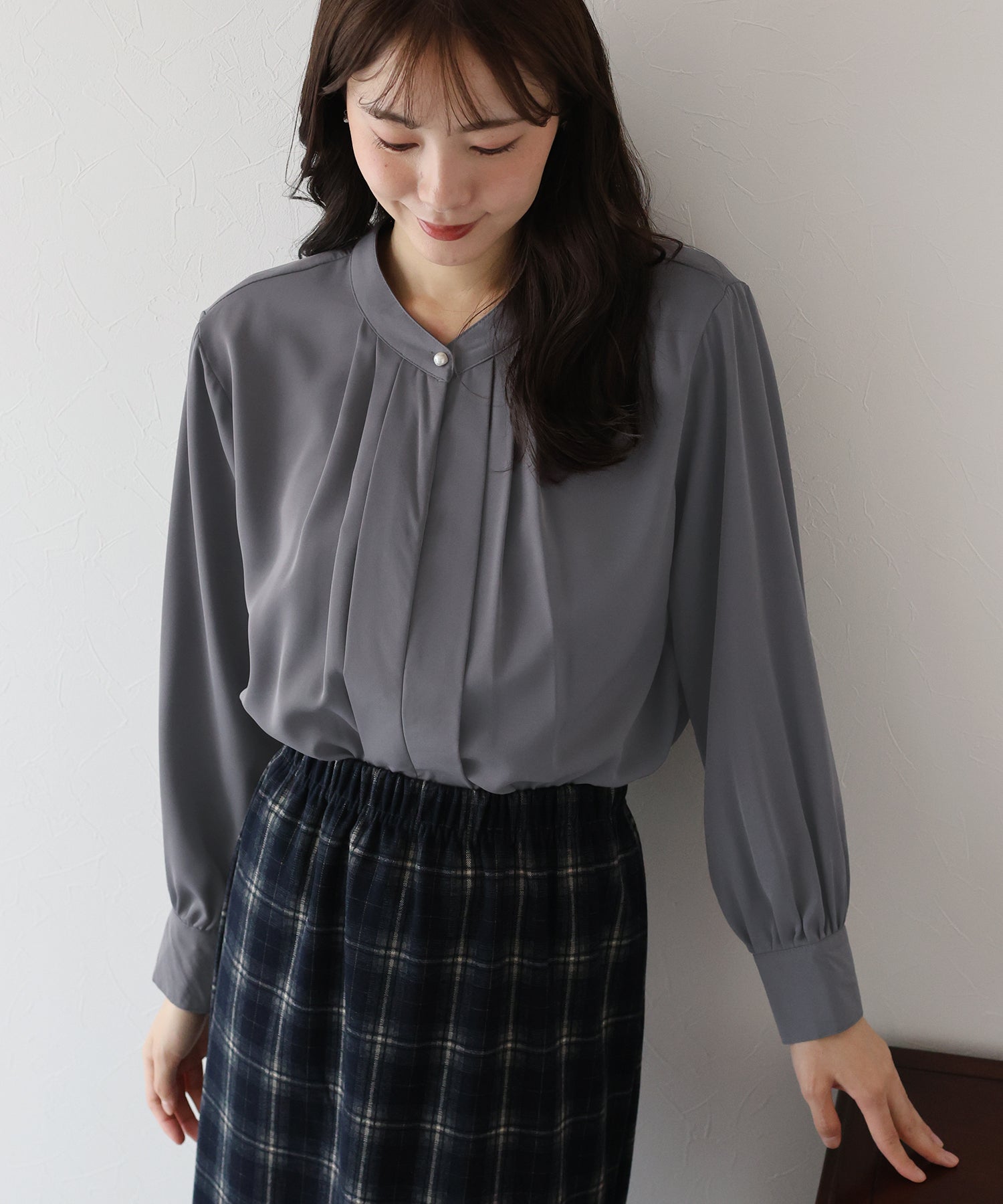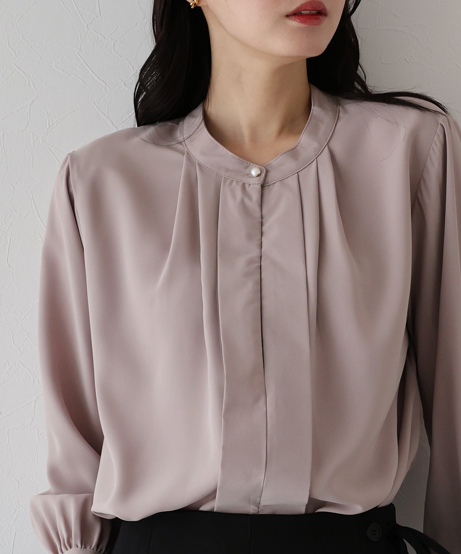 フロント部分のタックやネックと袖口にパールボタンをあしらい、上品なポイントを加えました。