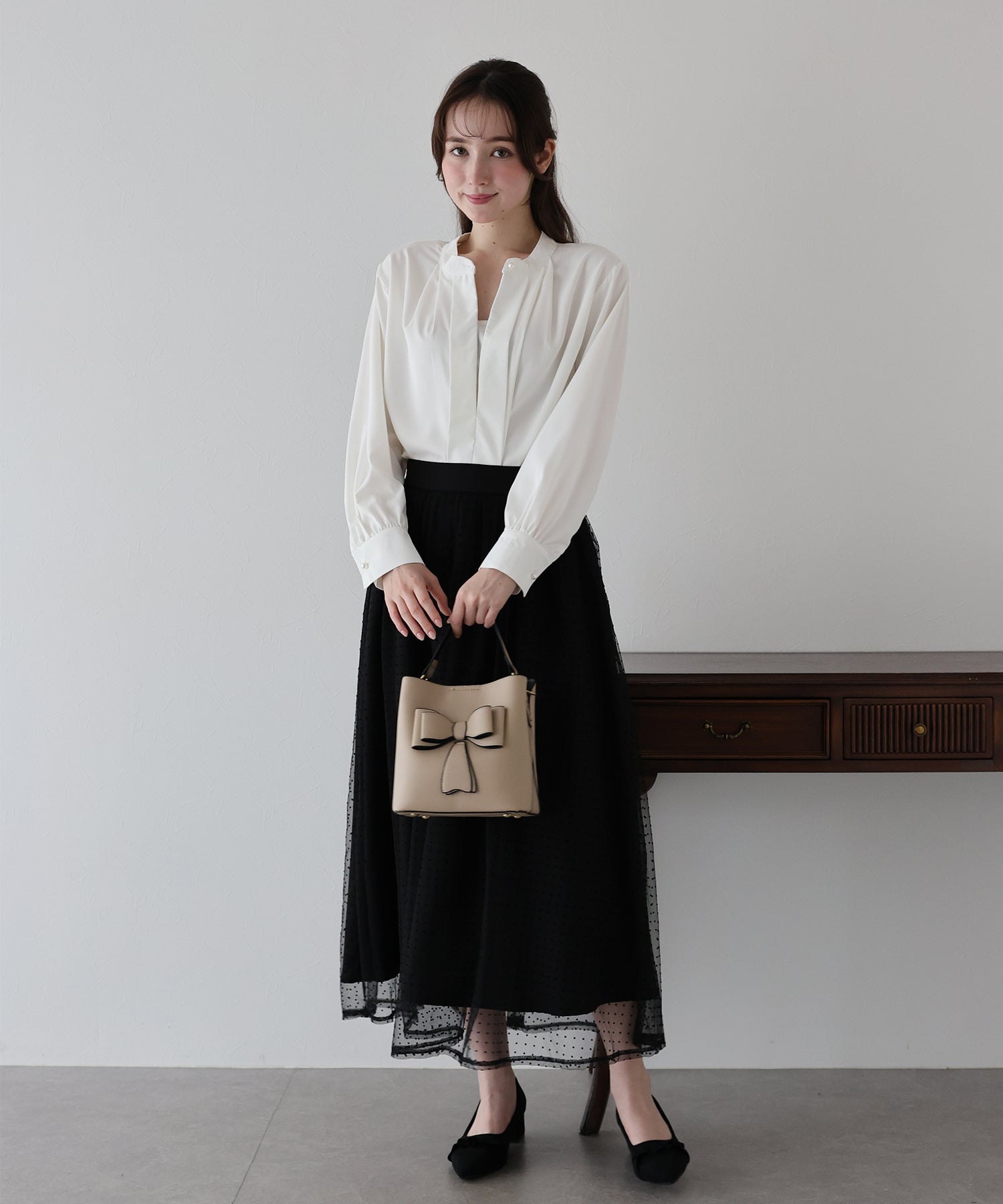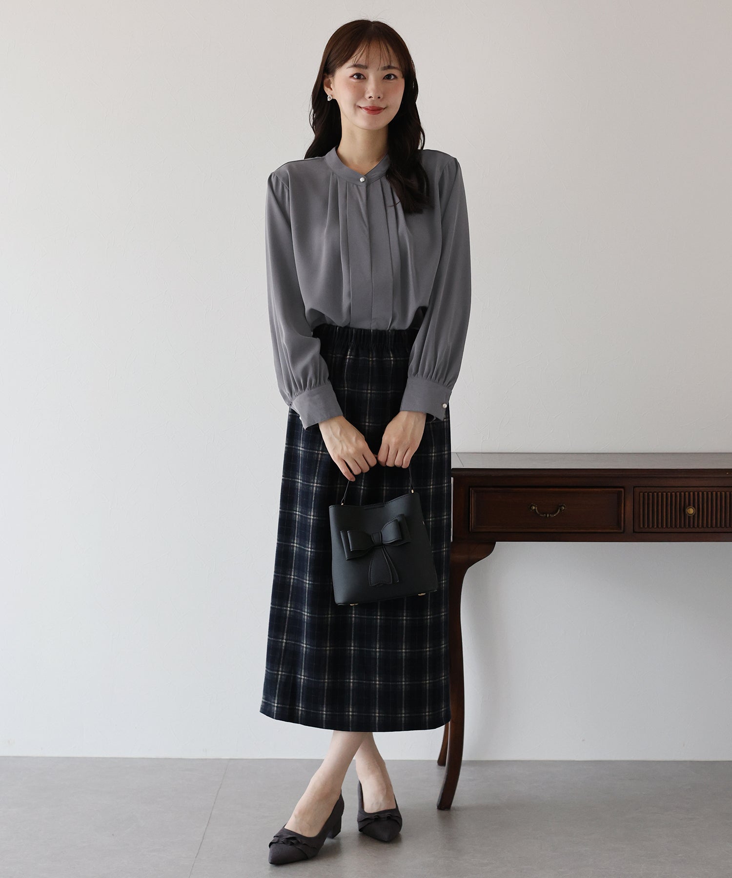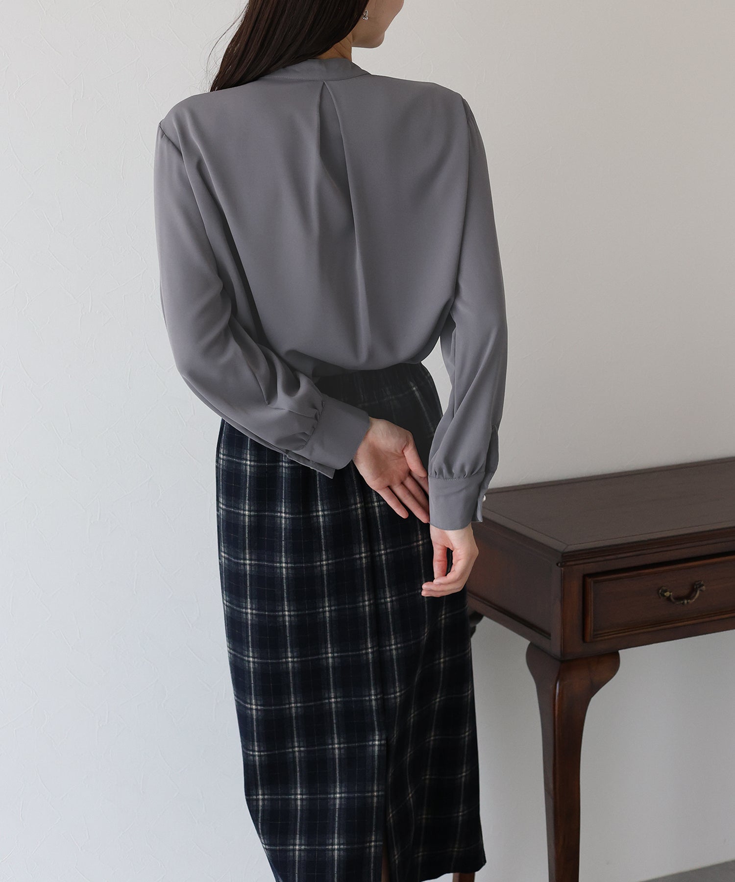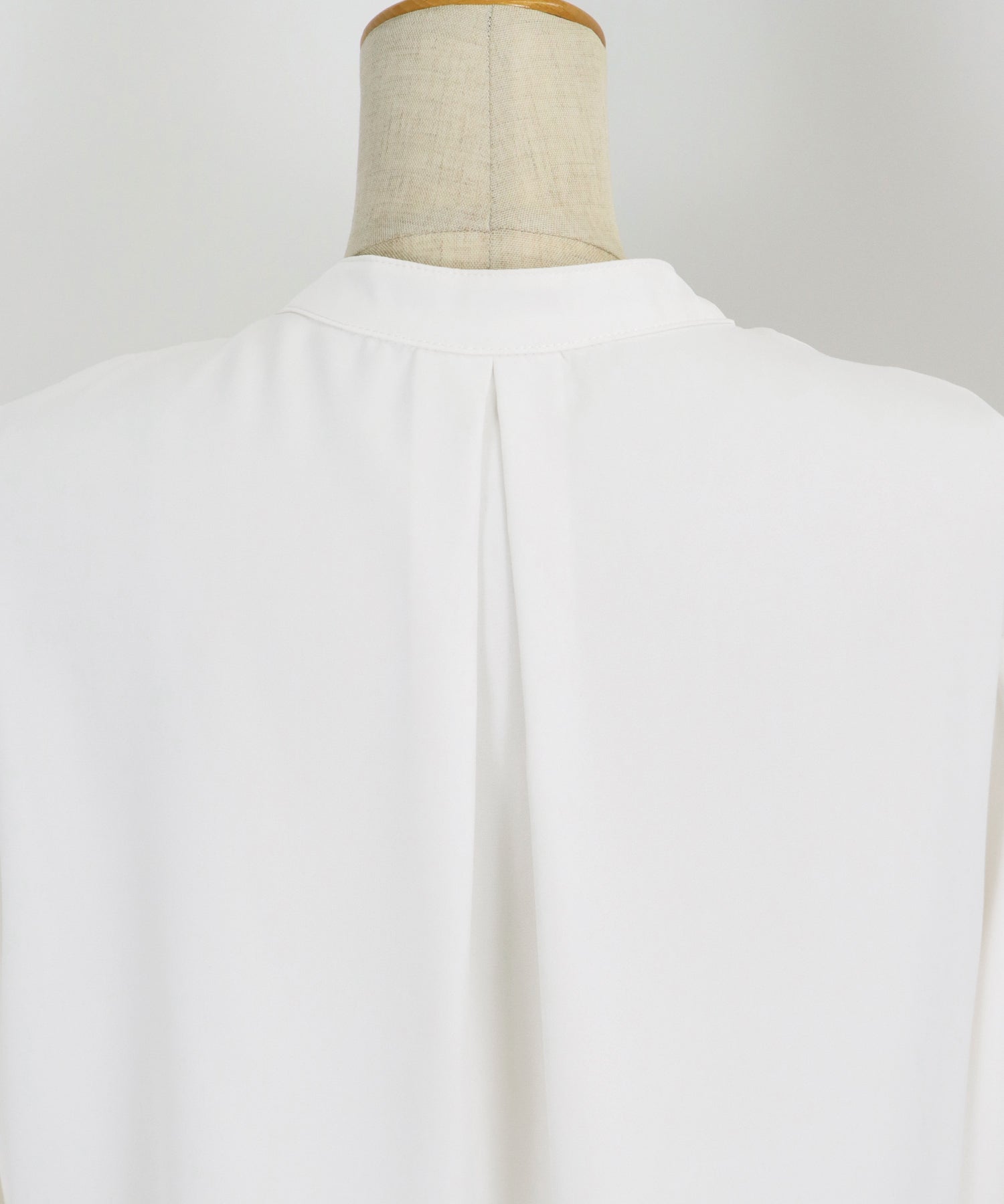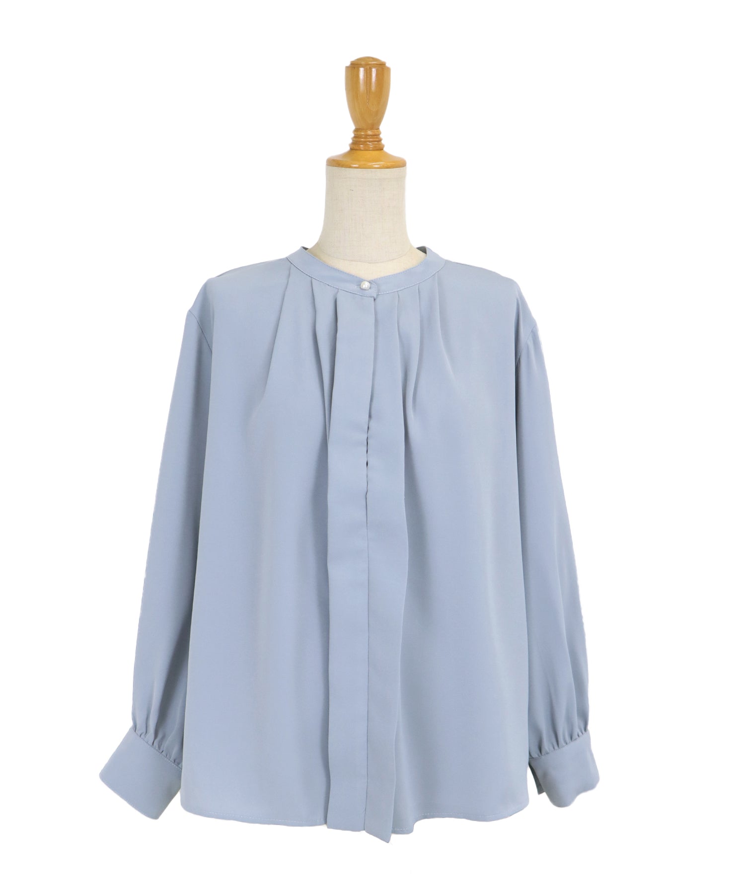 フロント部分のタックやネックと袖口にパールボタンをあしらい、上品なポイントを加えました。