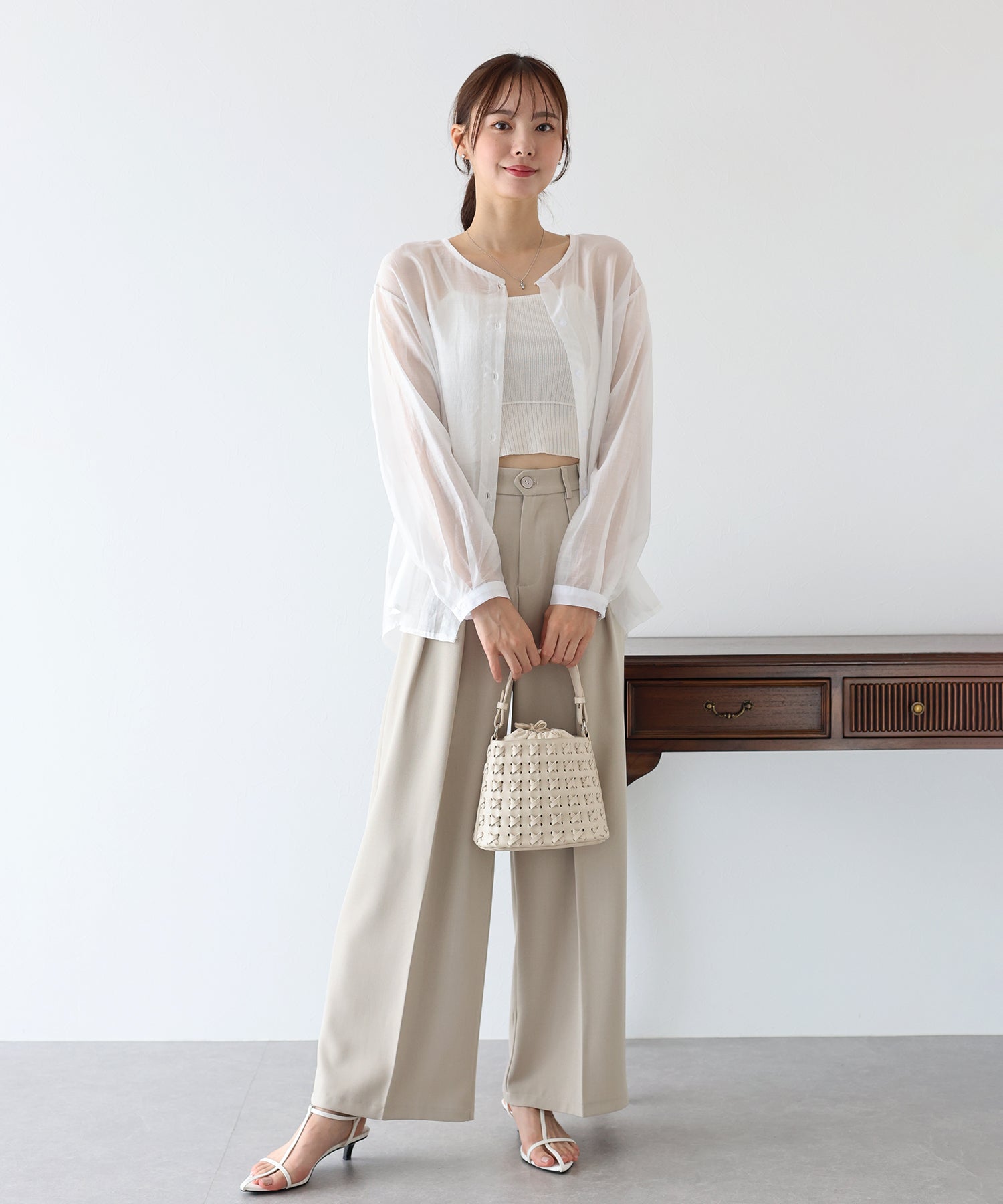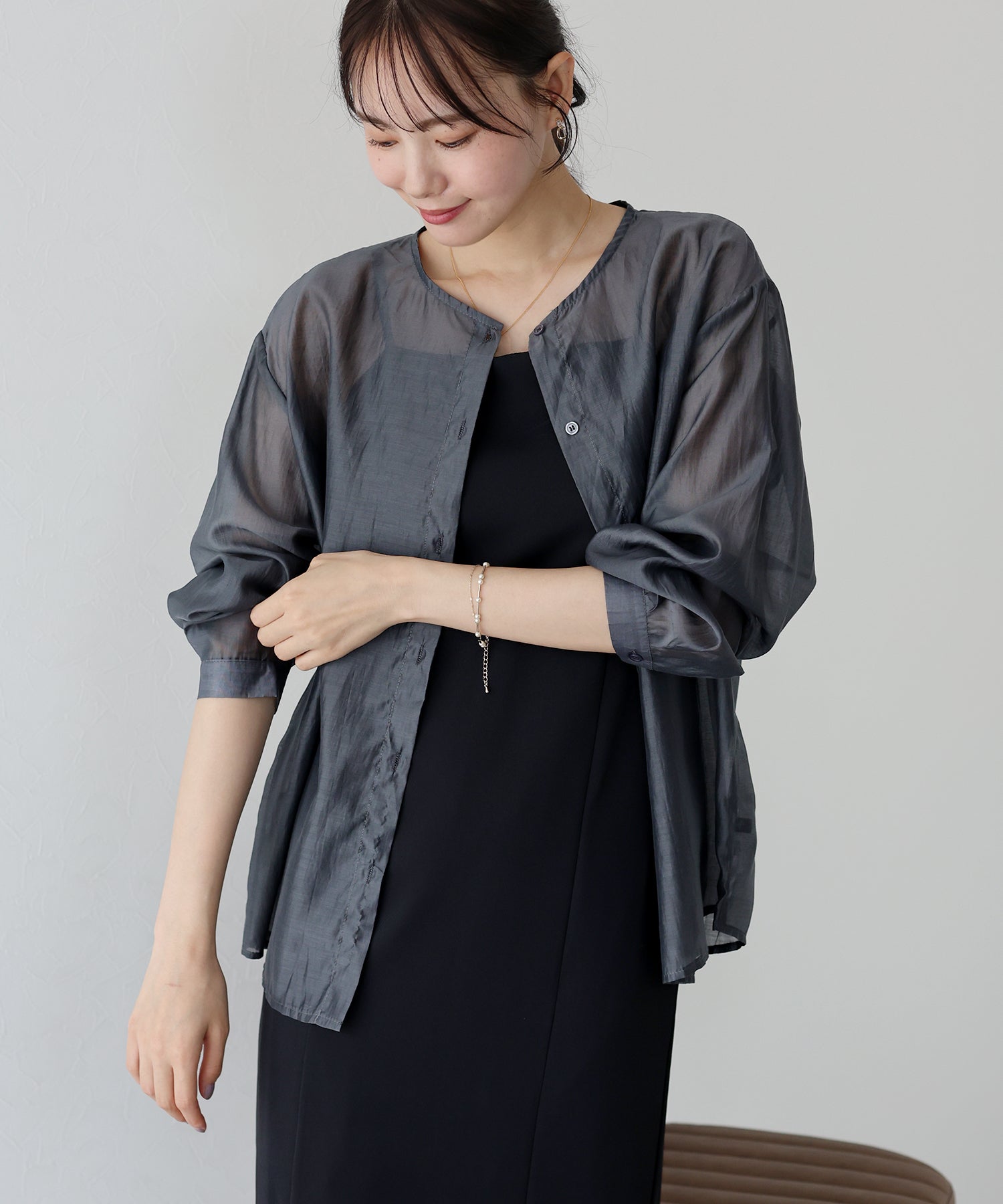 着回し力の高い洗練されたデザインのシアーシャツ。スラックスでキレイめにまとめても、タイトスカートで女性らしく着こなすのもおすすめです。