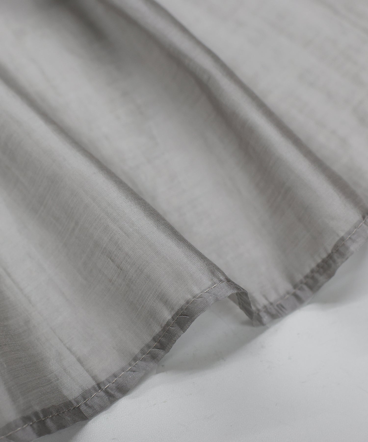 シアー素材特有の透け感で軽やかな印象を演出し、バックラインのギャザーでシンプル過ぎないポイントをプラス。