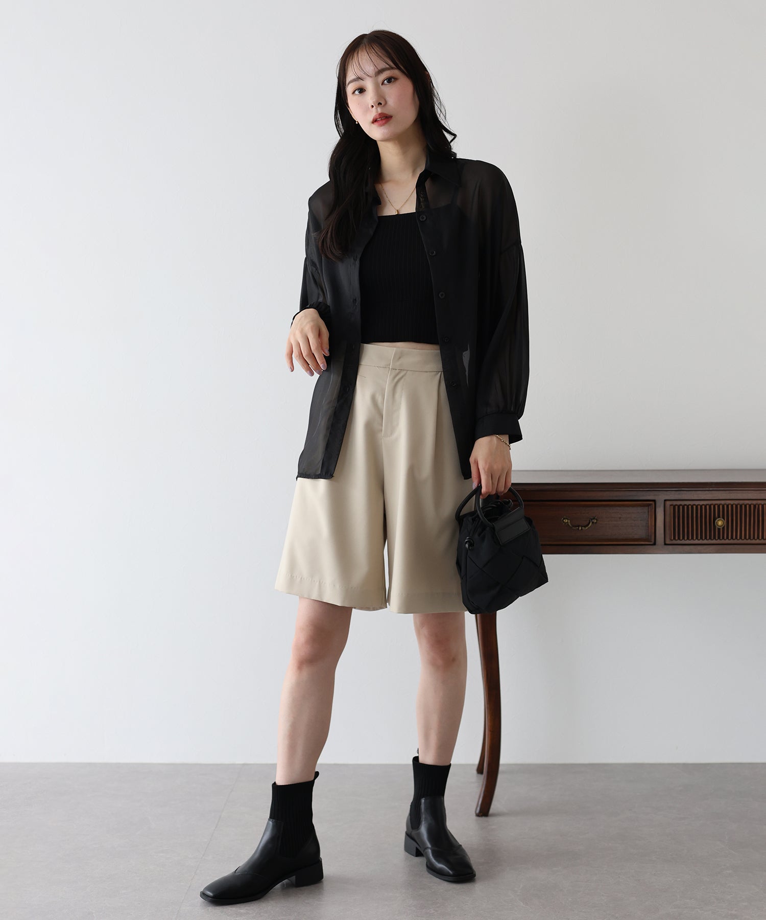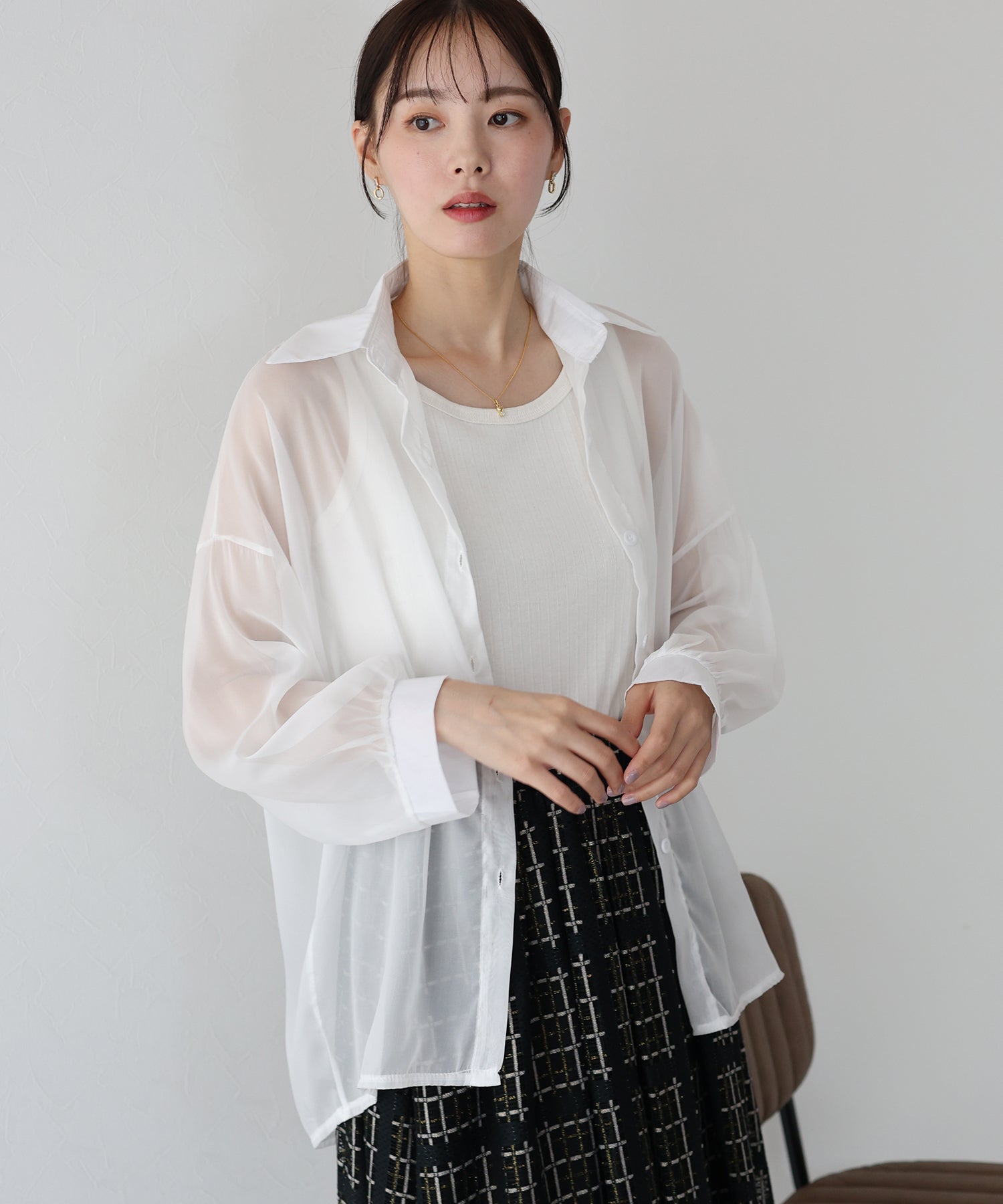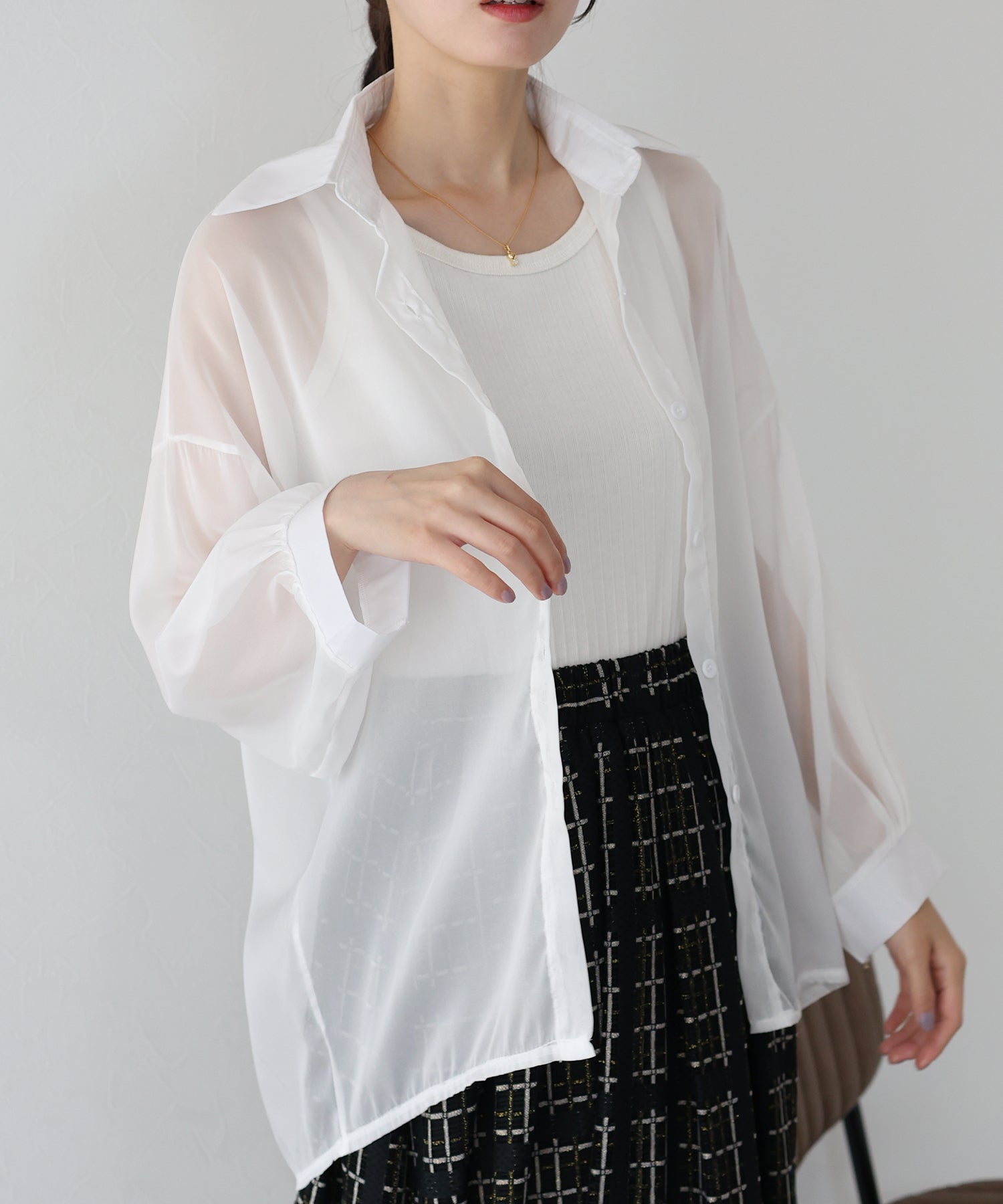 透け感が上品なシアー素材 厚さ:薄手 透け感:あり 伸縮性:なし |