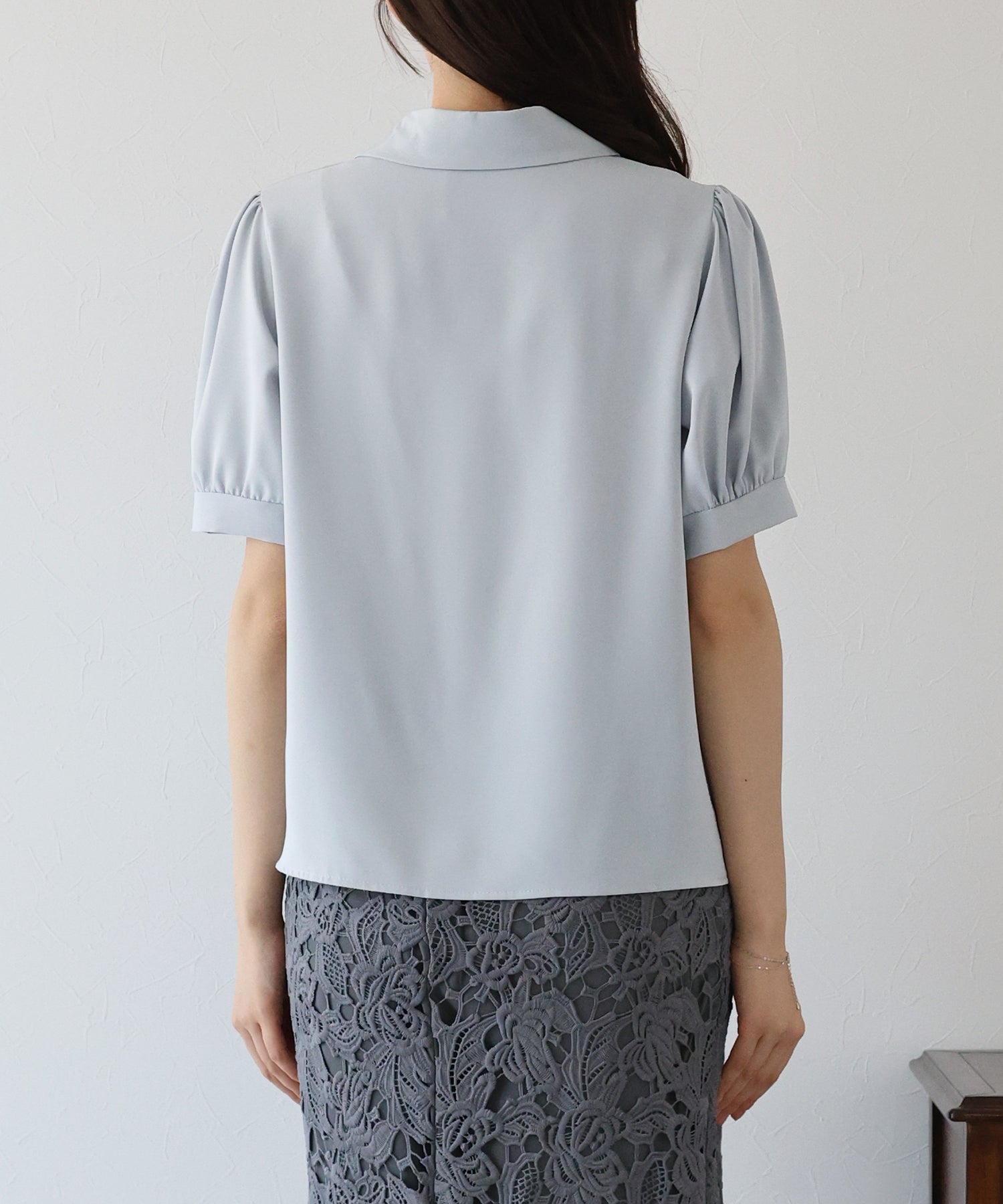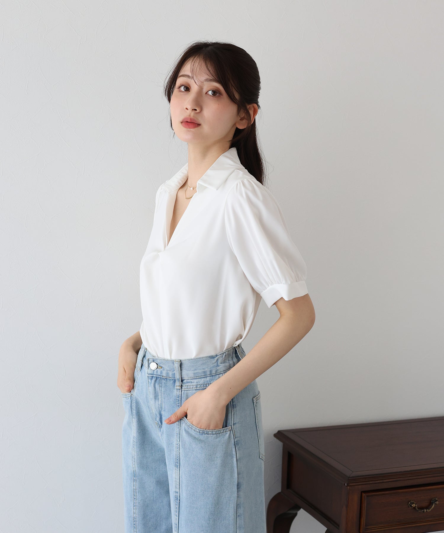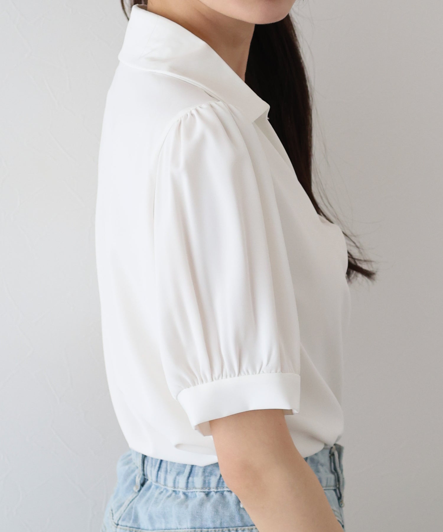 襟付きできちんと感を出し、首元が開いたデザインで大人の女性らしい抜け感を演出します。