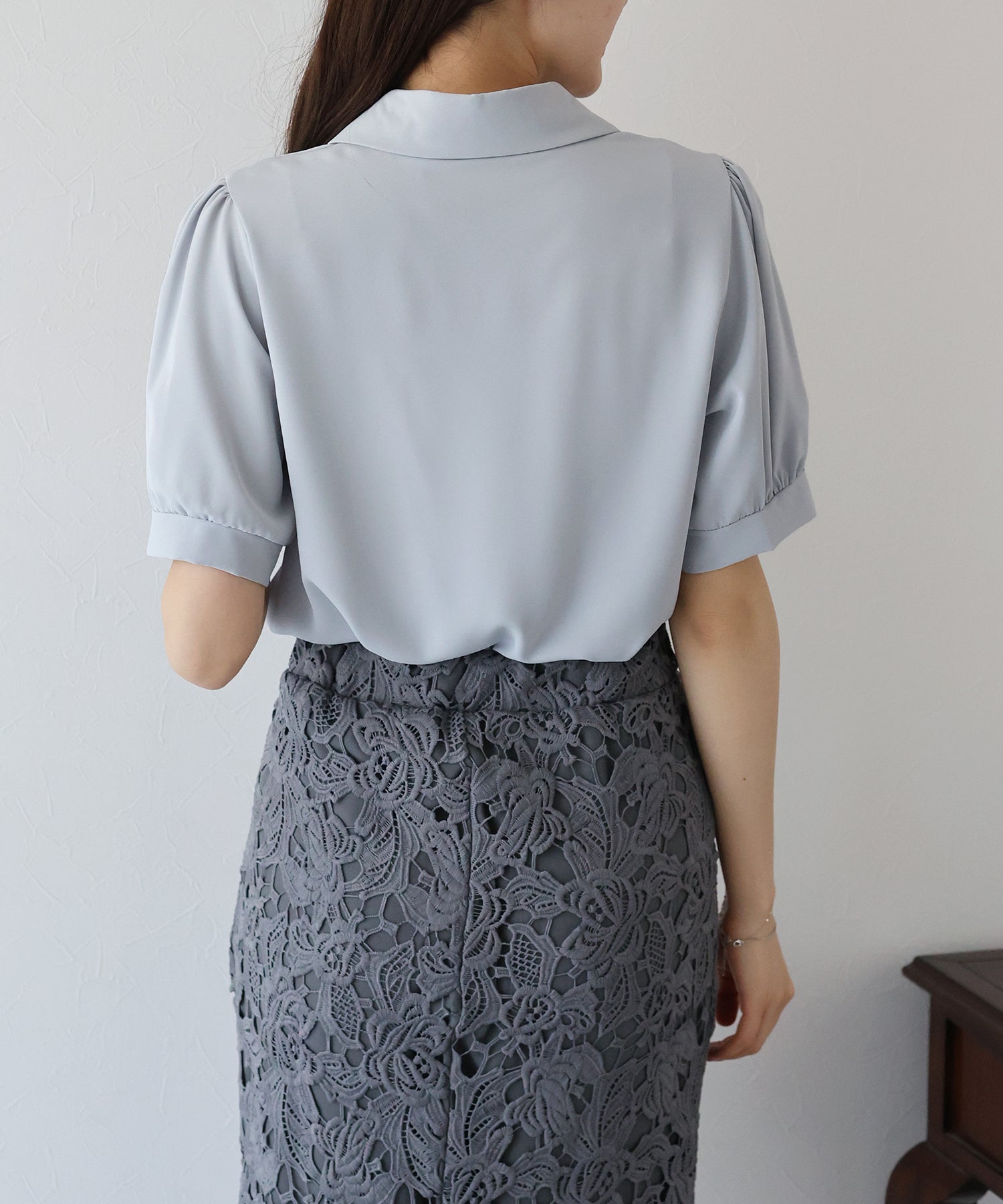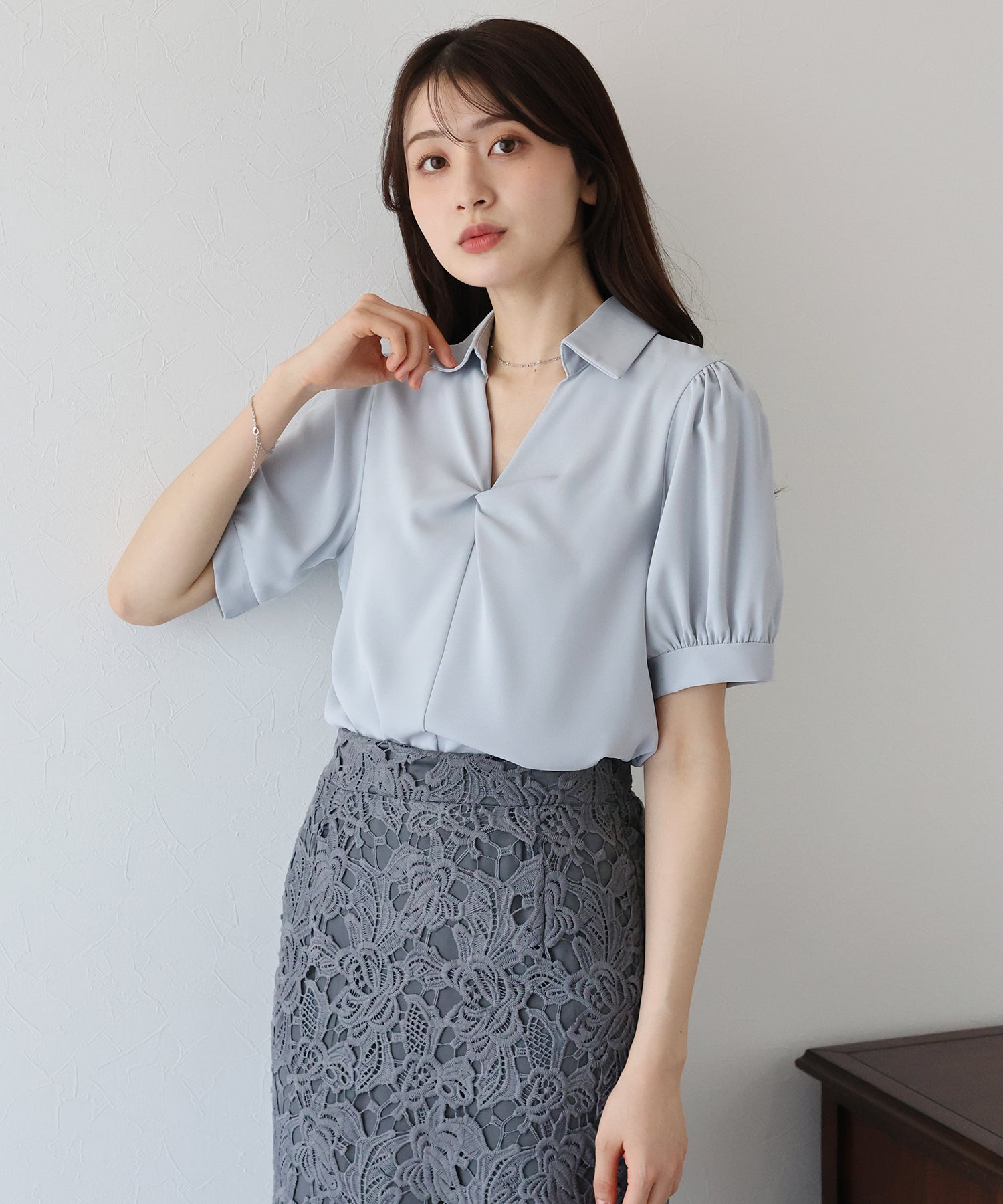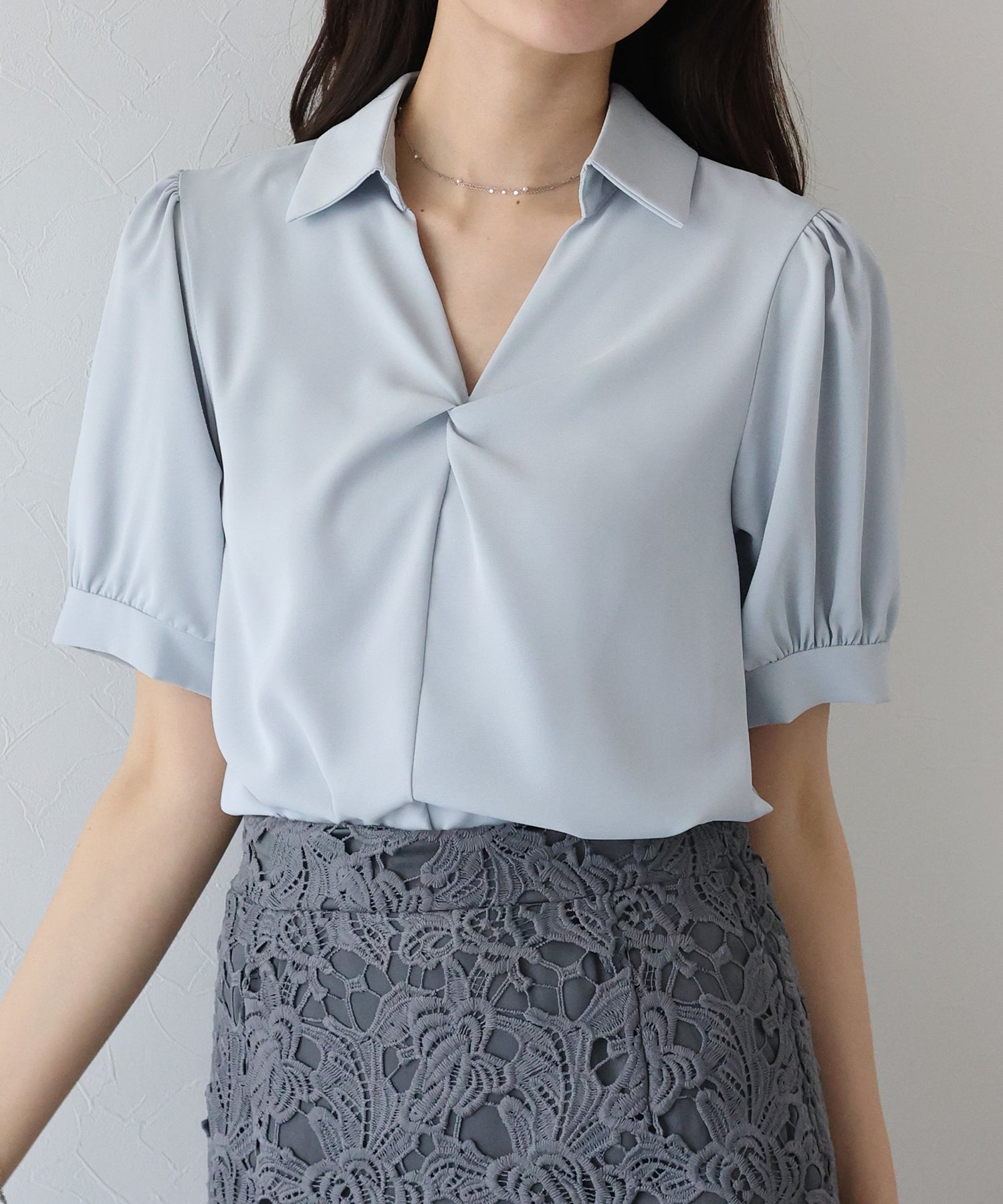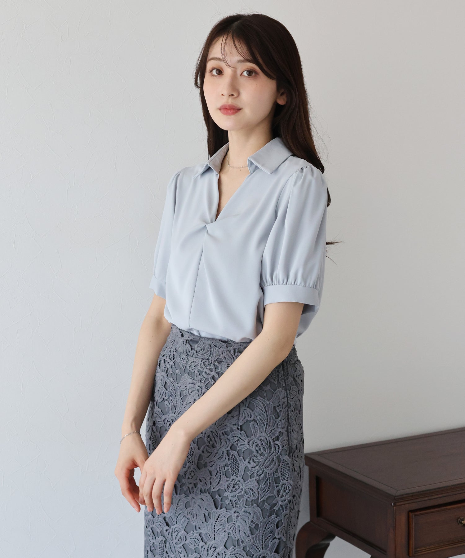 襟付きできちんと感を出し、首元が開いたデザインで大人の女性らしい抜け感を演出します。