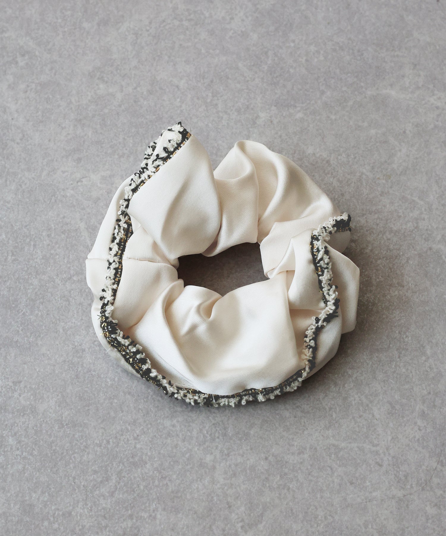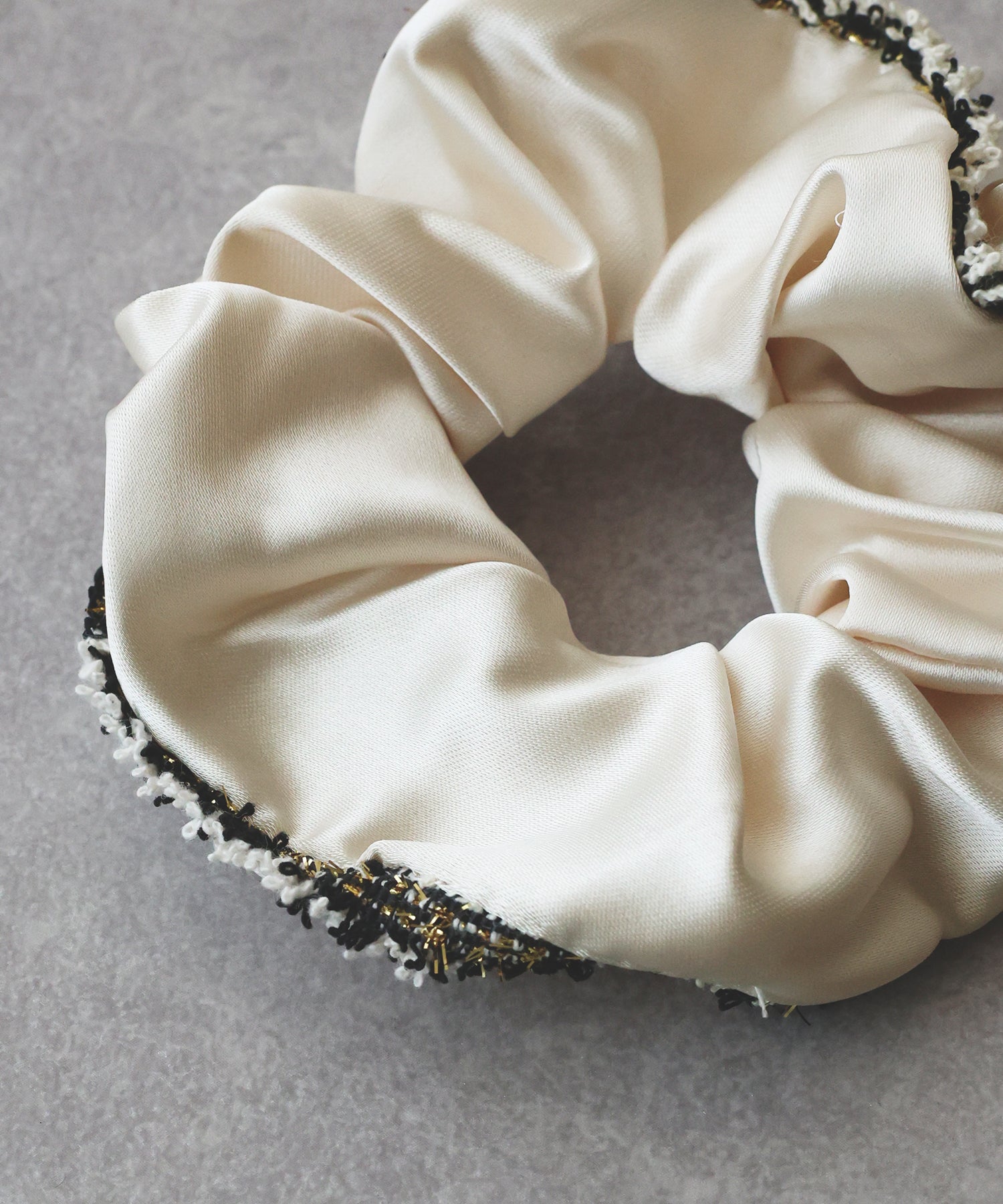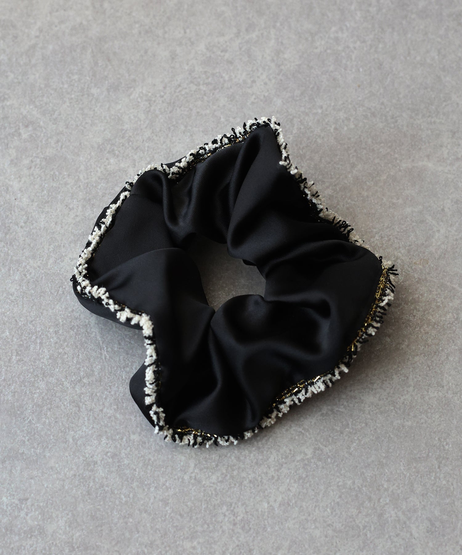 上品なサテン素材にラメ糸入りのフリンジリボンがあしらわれたシュシュ。