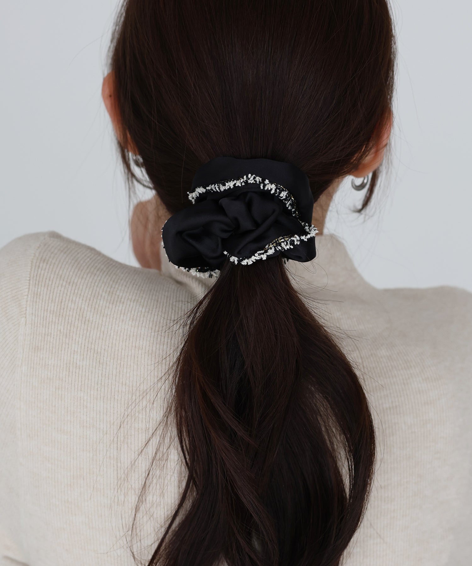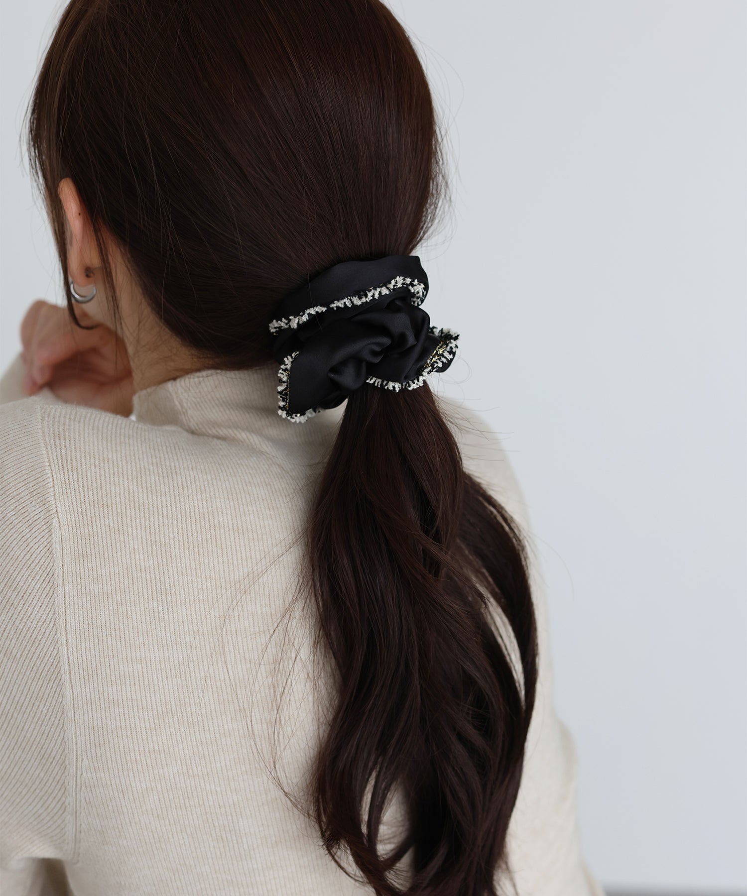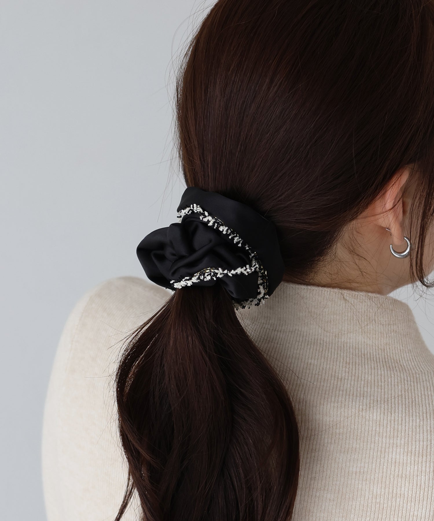 上品なサテン素材にラメ糸入りのフリンジリボンがあしらわれたシュシュ。