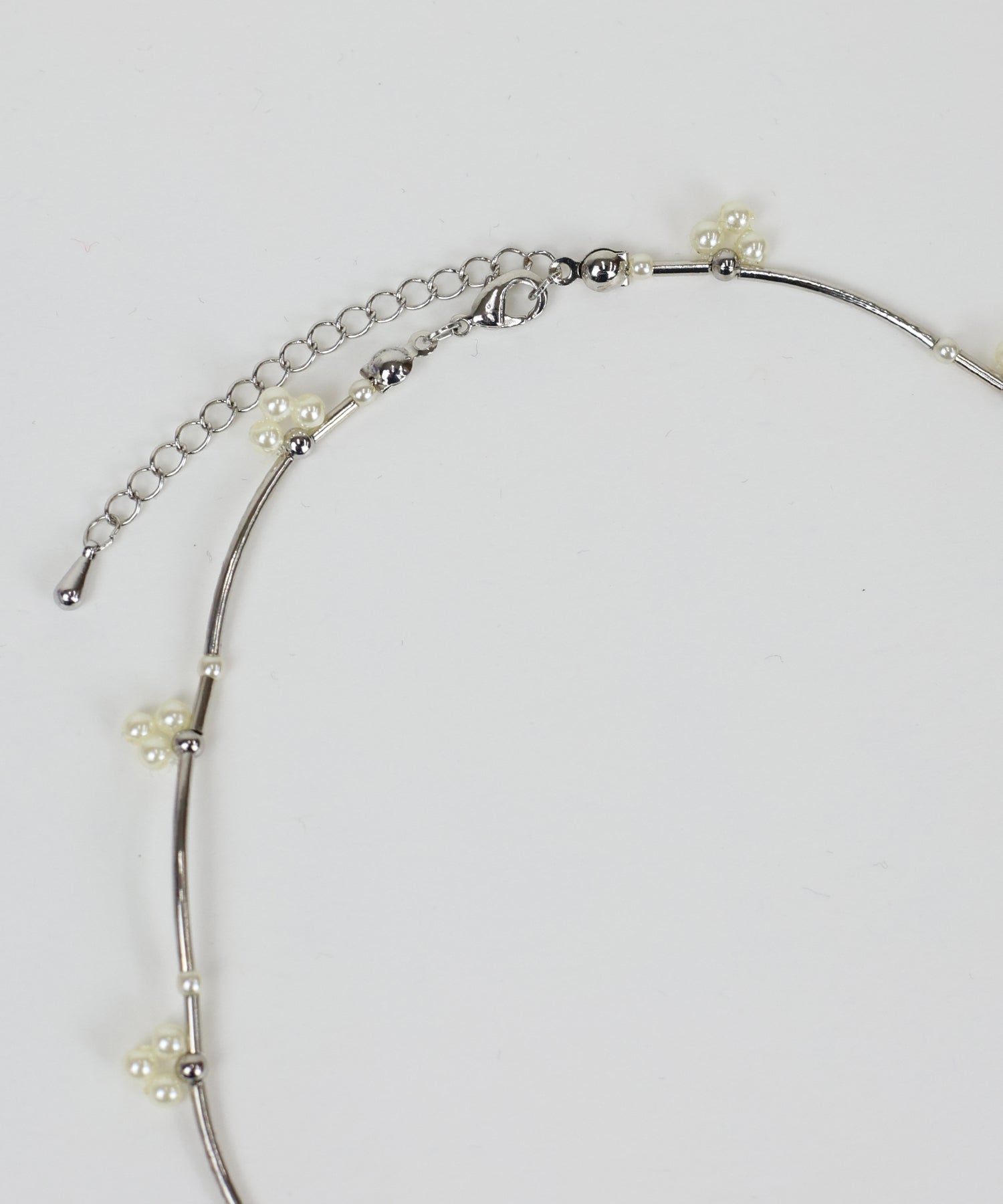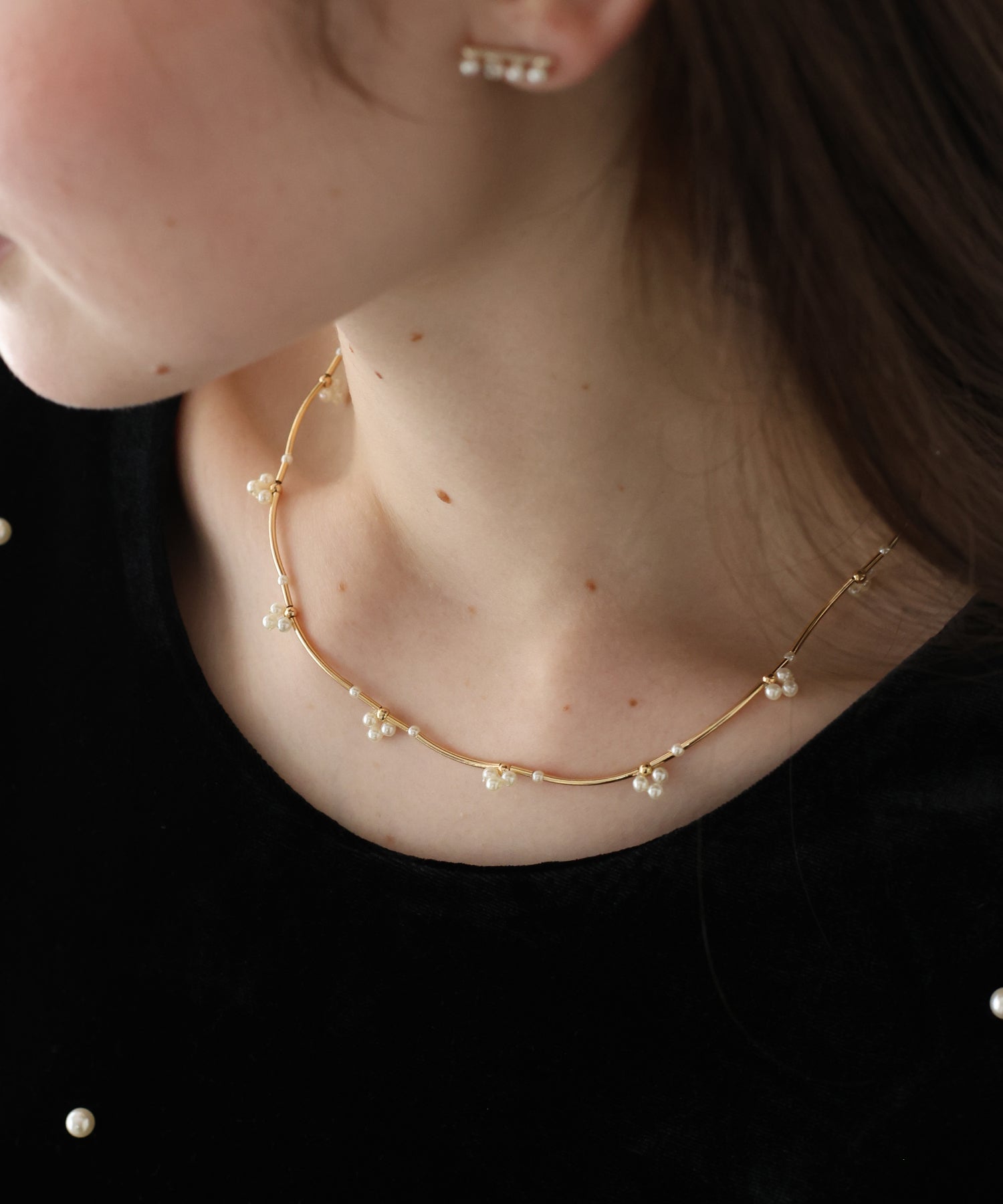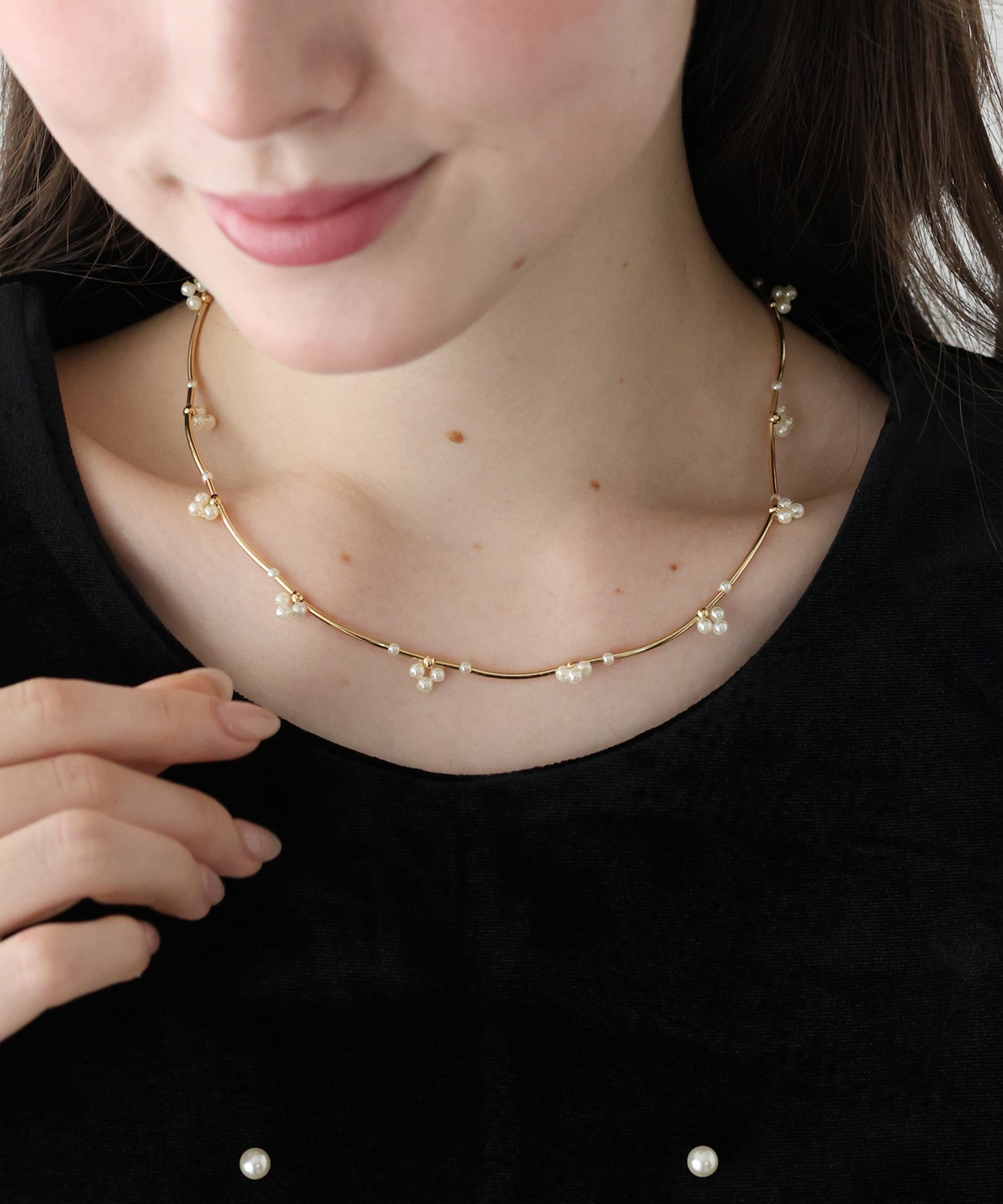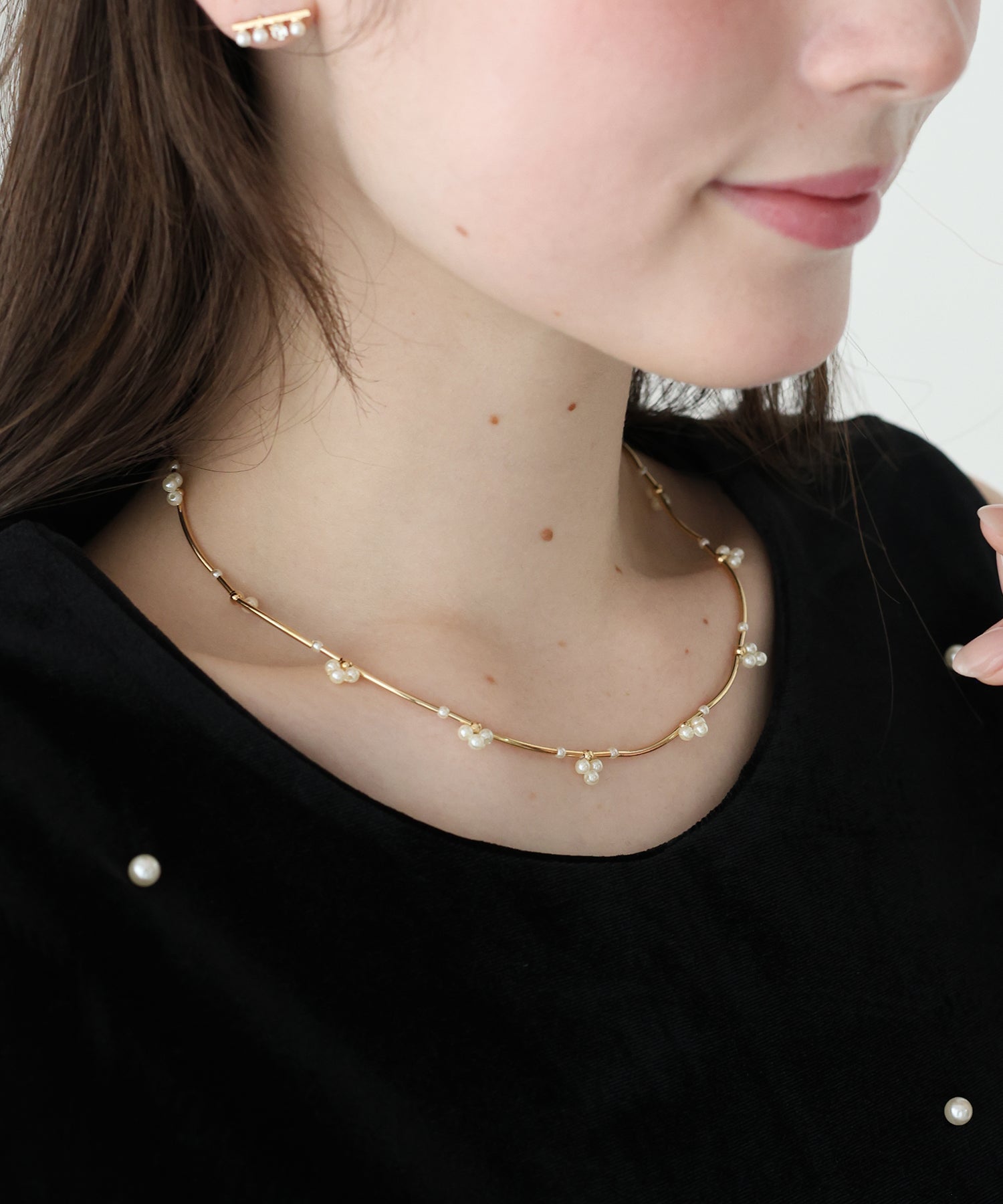 首元に沿うメタルバーにお花のように3つ集まったパールが等間隔であしらわれ、可愛らしい印象に。