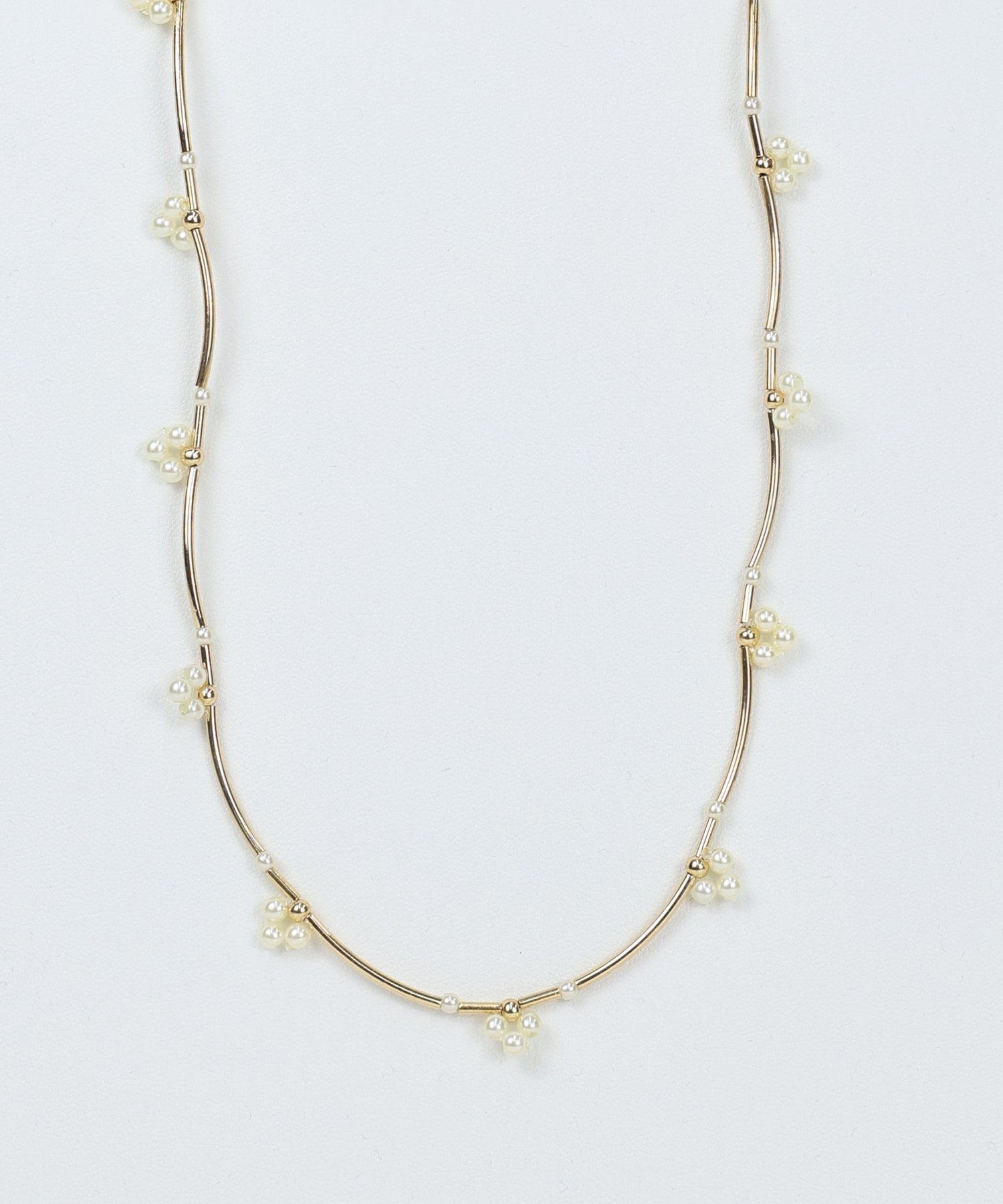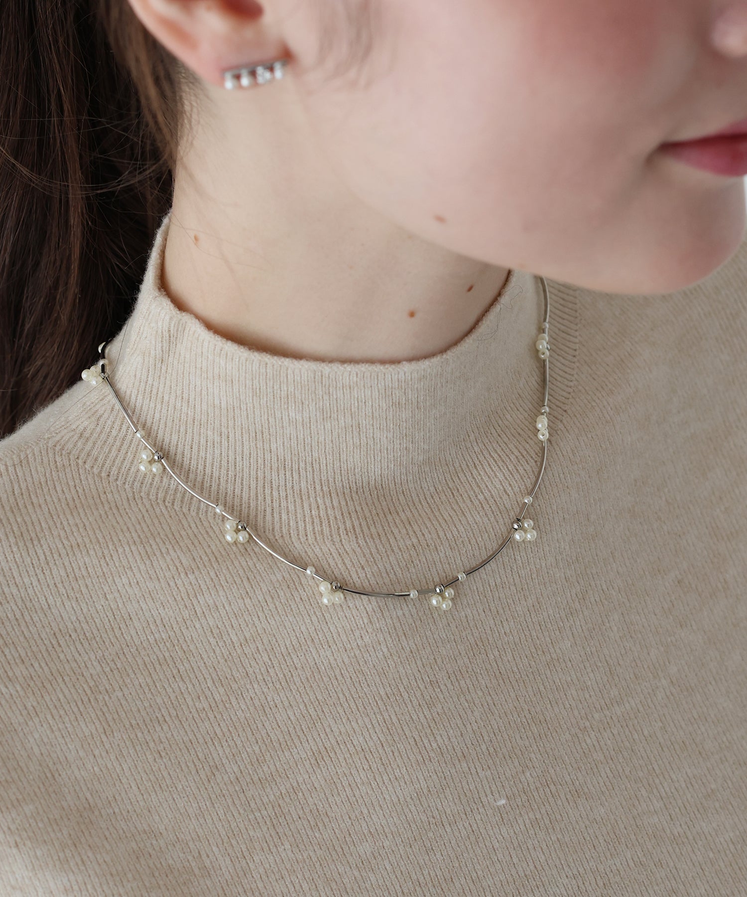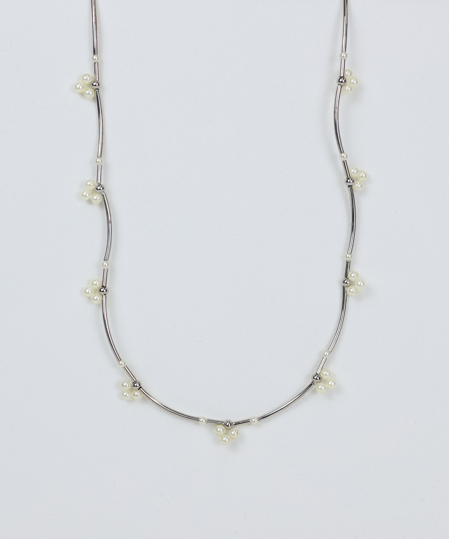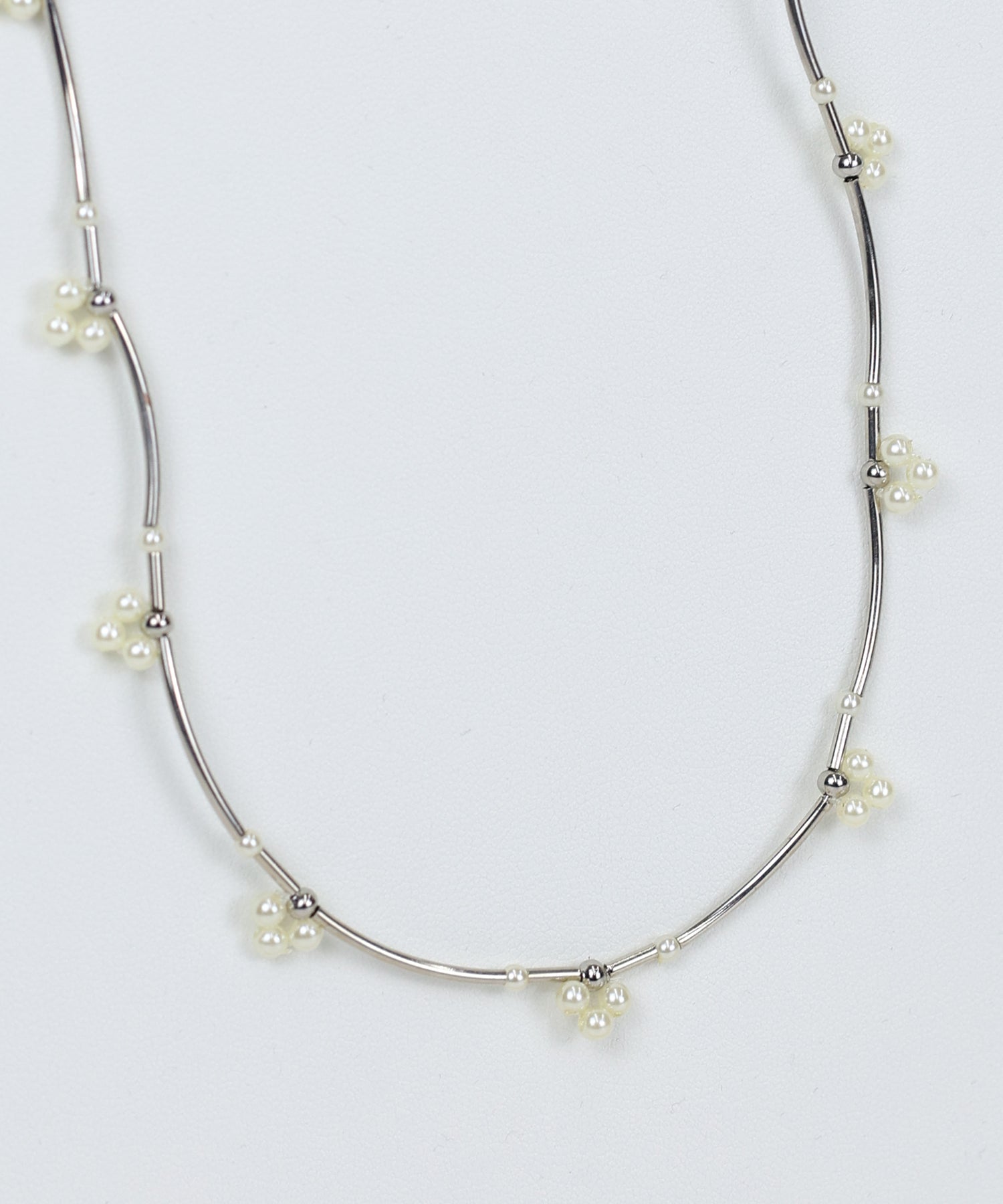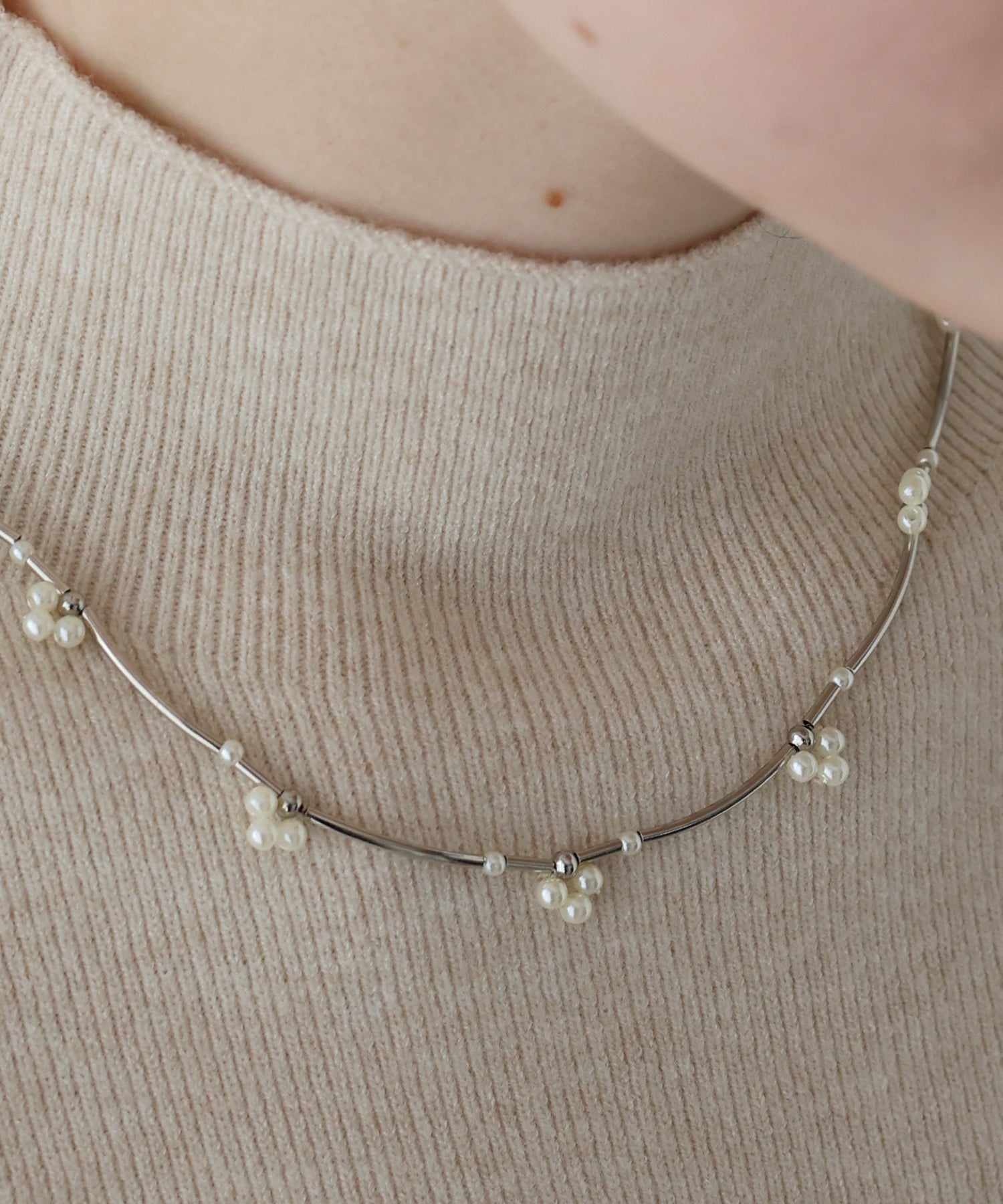 首元に沿うメタルバーにお花のように3つ集まったパールが等間隔であしらわれ、可愛らしい印象に。