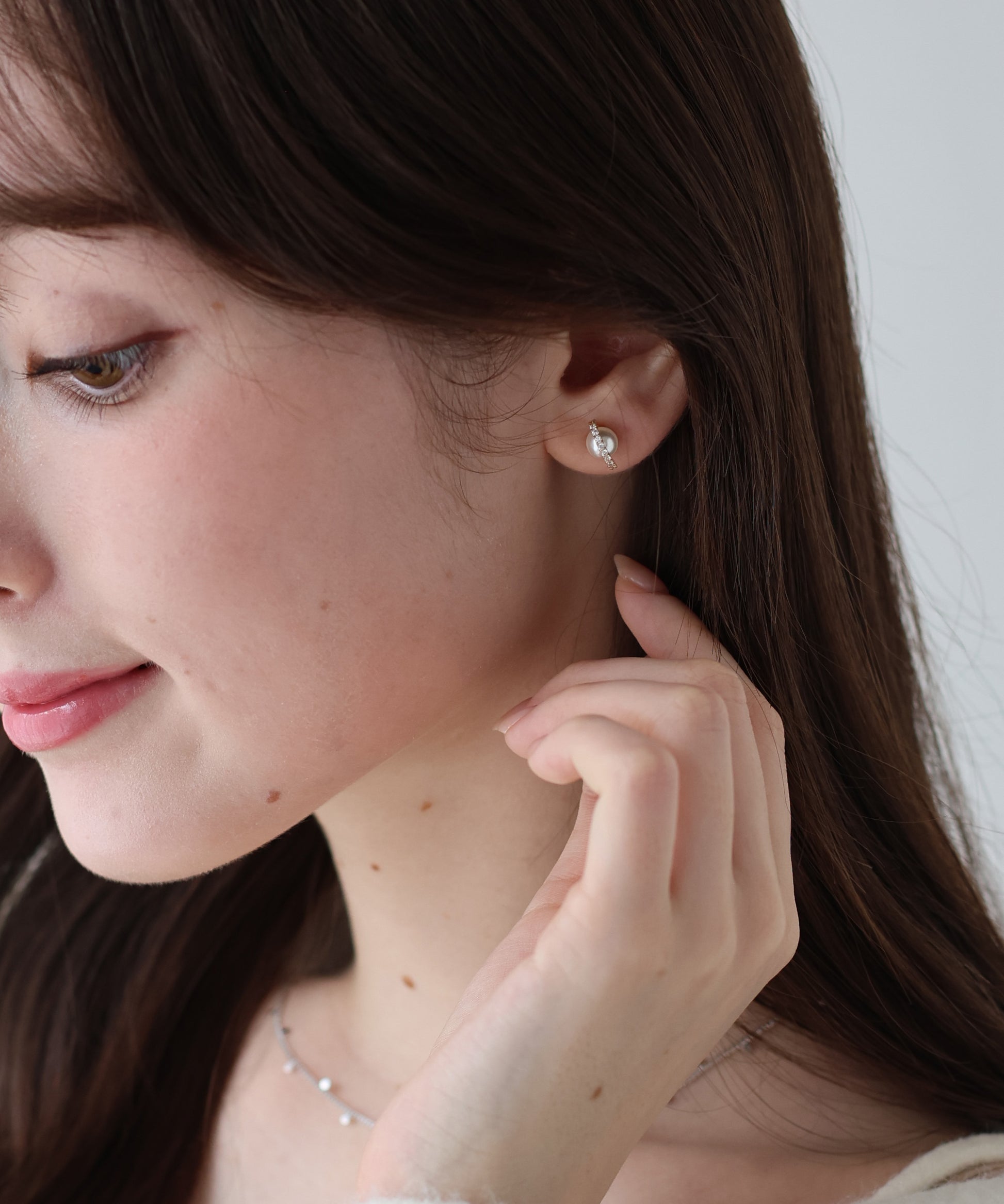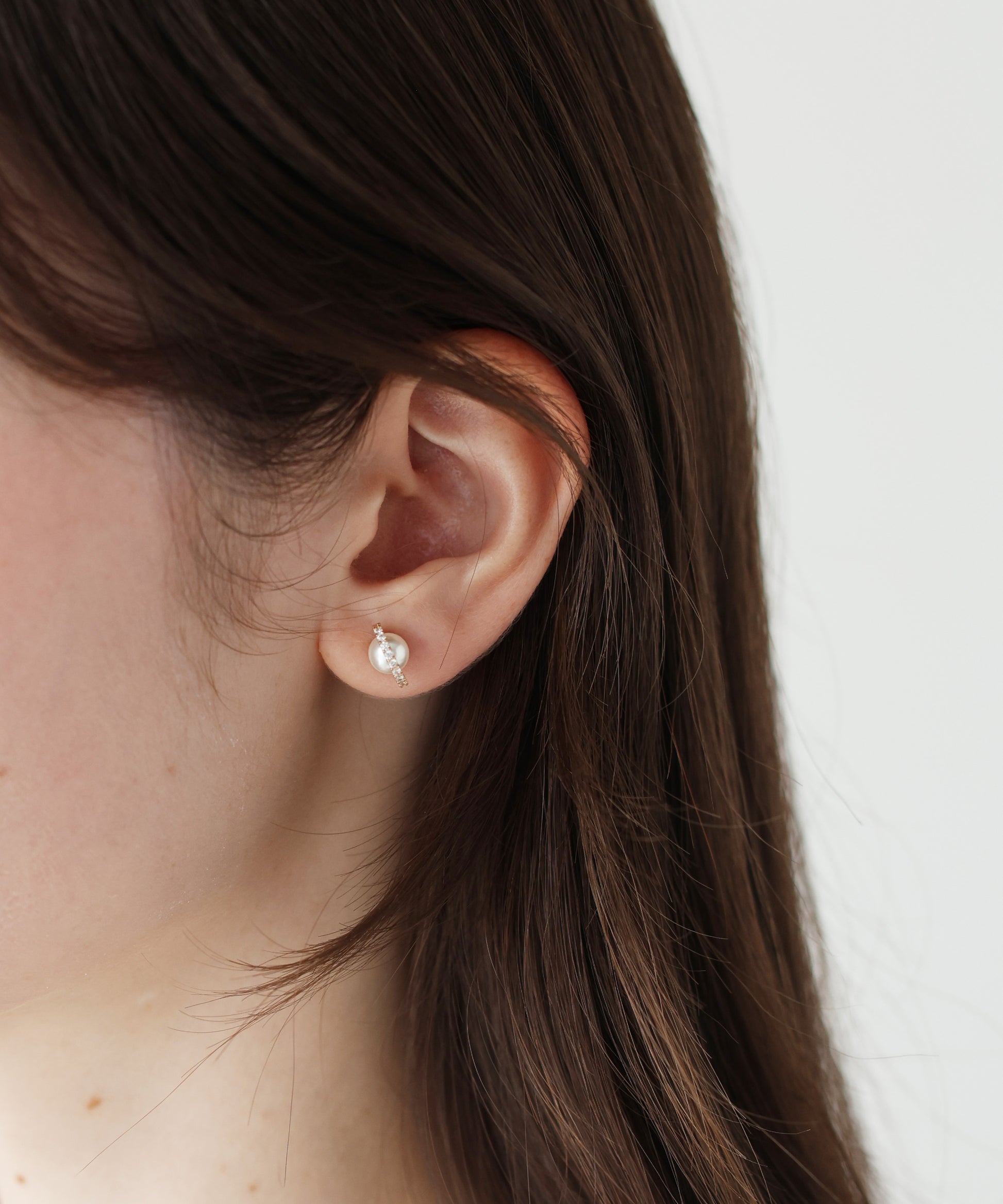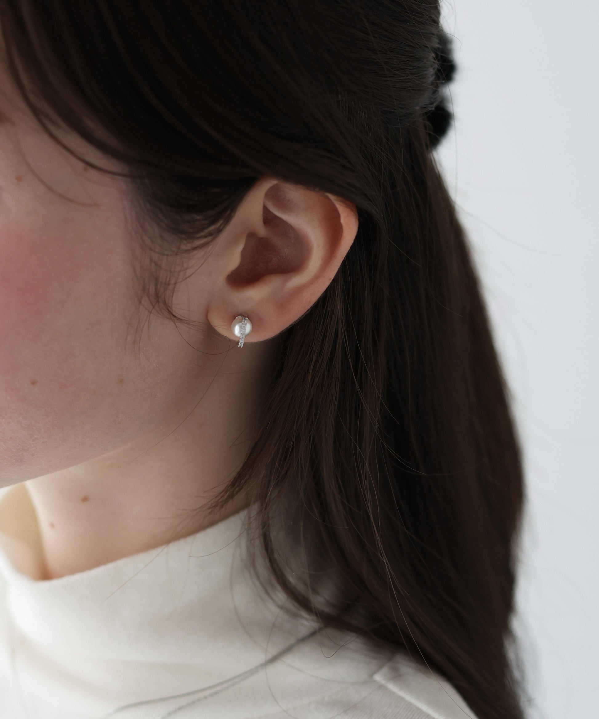 パールに繊細なビジューのついたフープをあしらったミニマルなピアス。