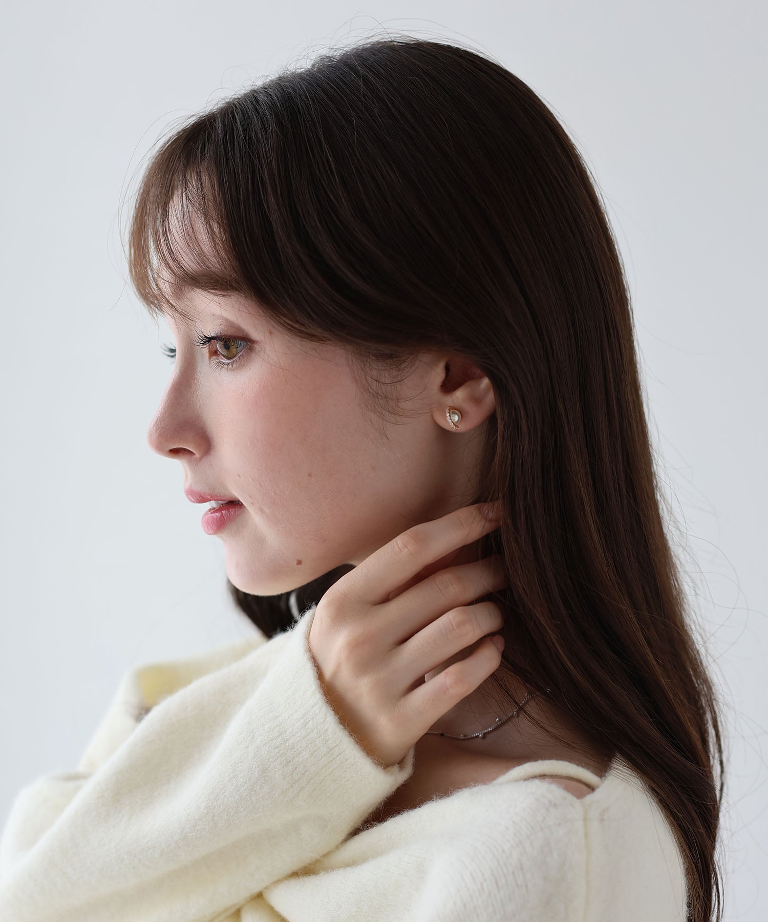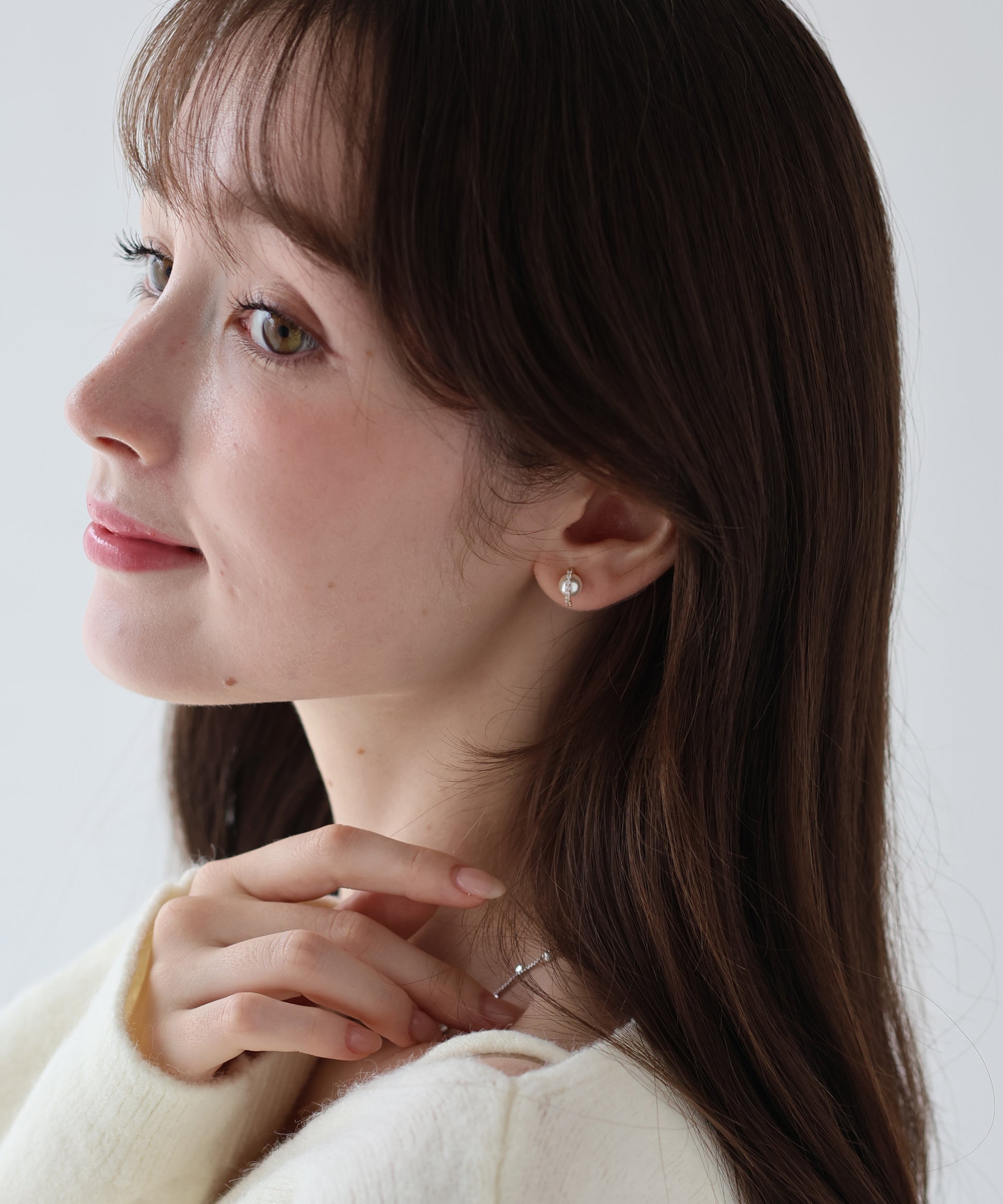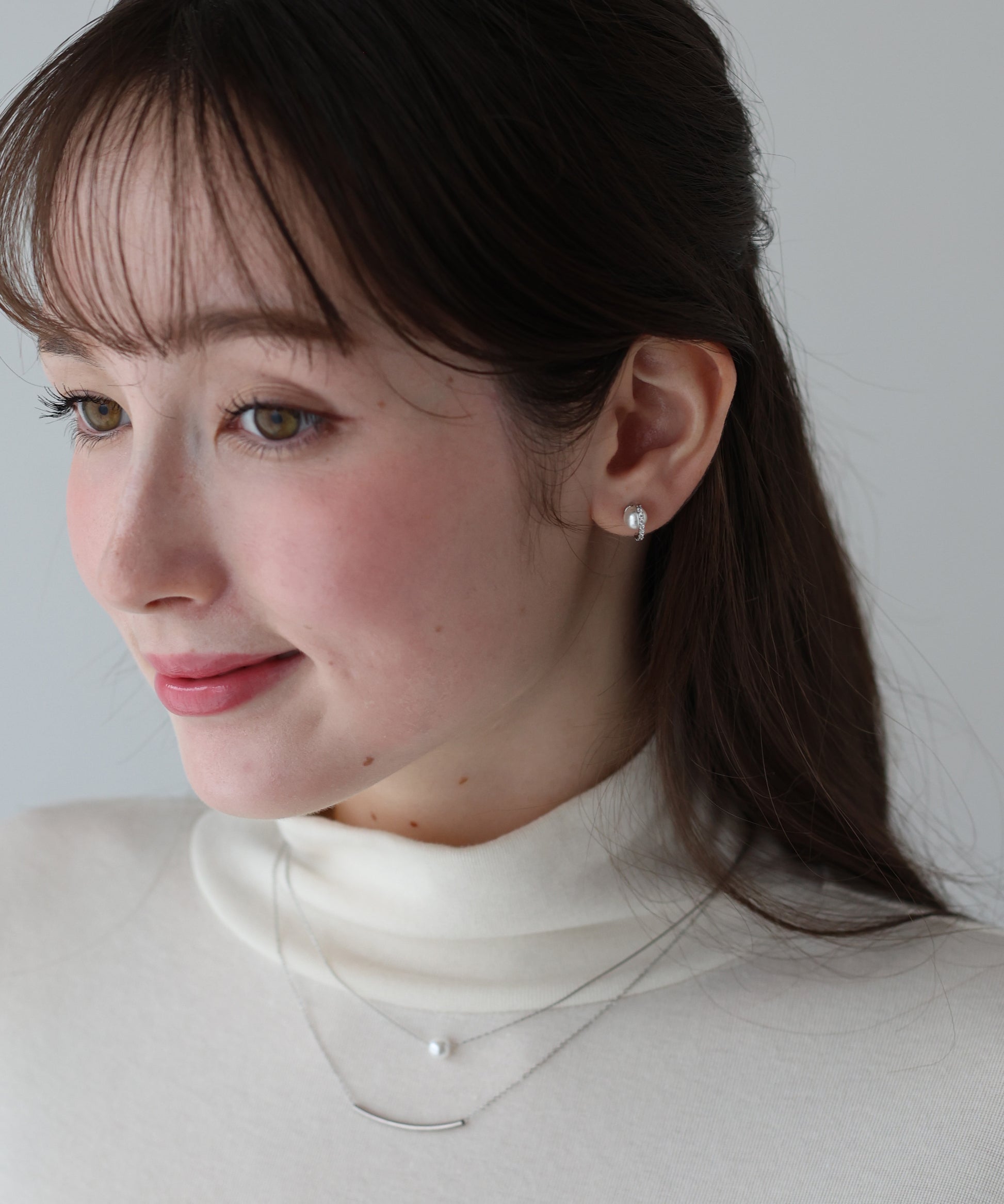 パールに繊細なビジューのついたフープをあしらったミニマルなピアス。