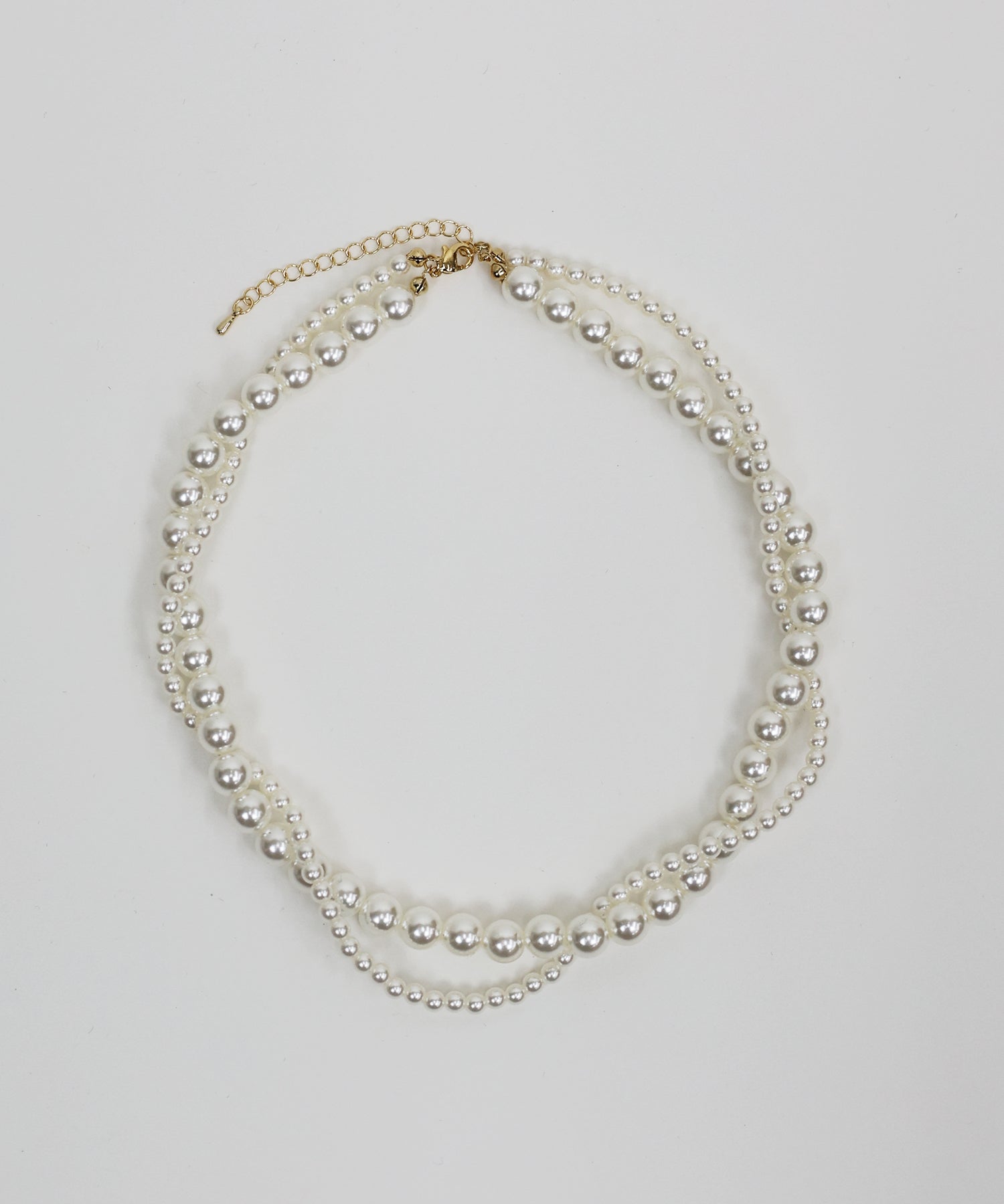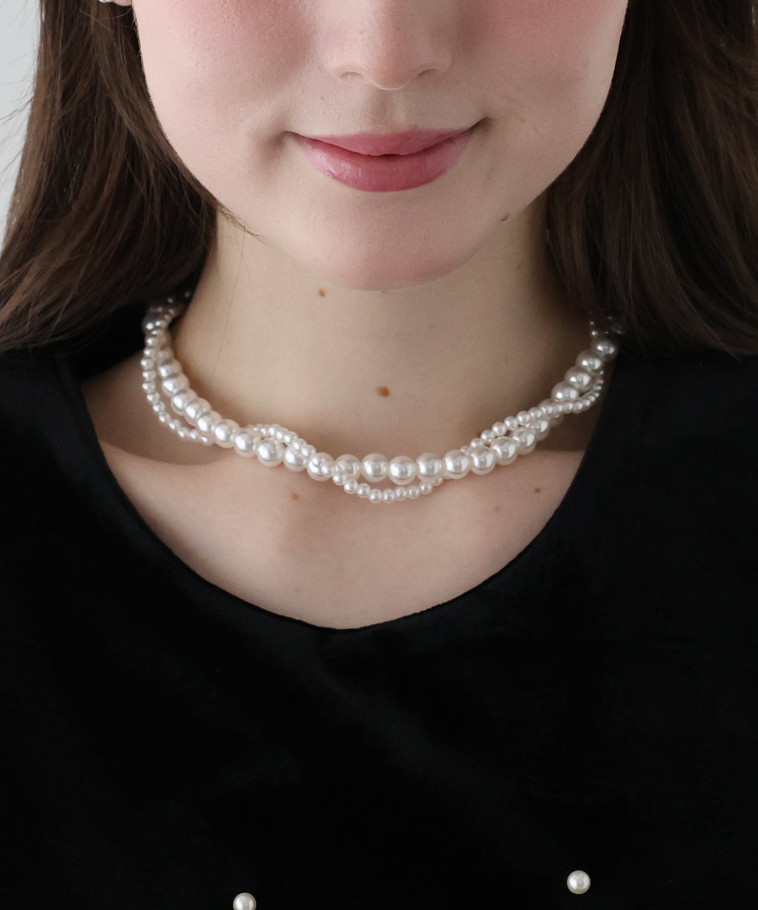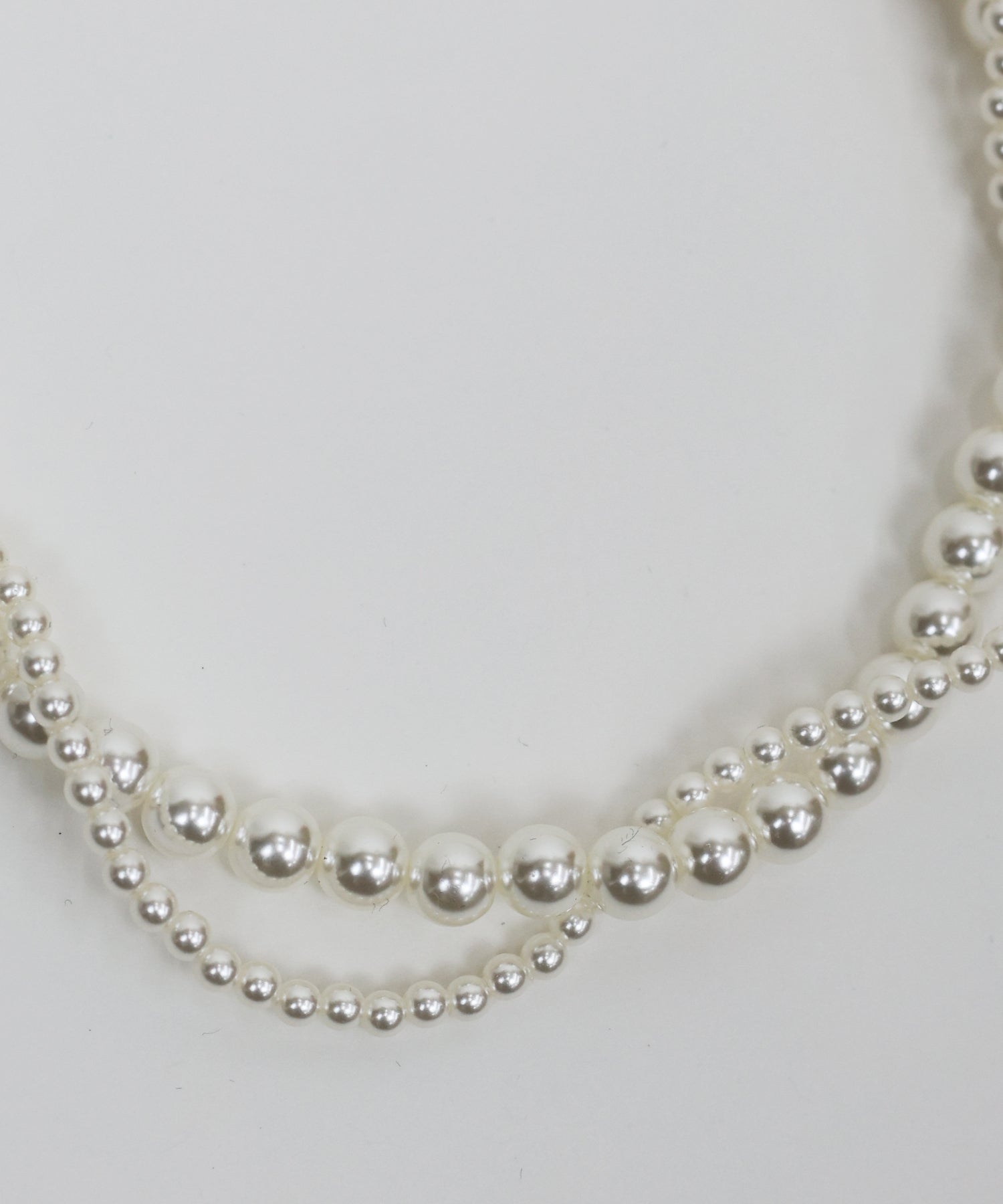 大きさの異なるパールをらせん状に編み込んだ2連デザインのパールネックレス。