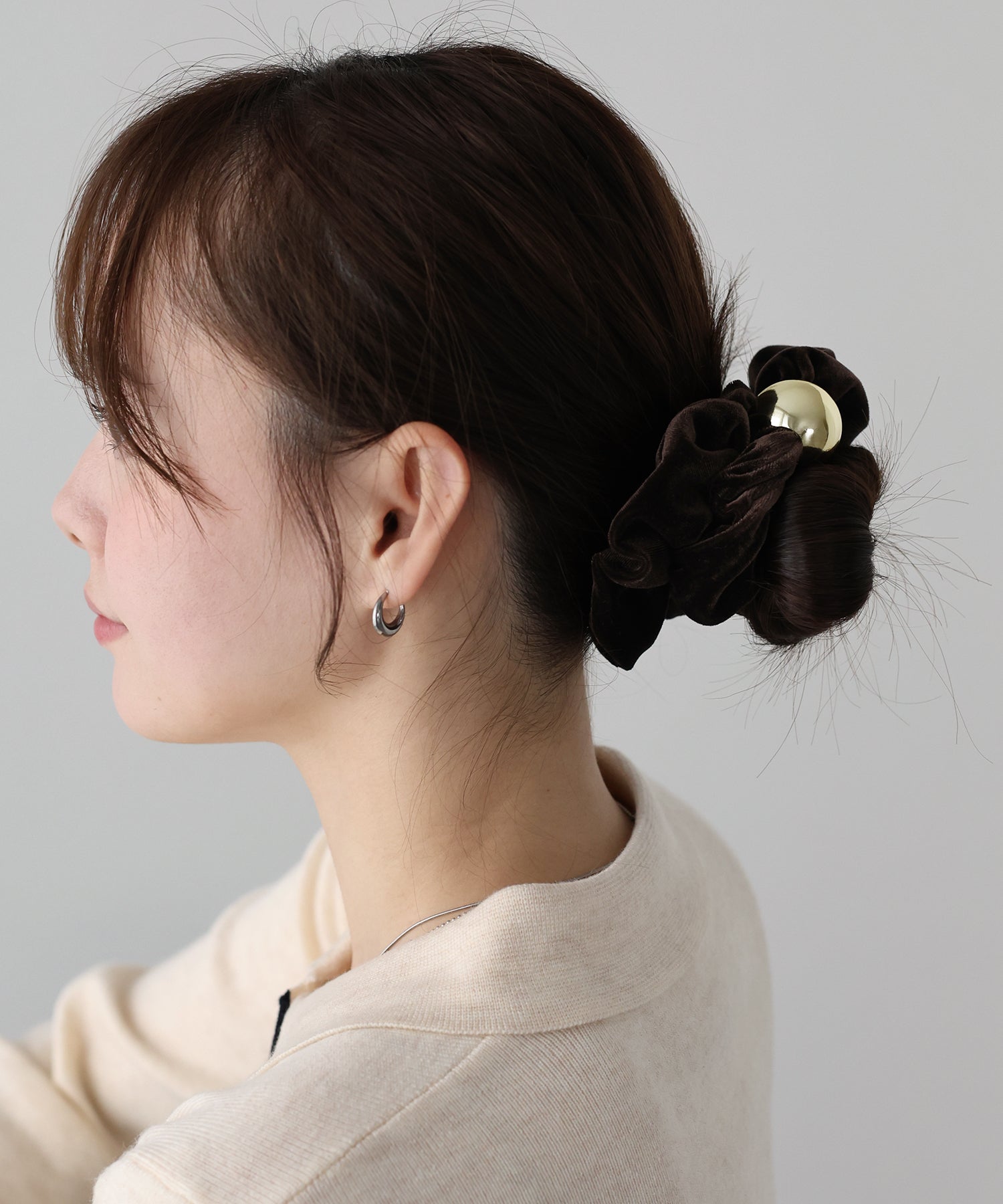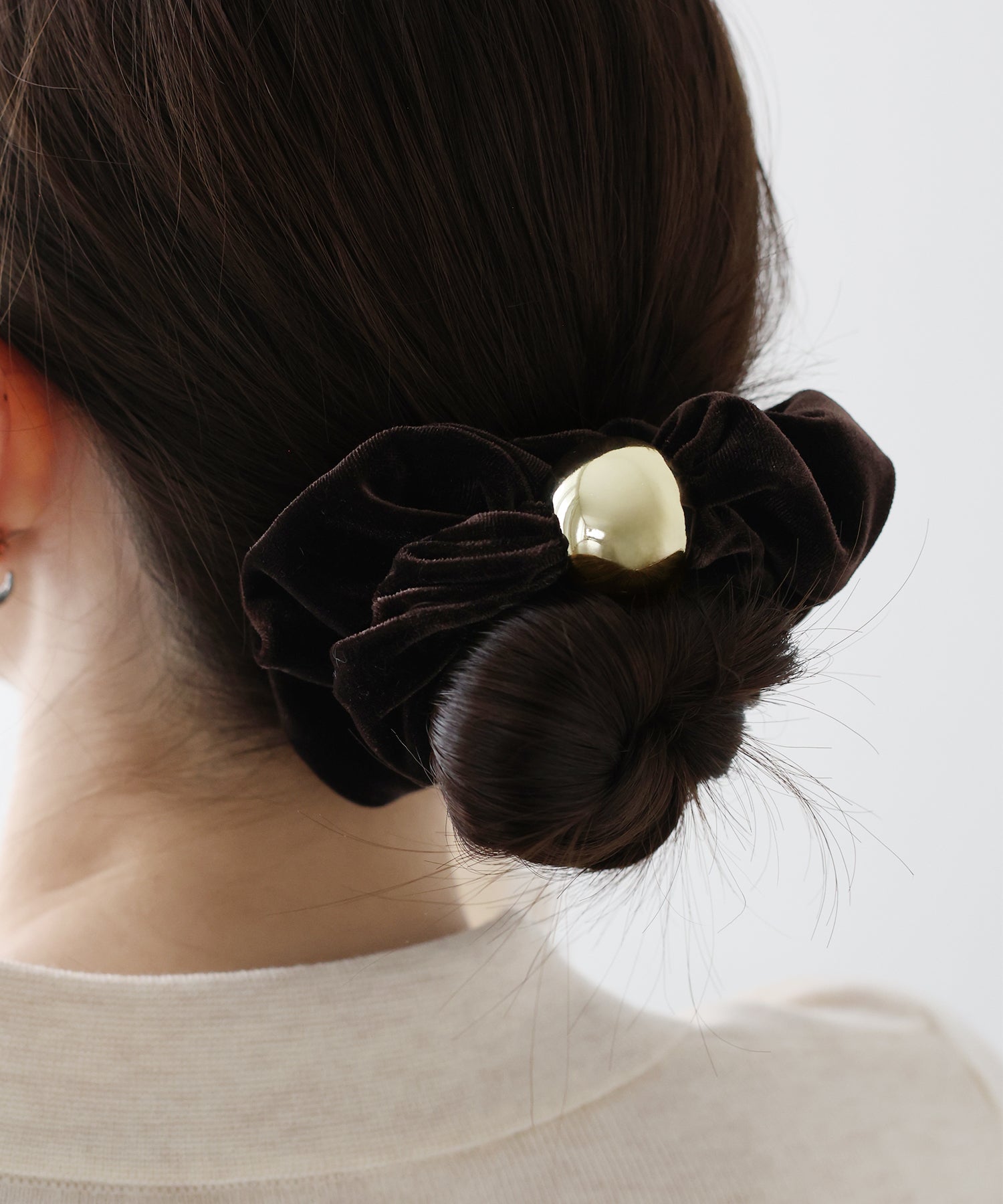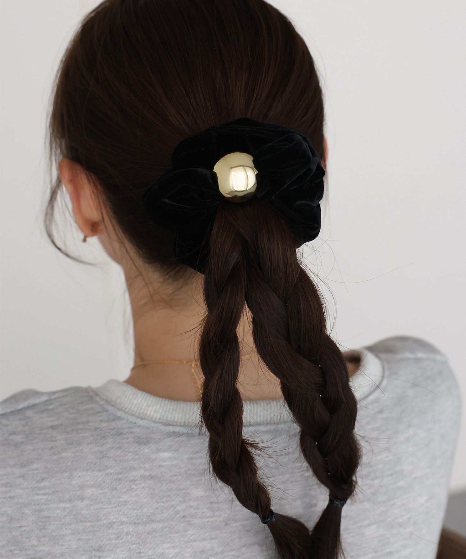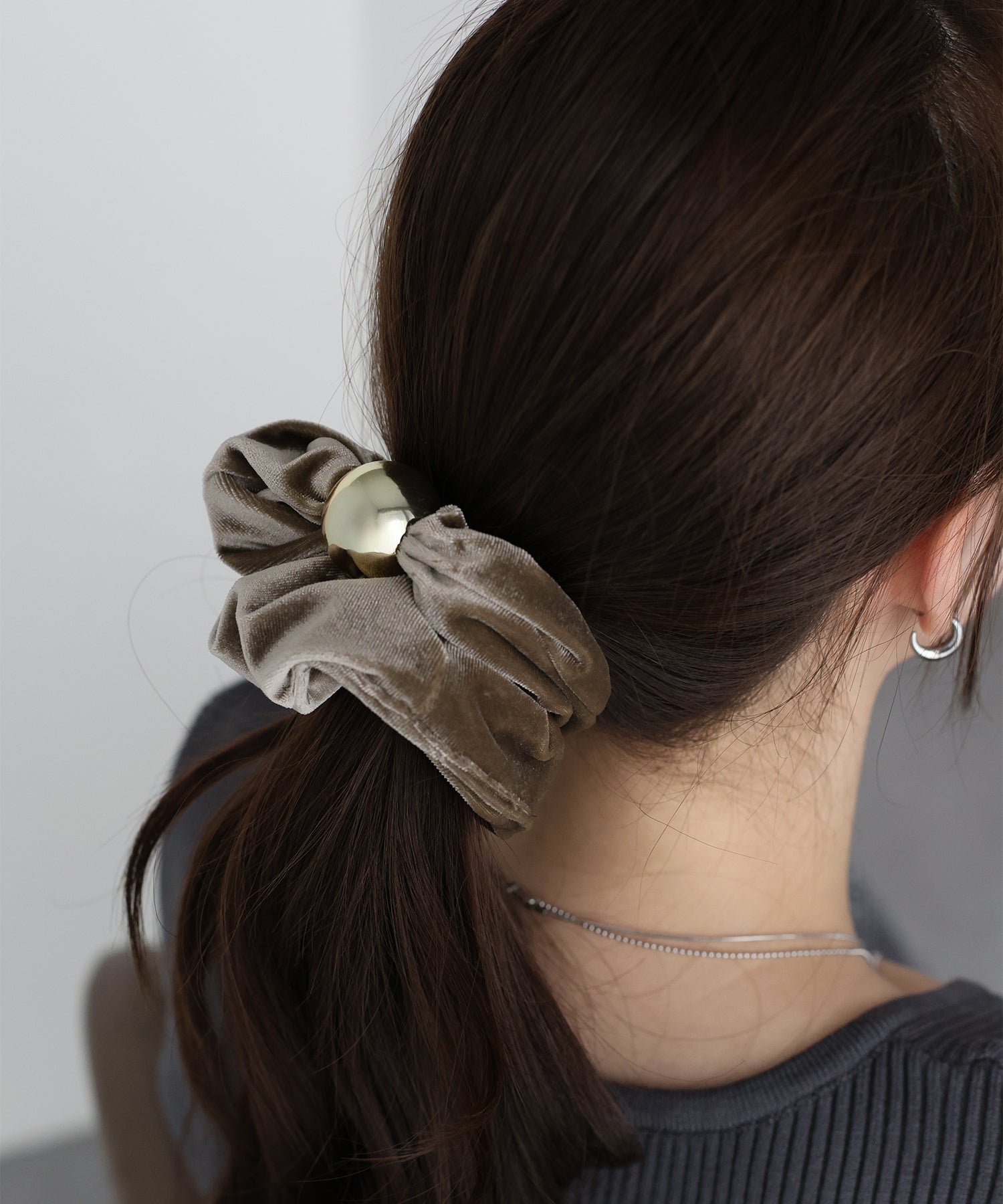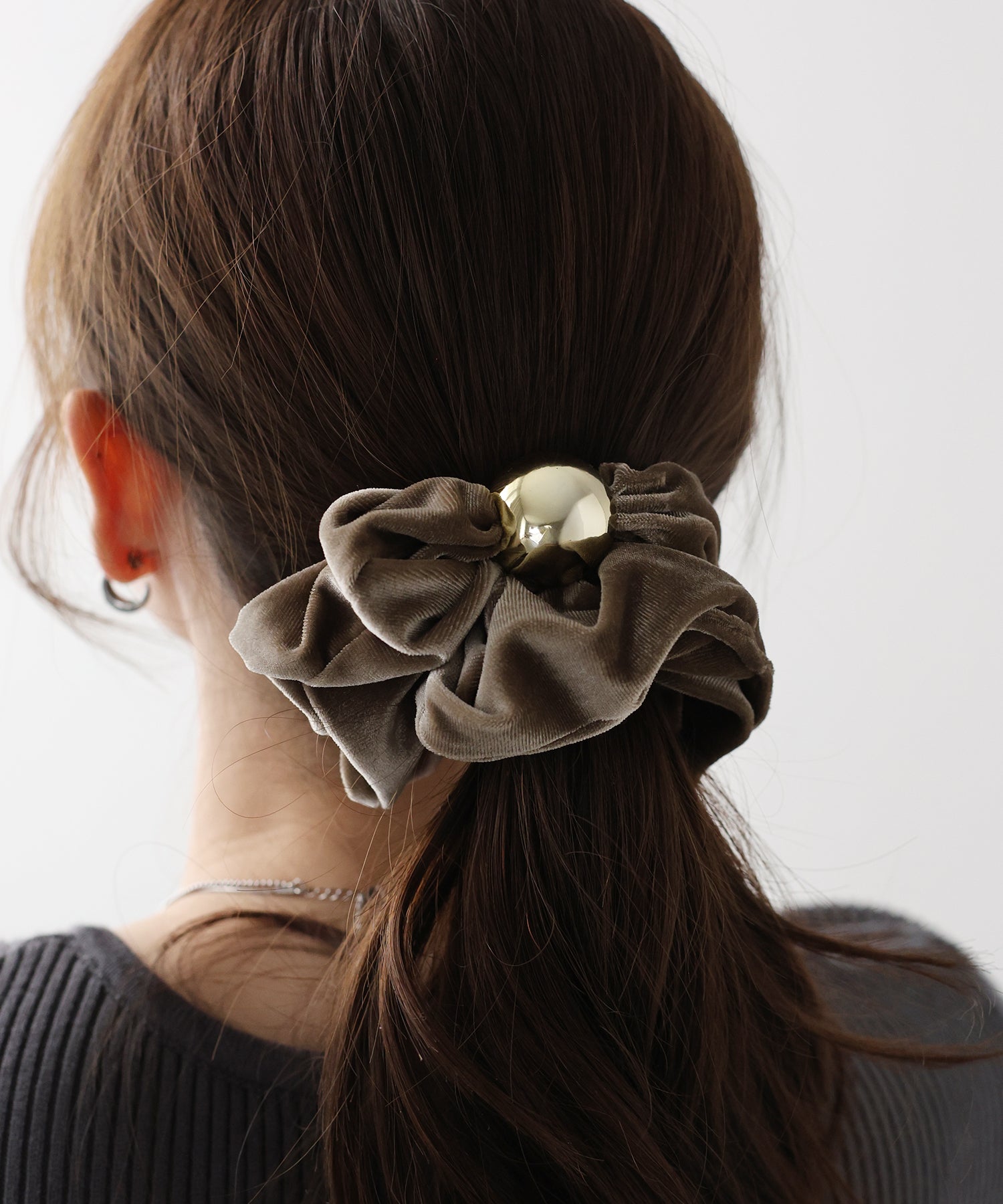 ゴールドのメタルボールがアクセントのベロアシュシュ