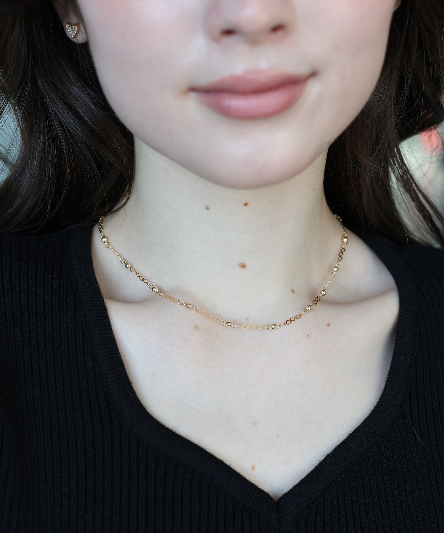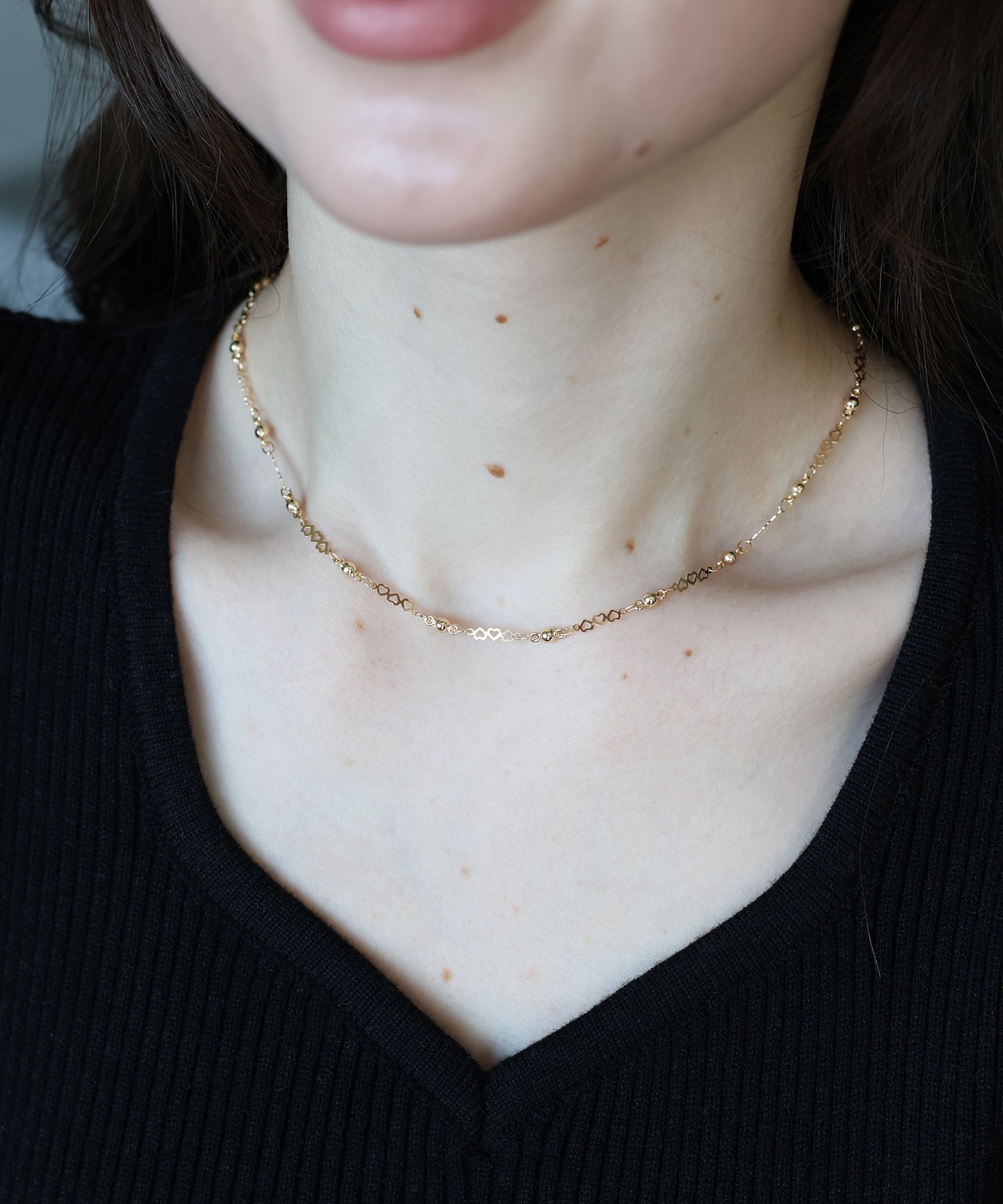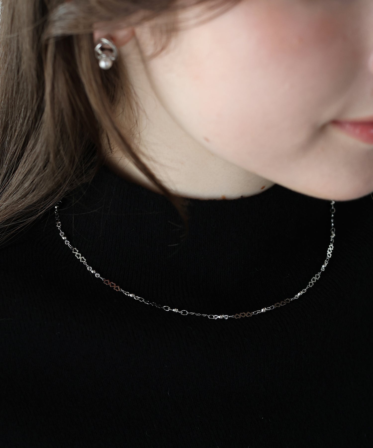 小さなハートが連なったチェーンがさりげなく大人かわいい印象を演出します。