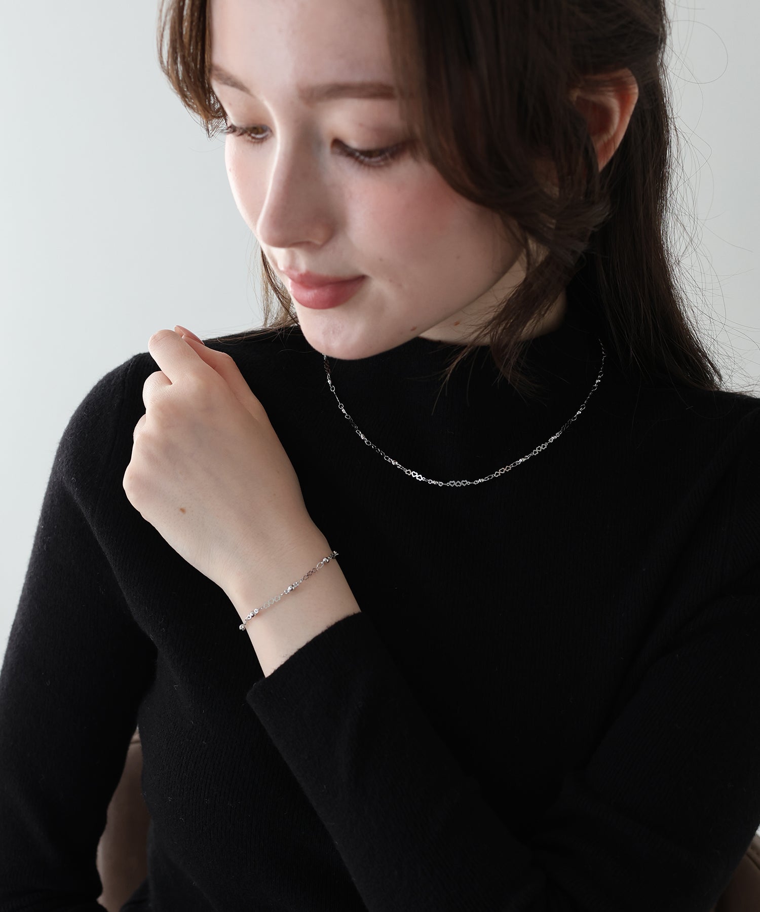 華奢でありながらも存在感のあるネックレスなので1つ付けるだけでコーディネートのさりげないワンポイントに。