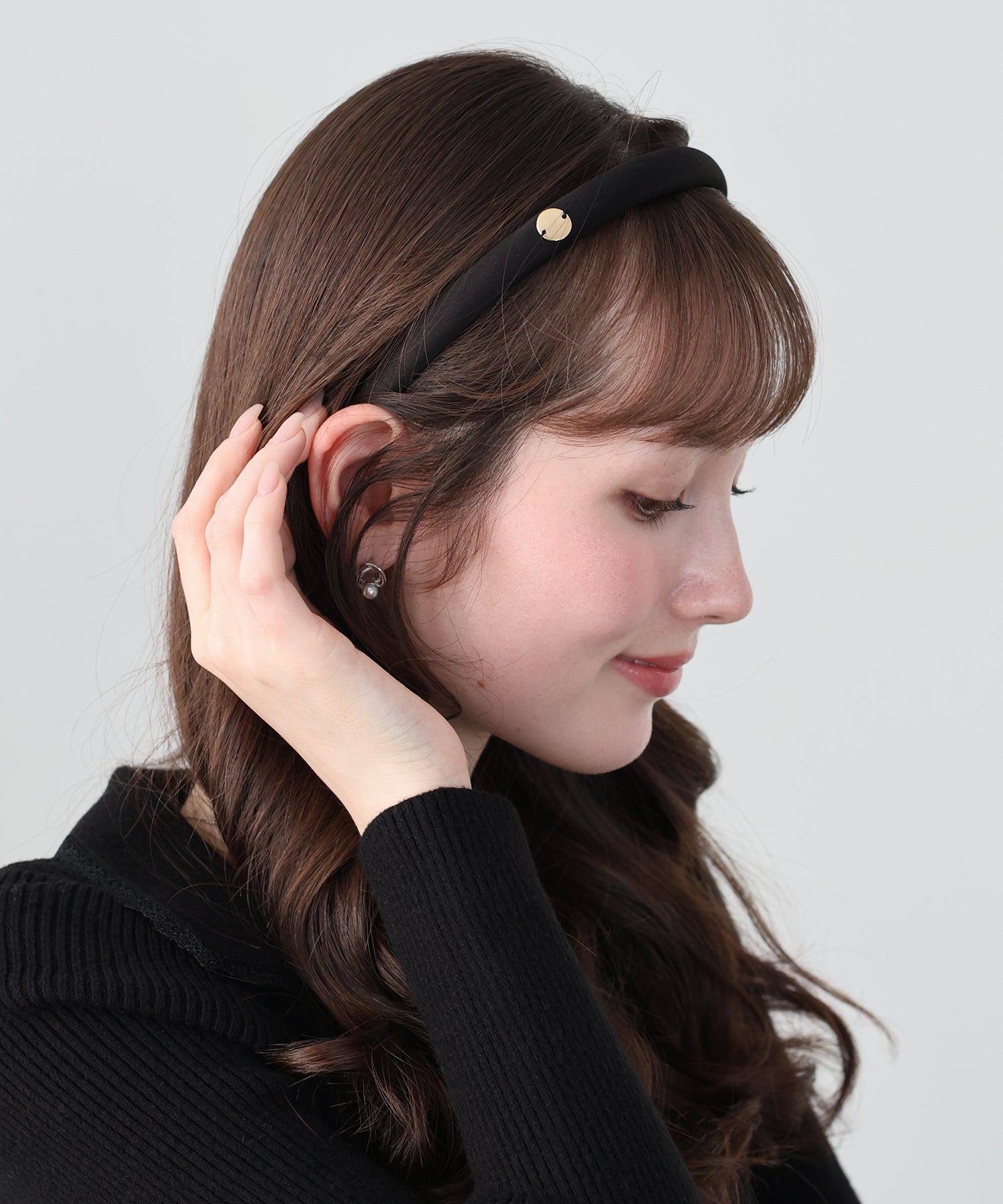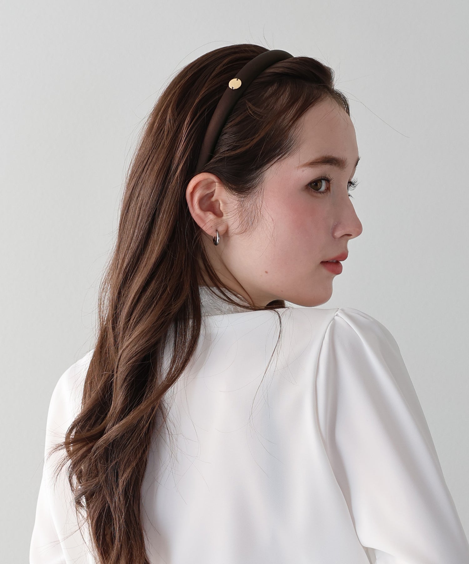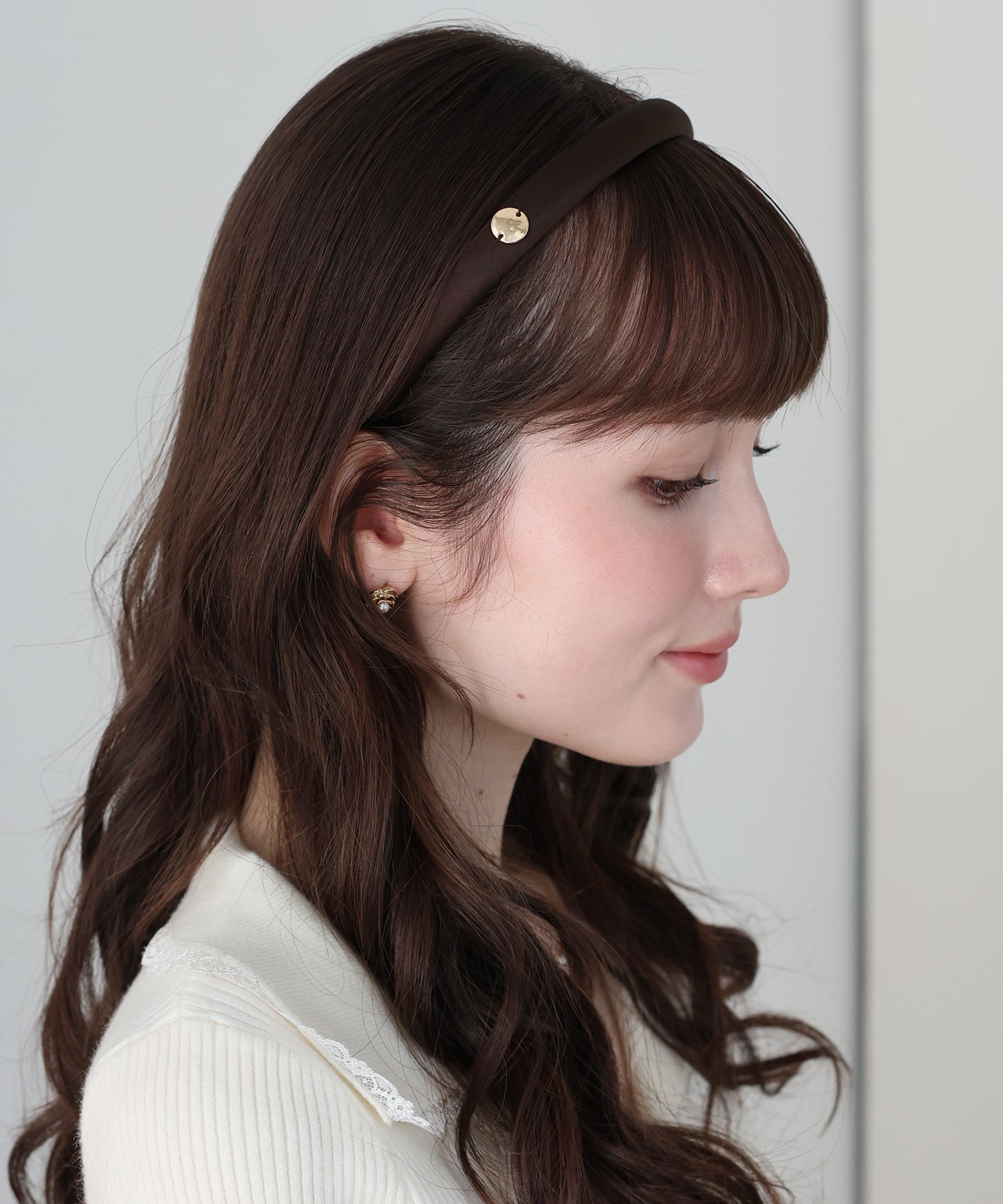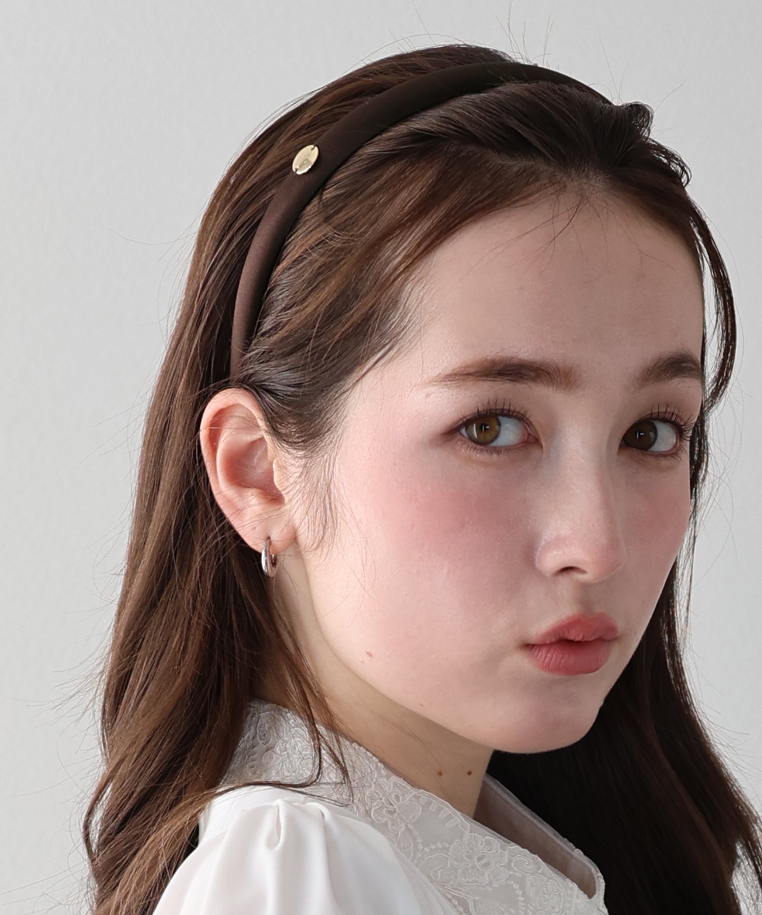 高級感のあるサテン生地のカチューシャにメタルモチーフをあしらい、こなれた印象に。