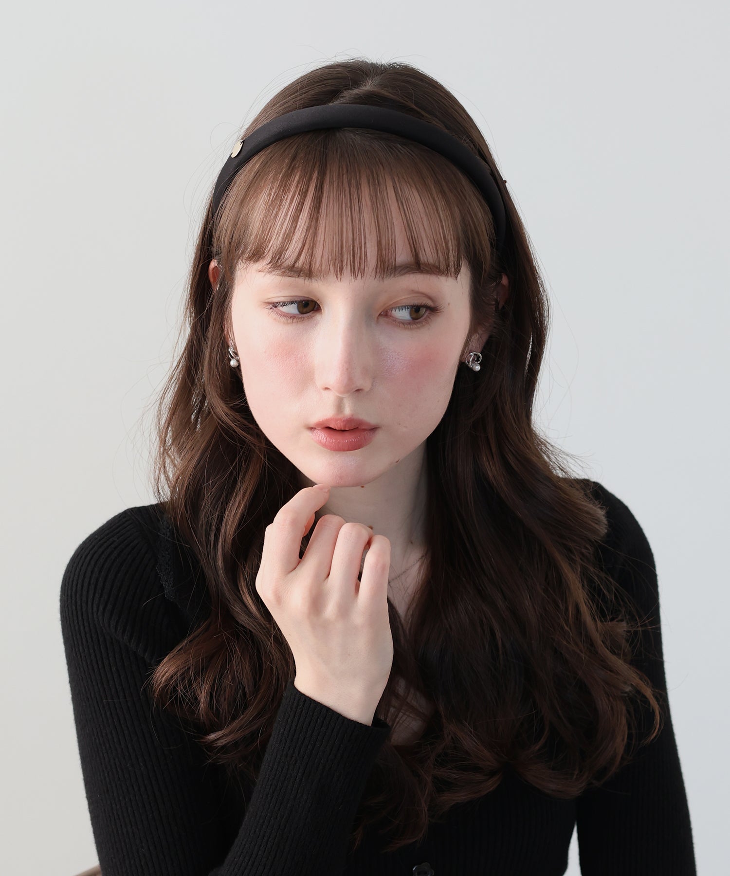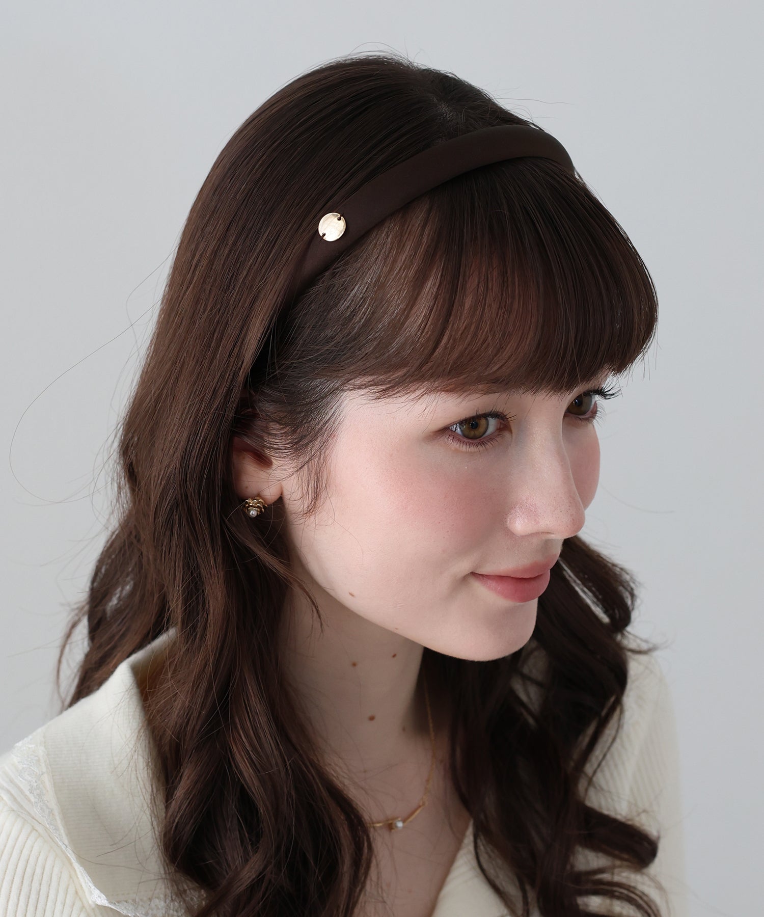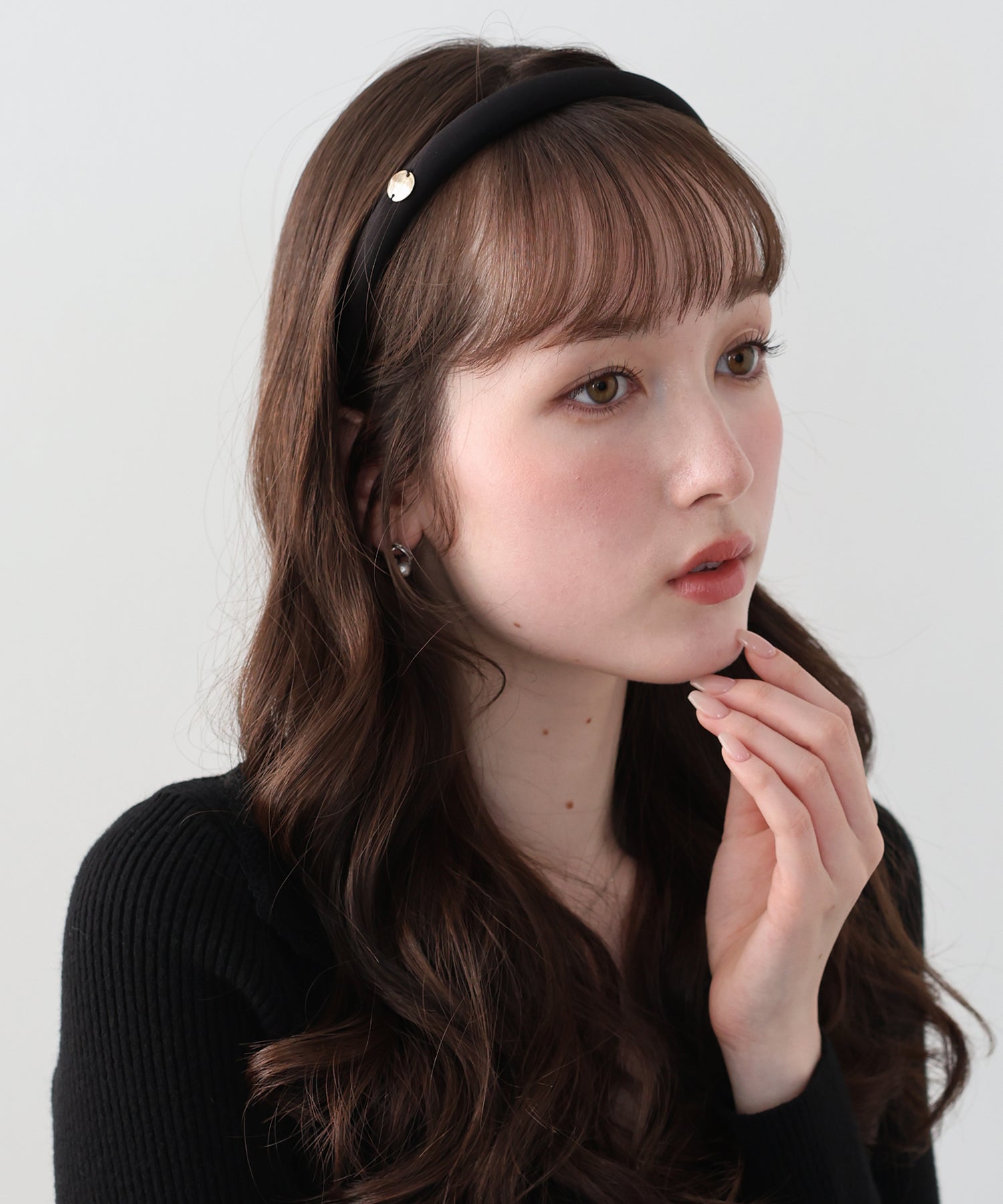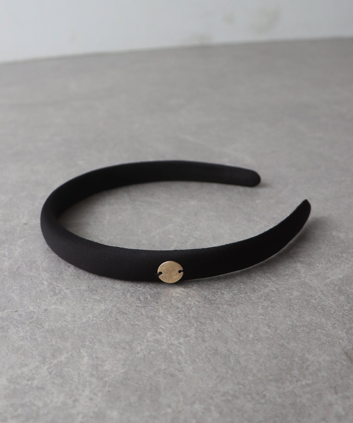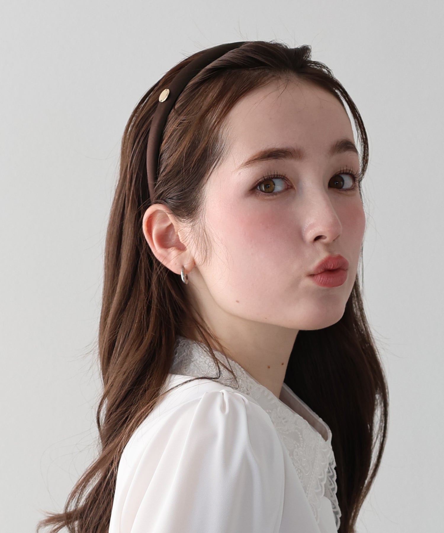 高級感のあるサテン生地のカチューシャにメタルモチーフをあしらい、こなれた印象に。