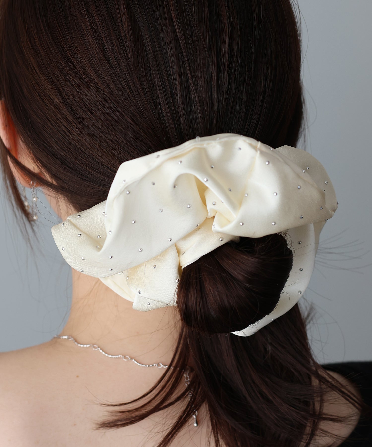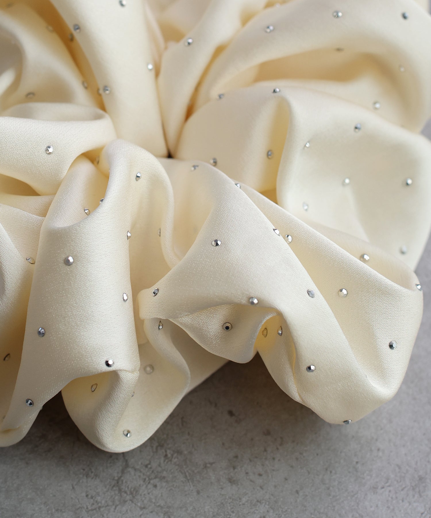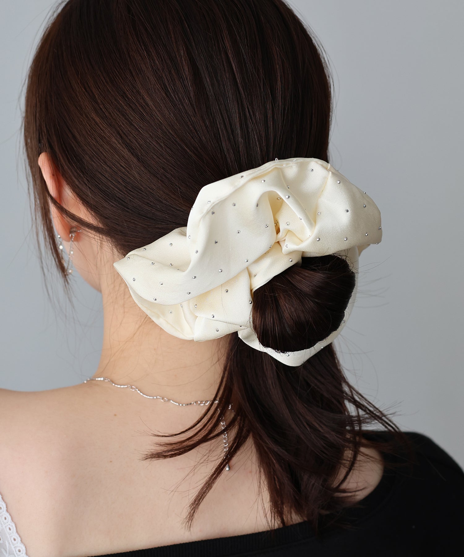 サテンの上に小さなシルバーのメタルドットがきらっと輝きポイントに。