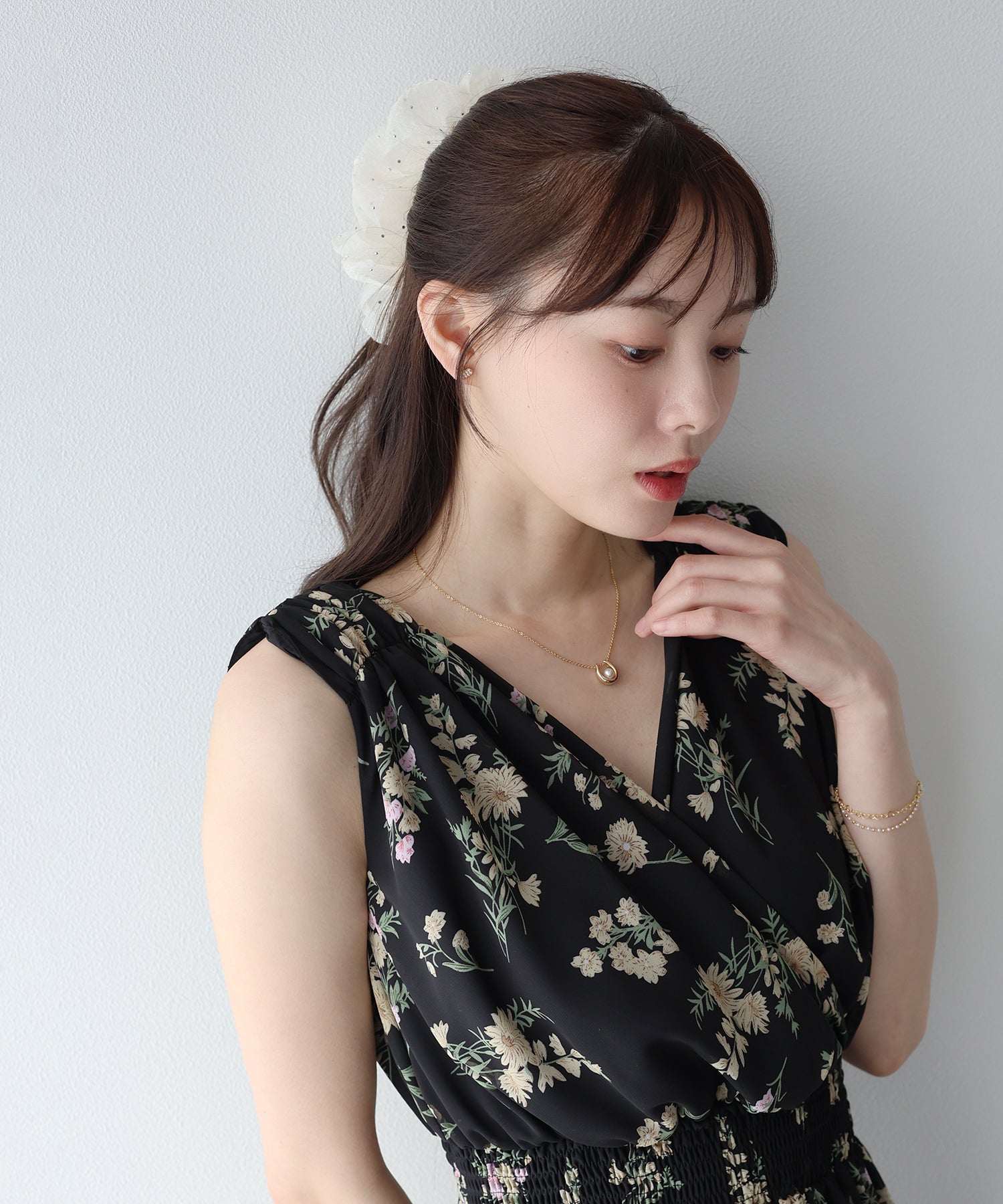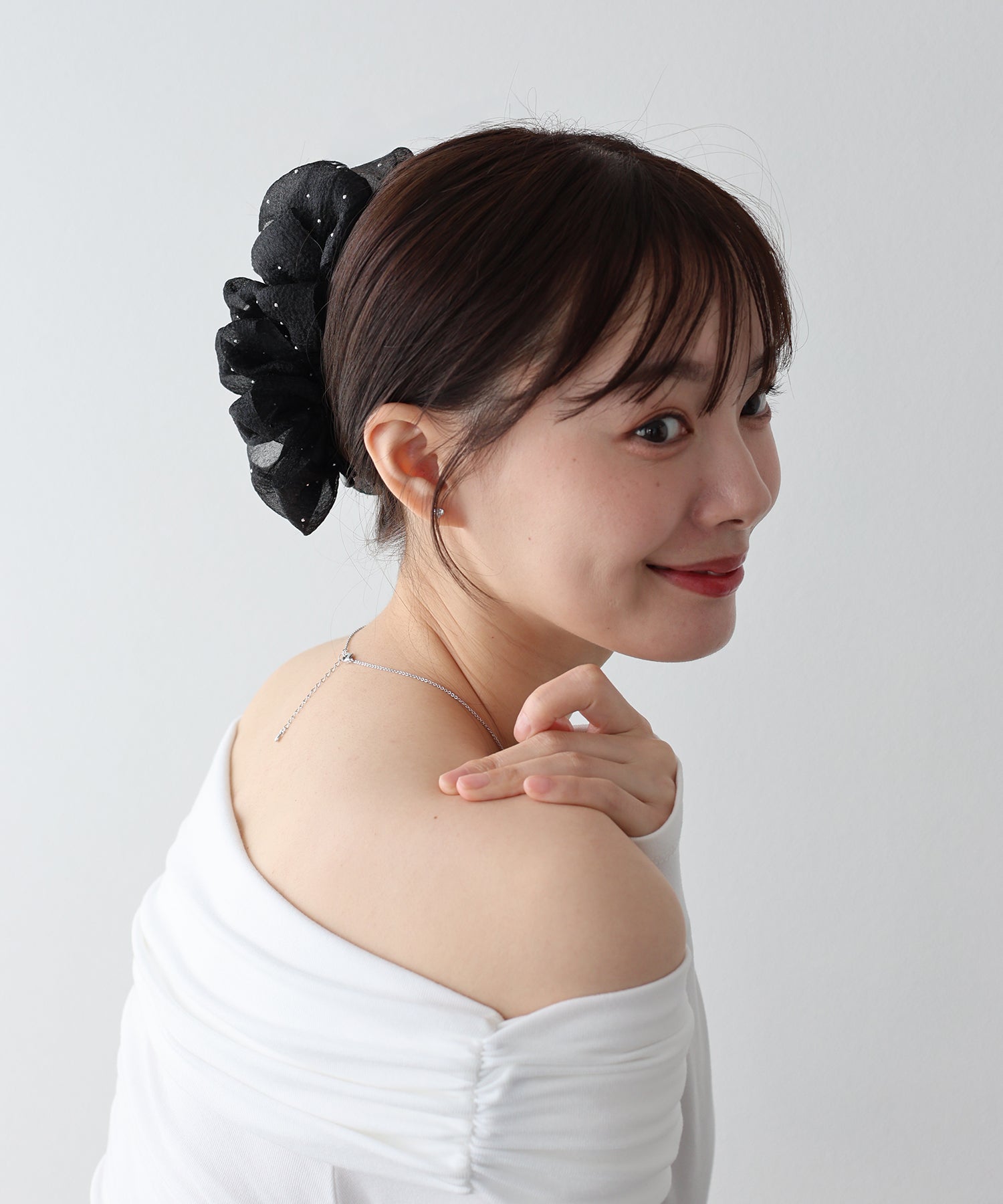 シンプルなまとめ髪にさっと付けるだけで、洗練された印象に。
