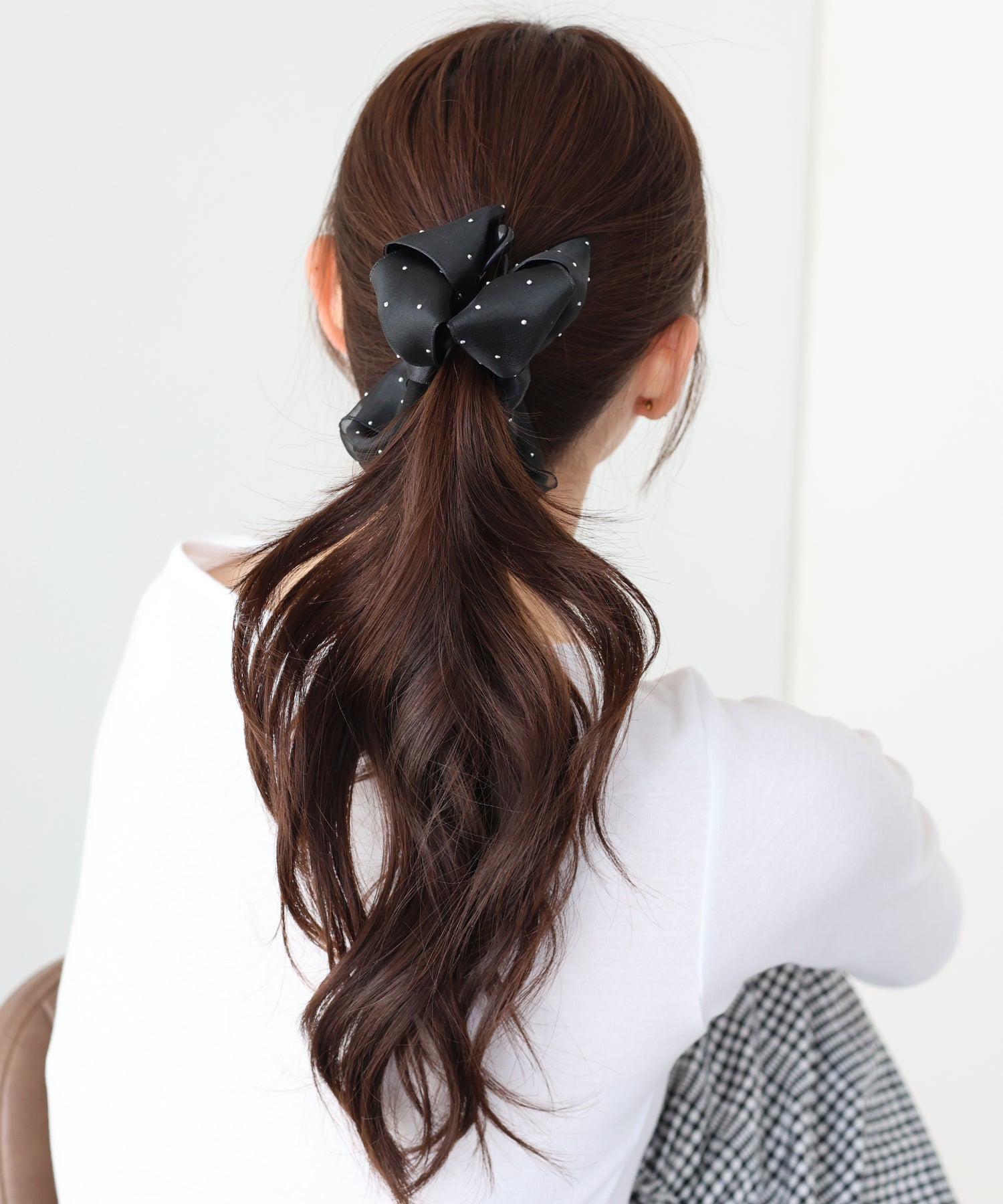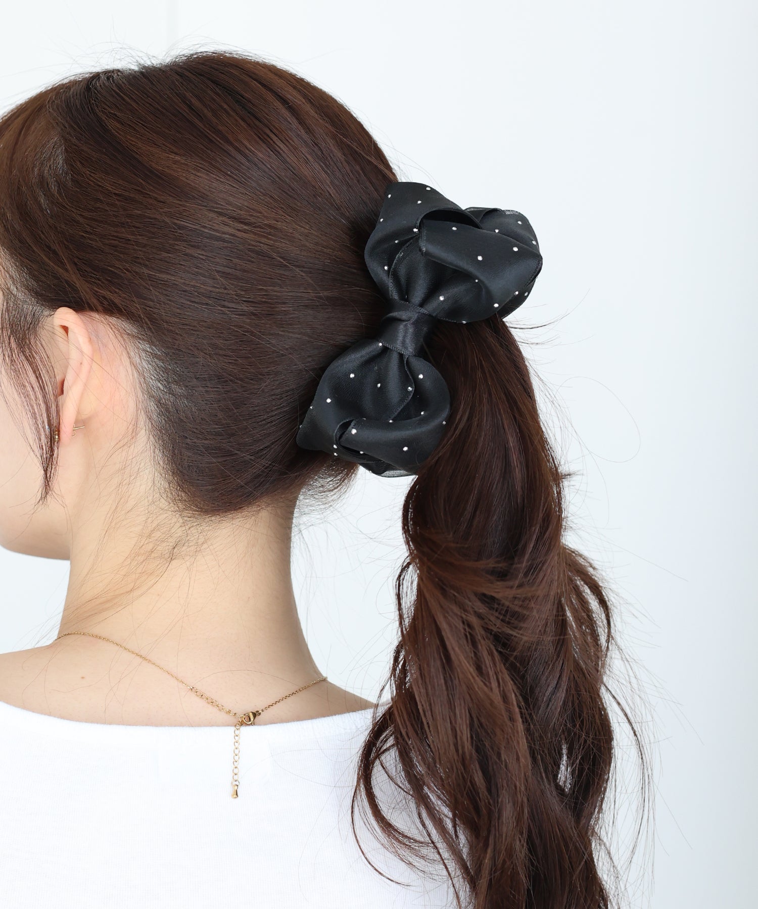 ざっくりとまとめた髪につけるだけで、フェミニンなアップスタイルが完成。