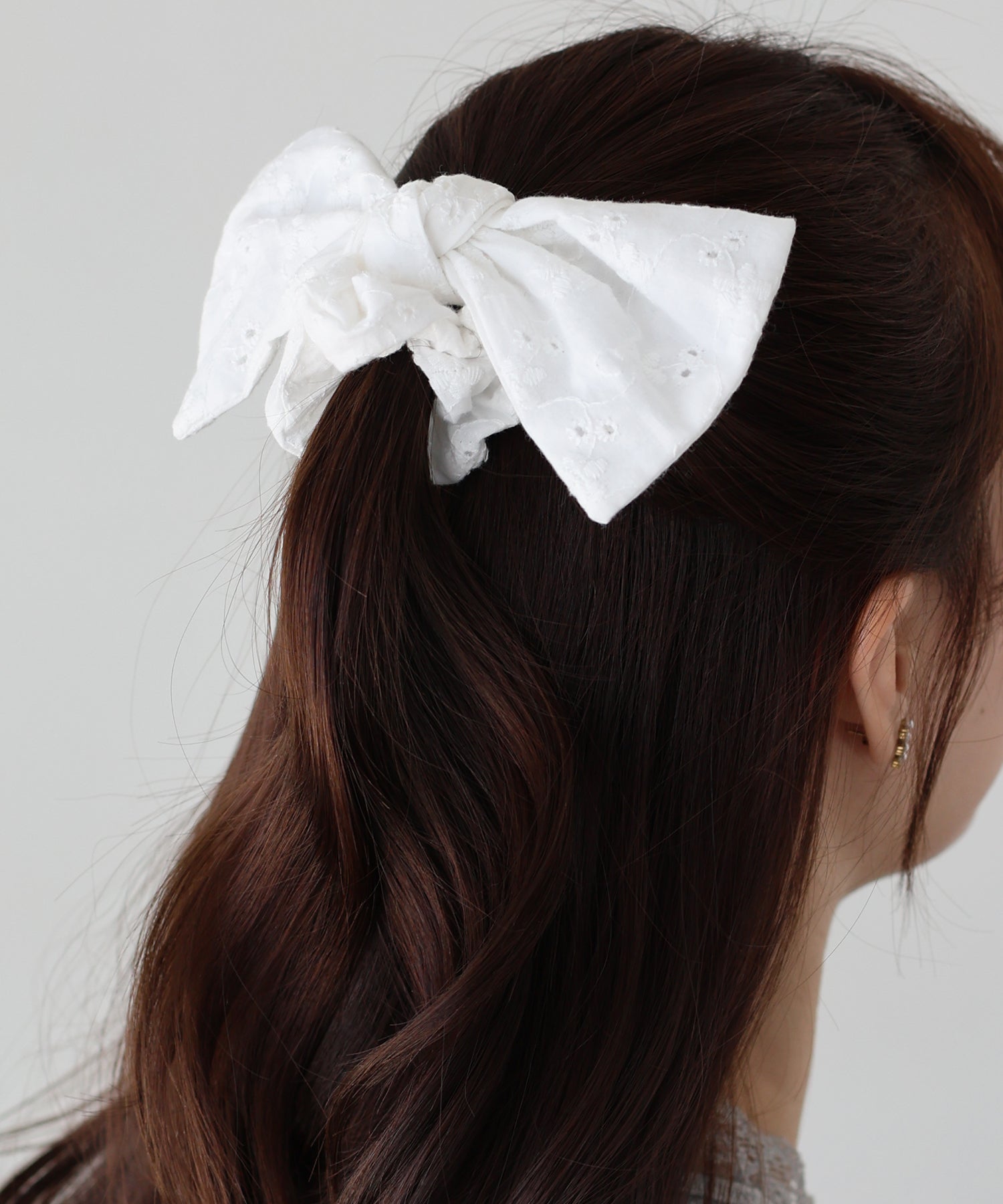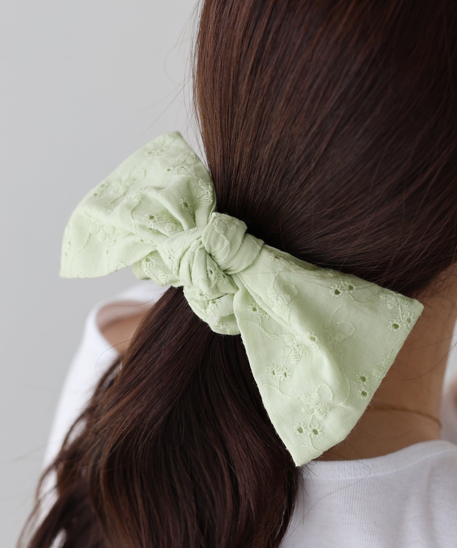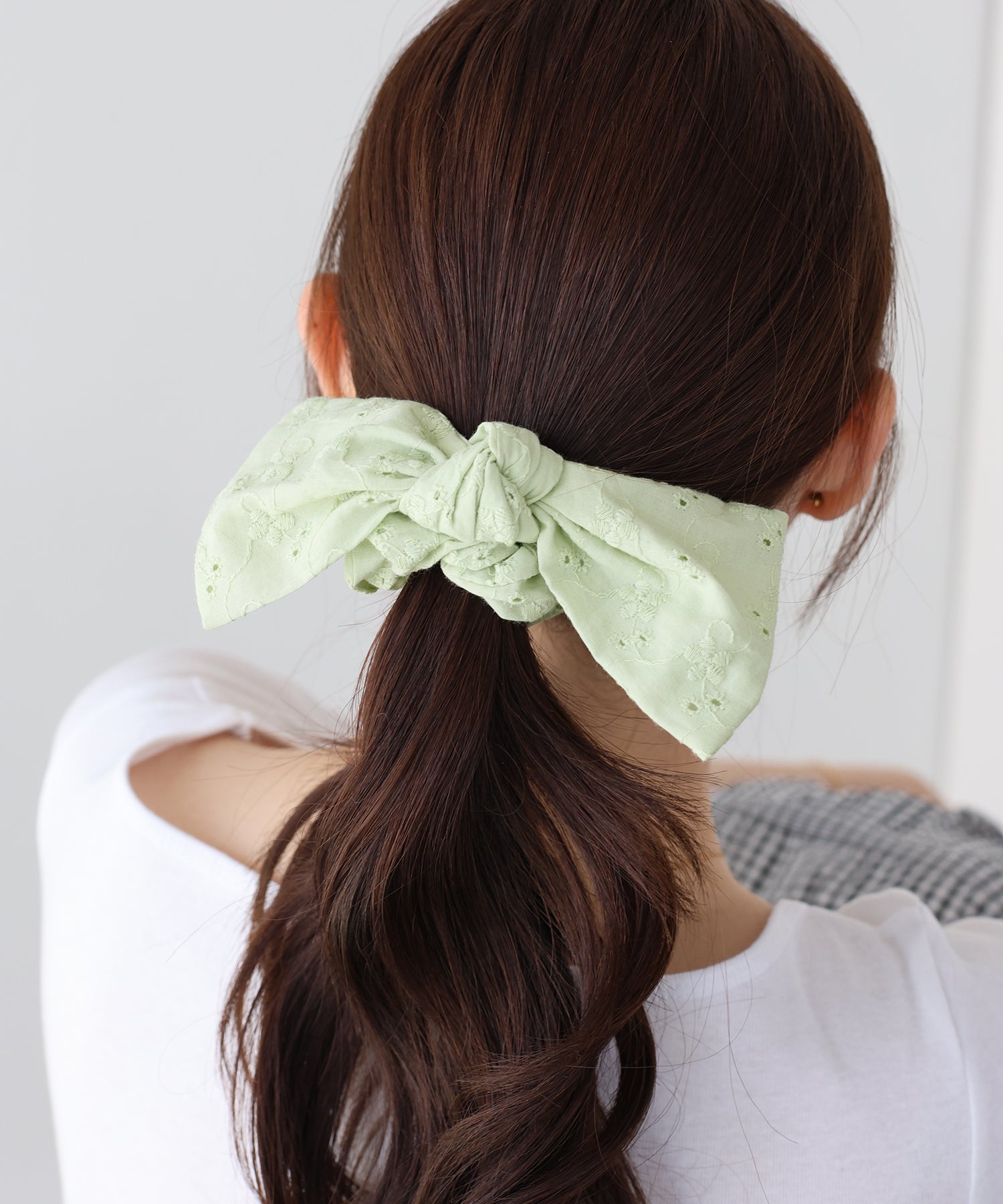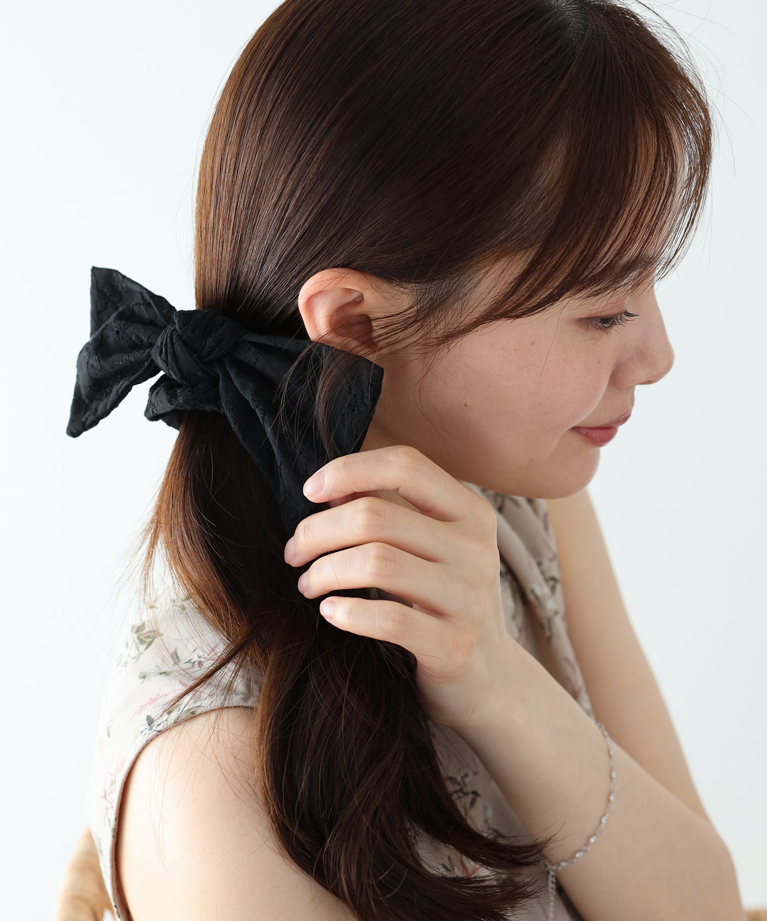 ポニーテールやお団子ヘアに取り入れるだけで、フェミニンなスタイルに。
