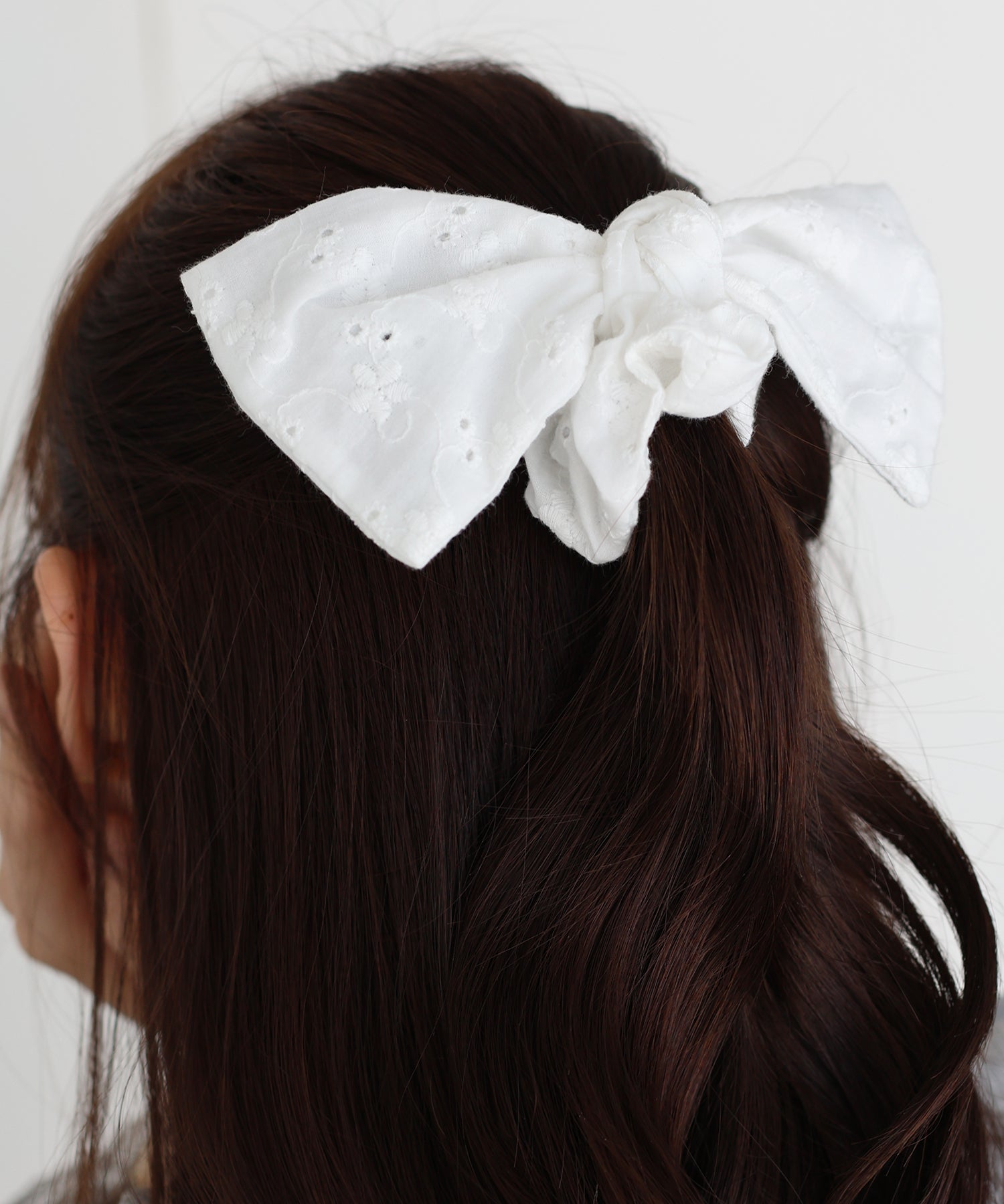 大きめで存在感のあるリボンが大人かわいいコットンレースを使用したシュシュ。