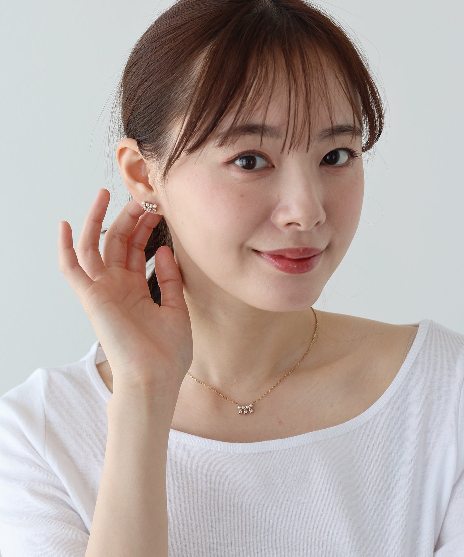 顔周りを華やかに飾る洗練されたデザインのビジューパールネックレス。