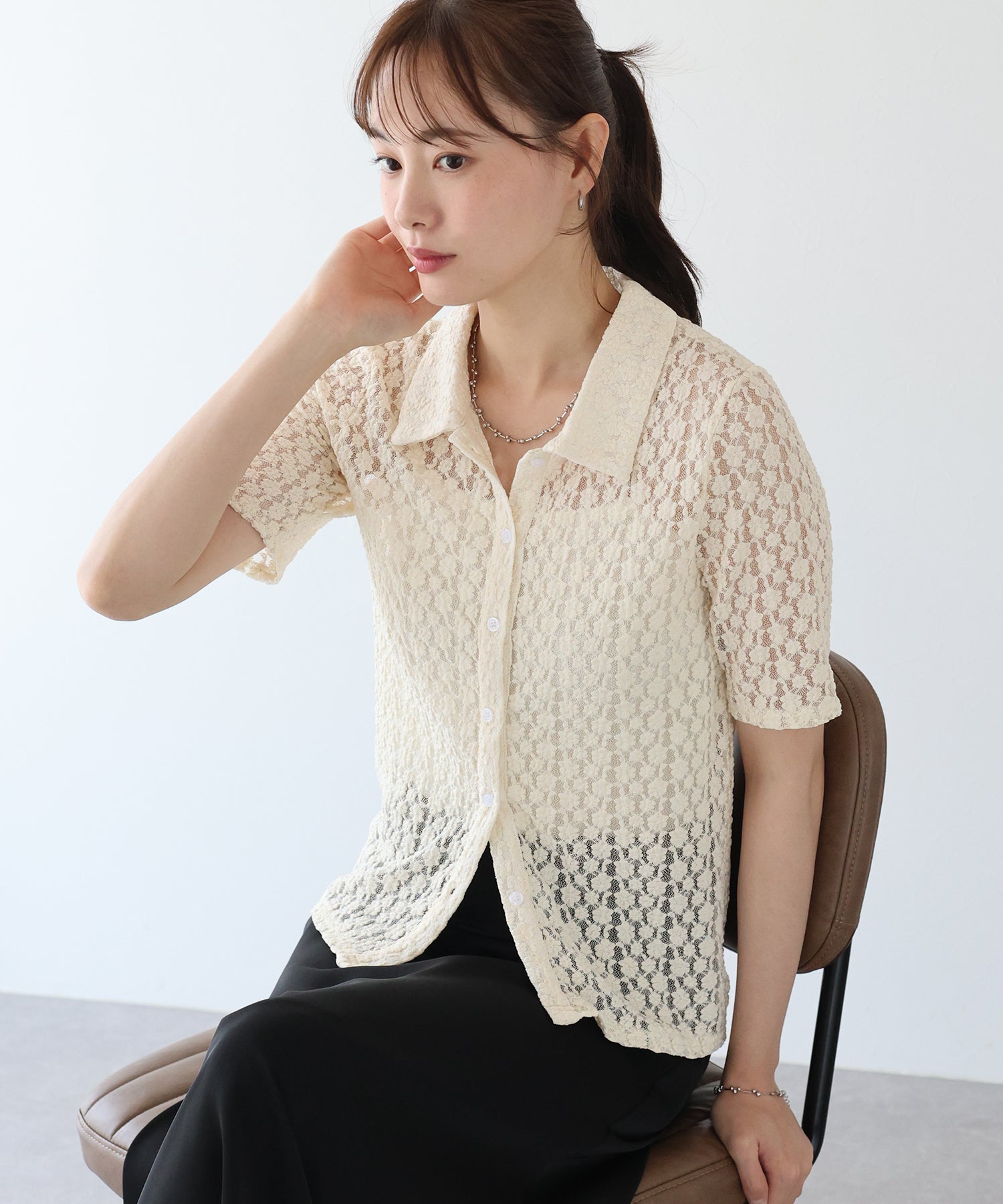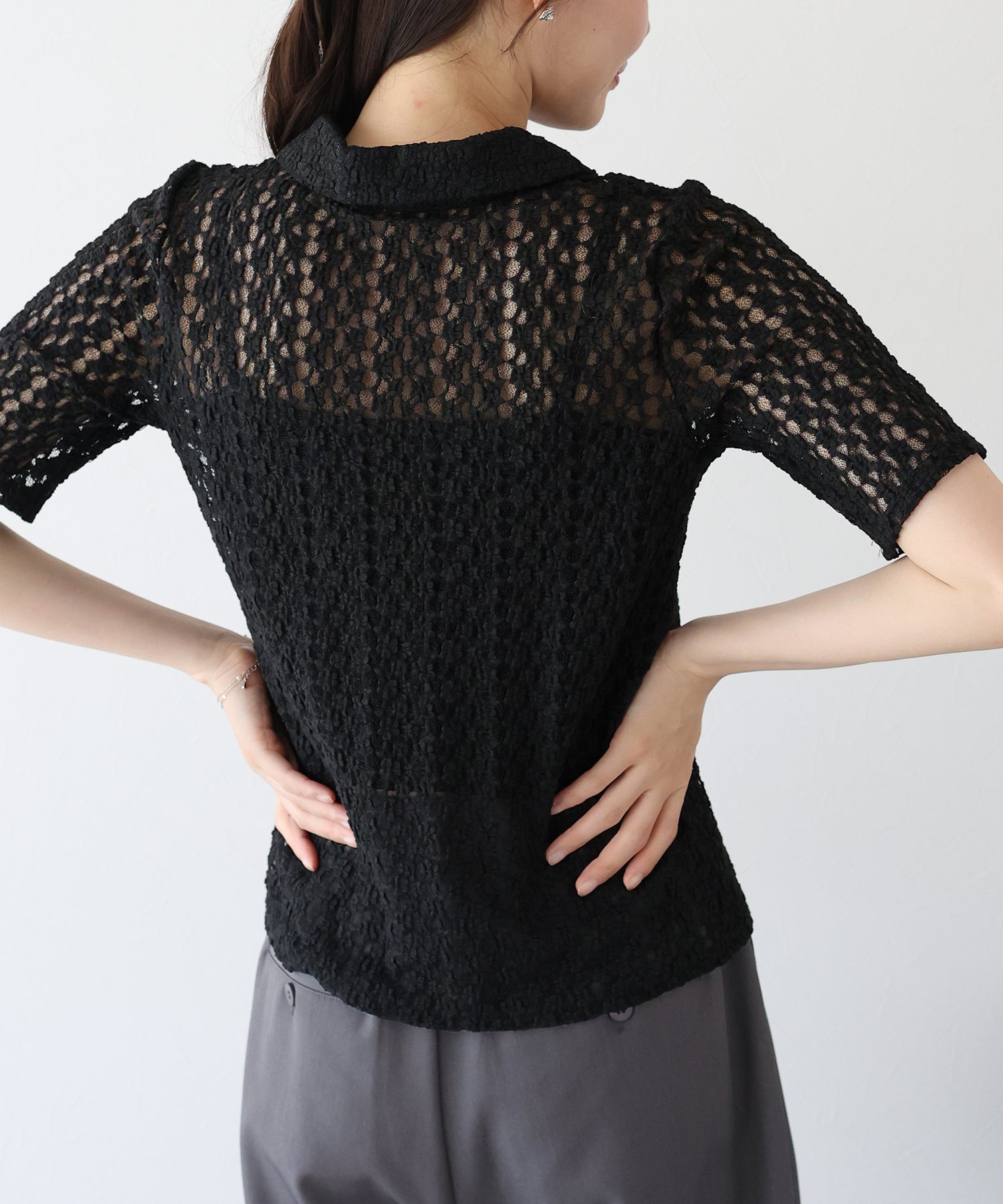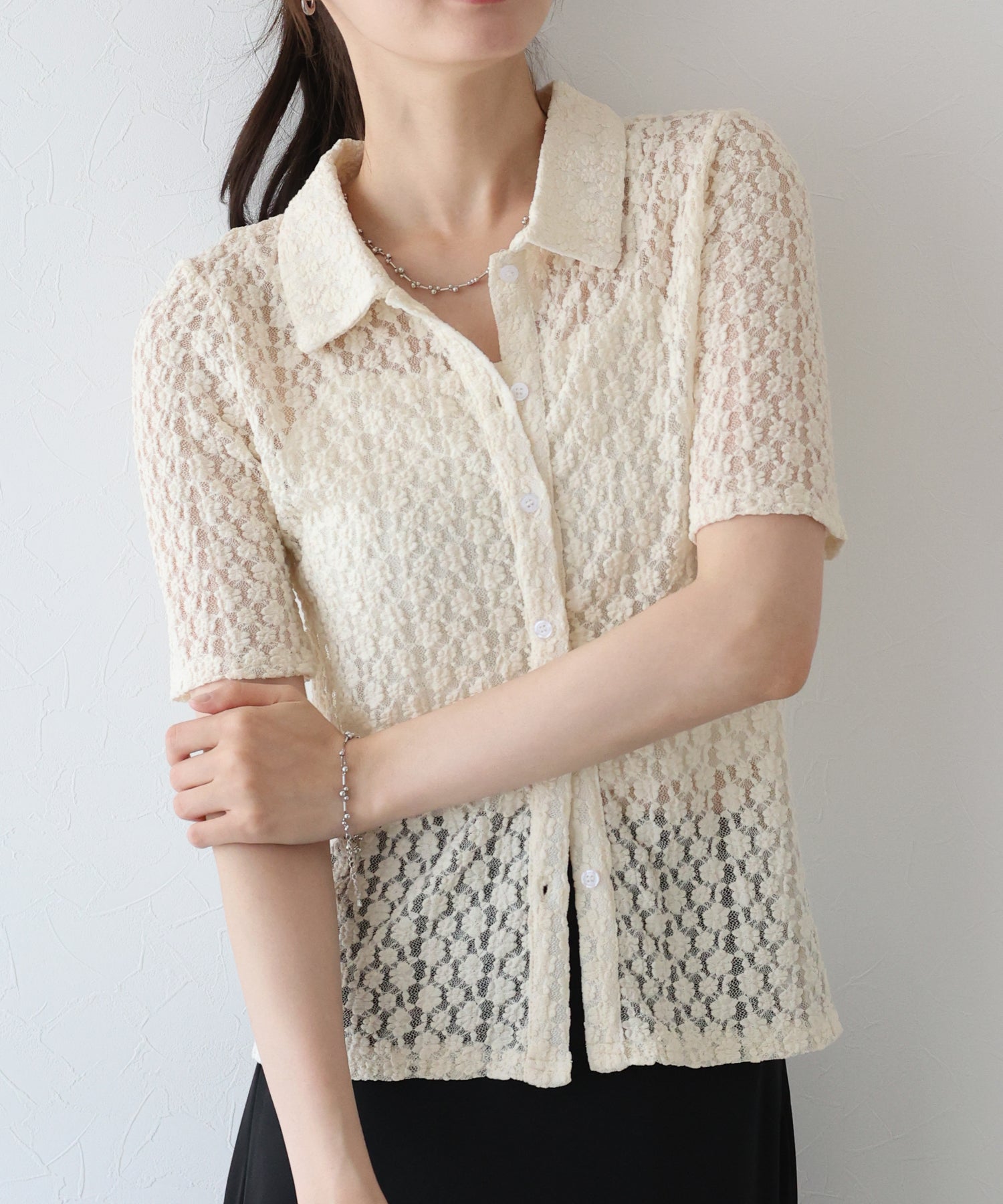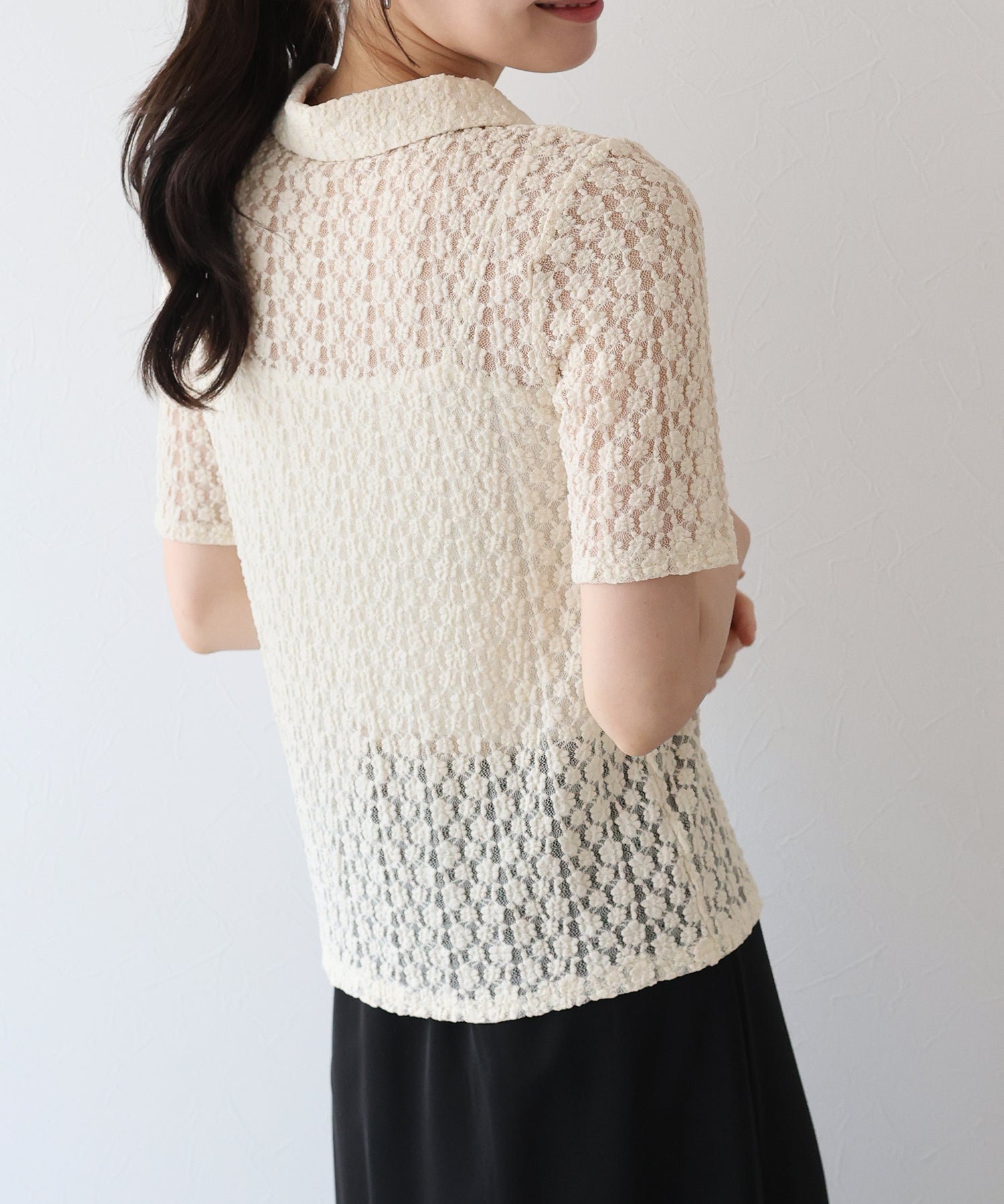 ヘルシーな透け感を楽しめるポロ襟フラワーレースシャツ