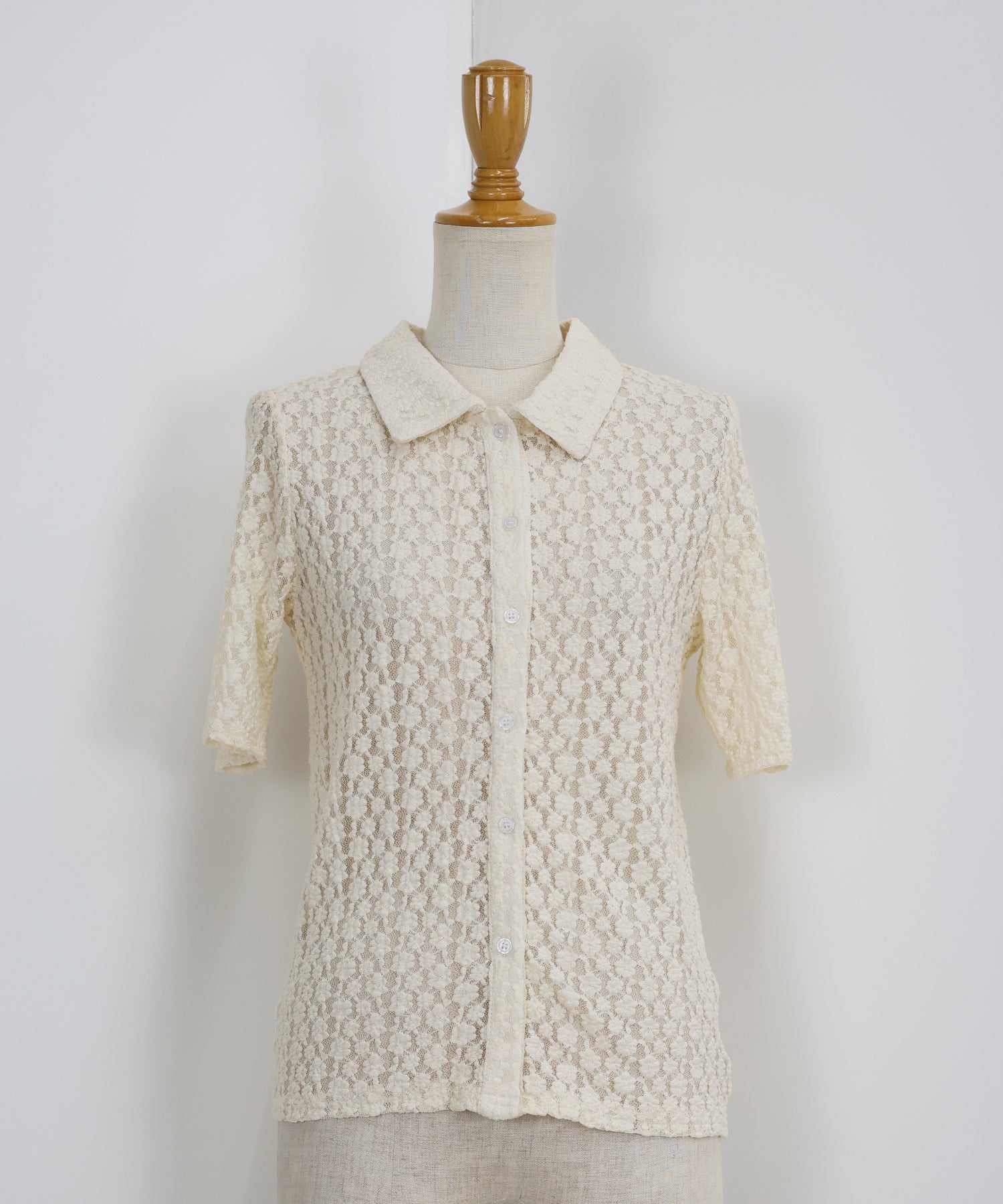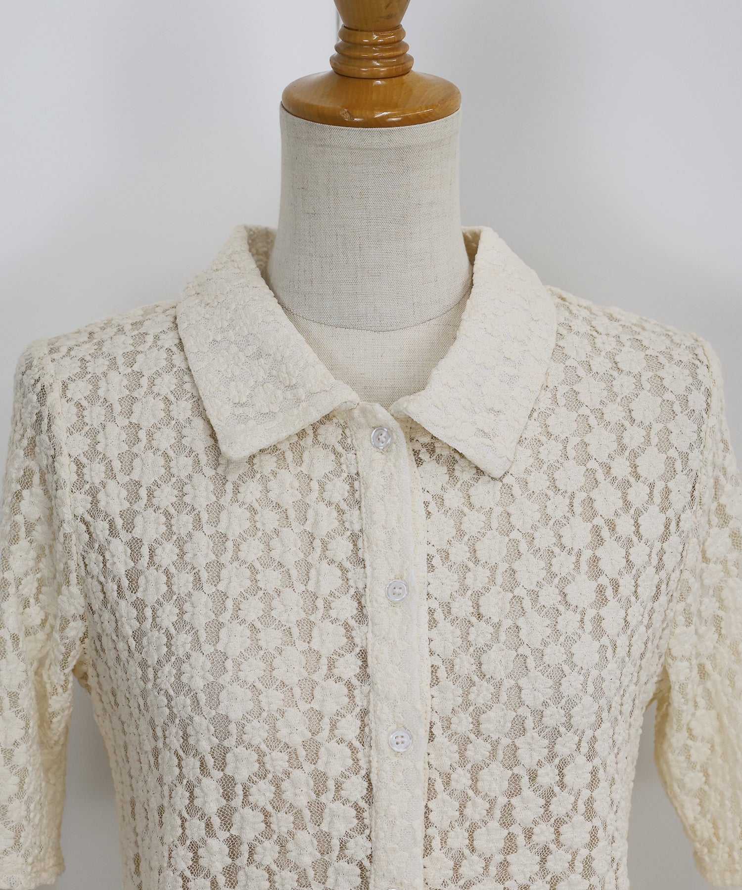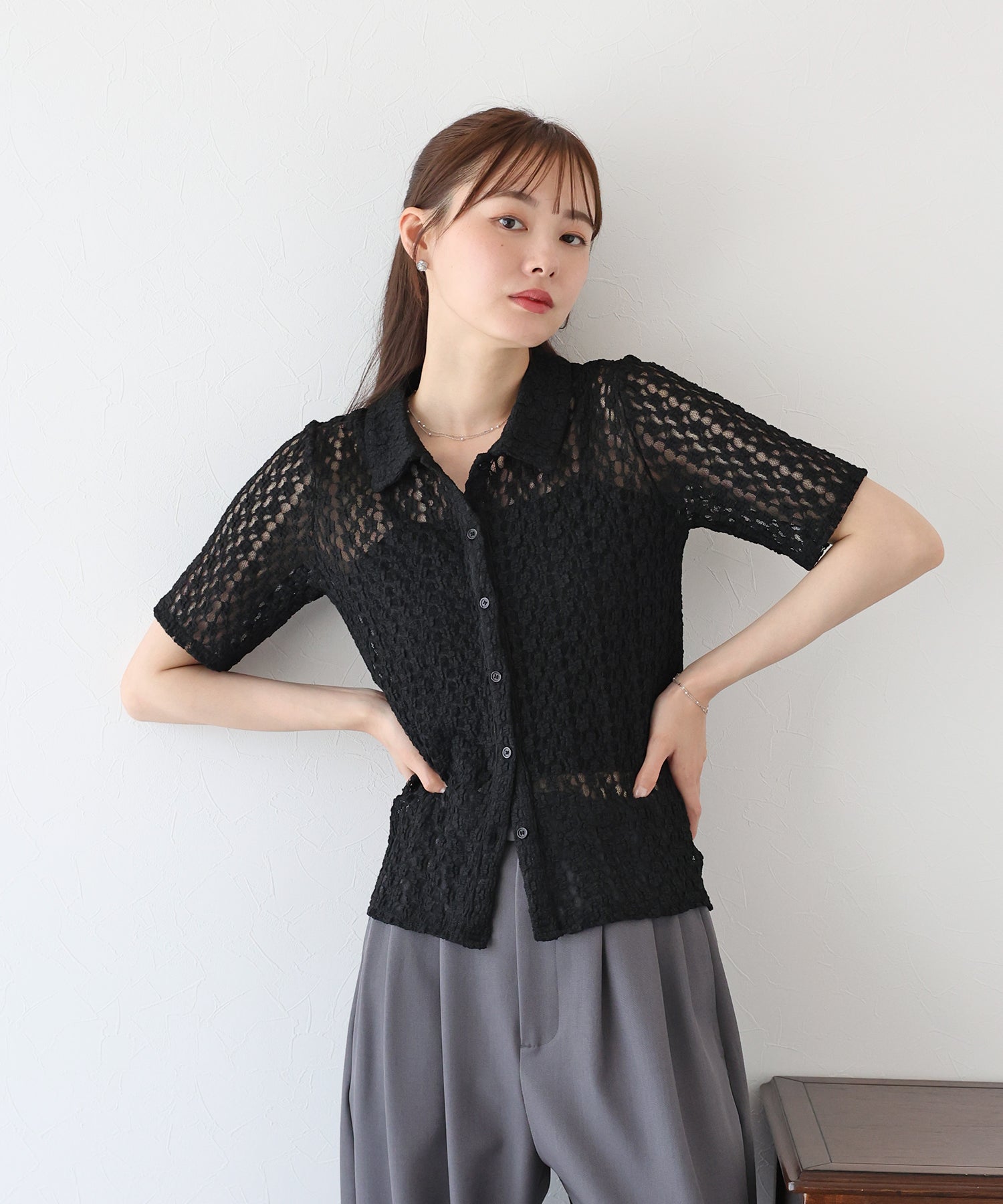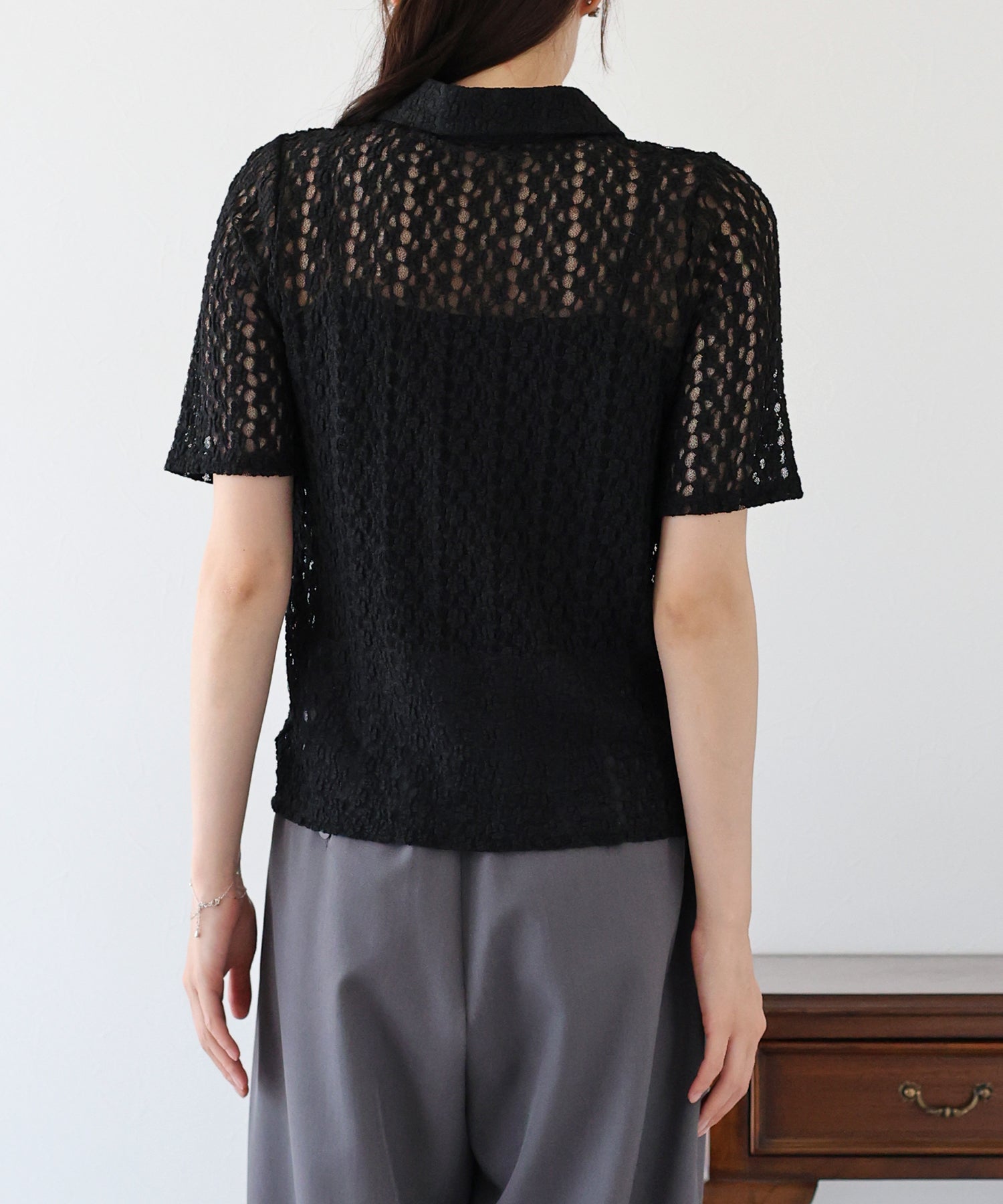 ヘルシーな透け感を楽しめるポロ襟フラワーレースシャツ