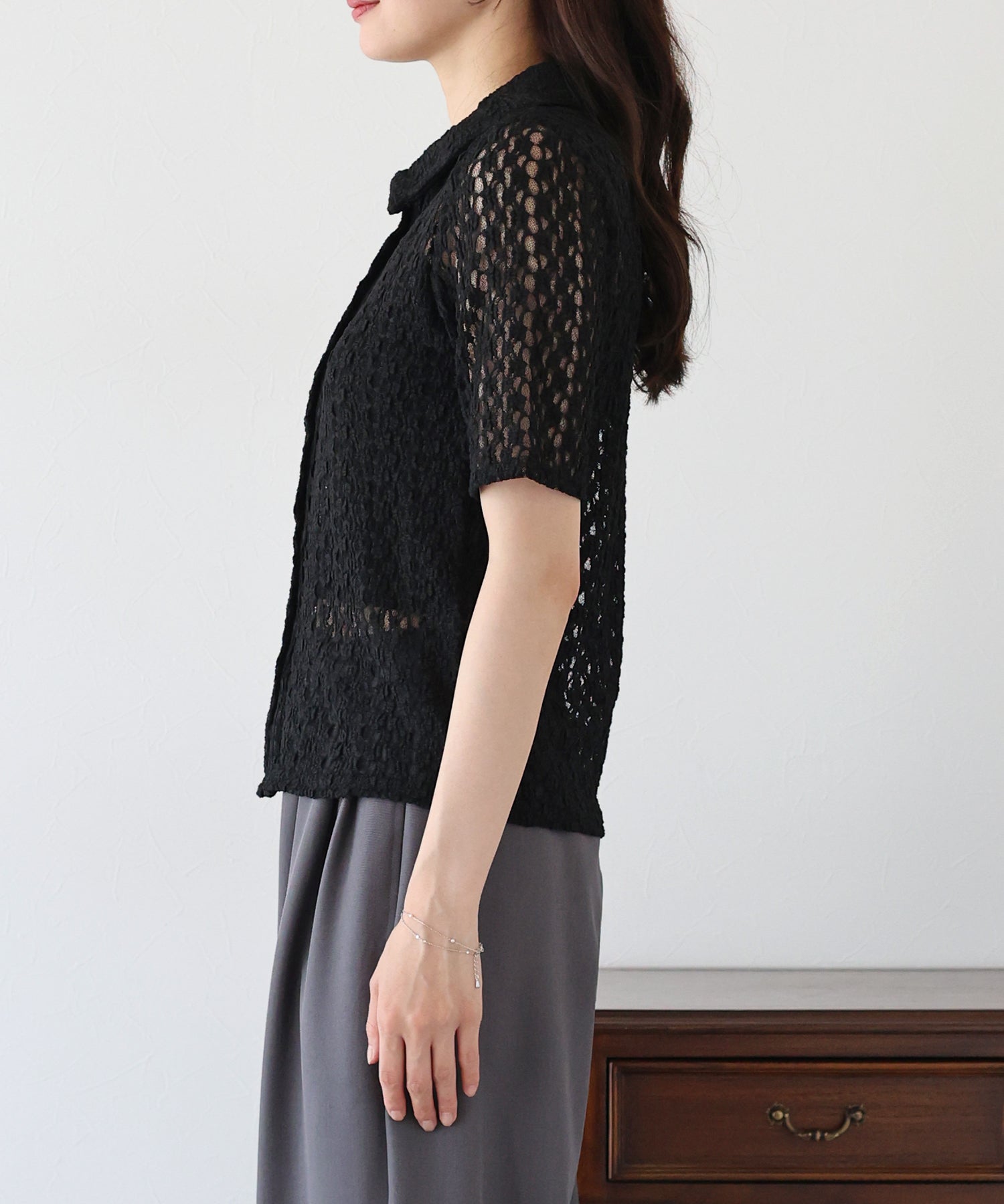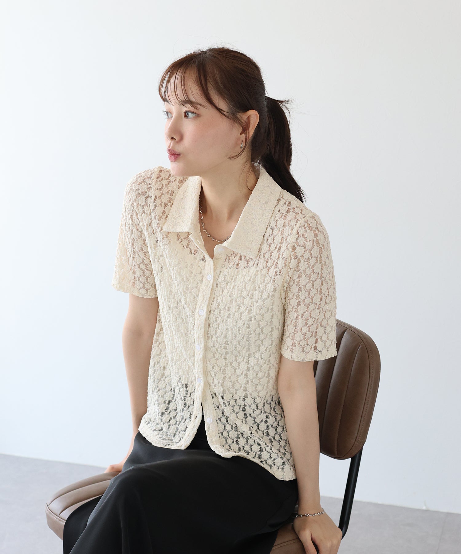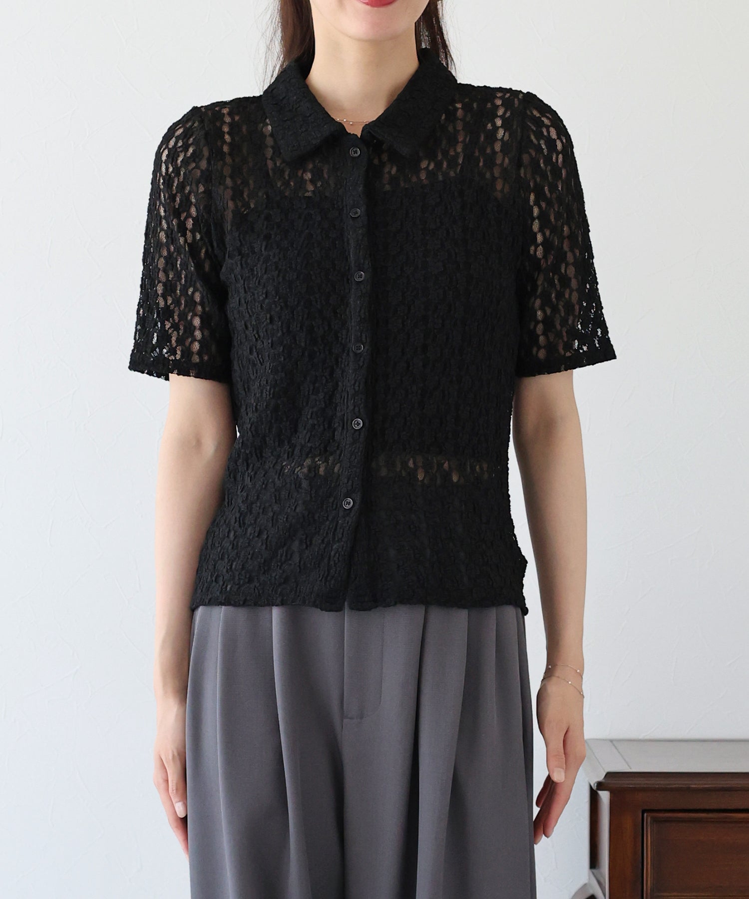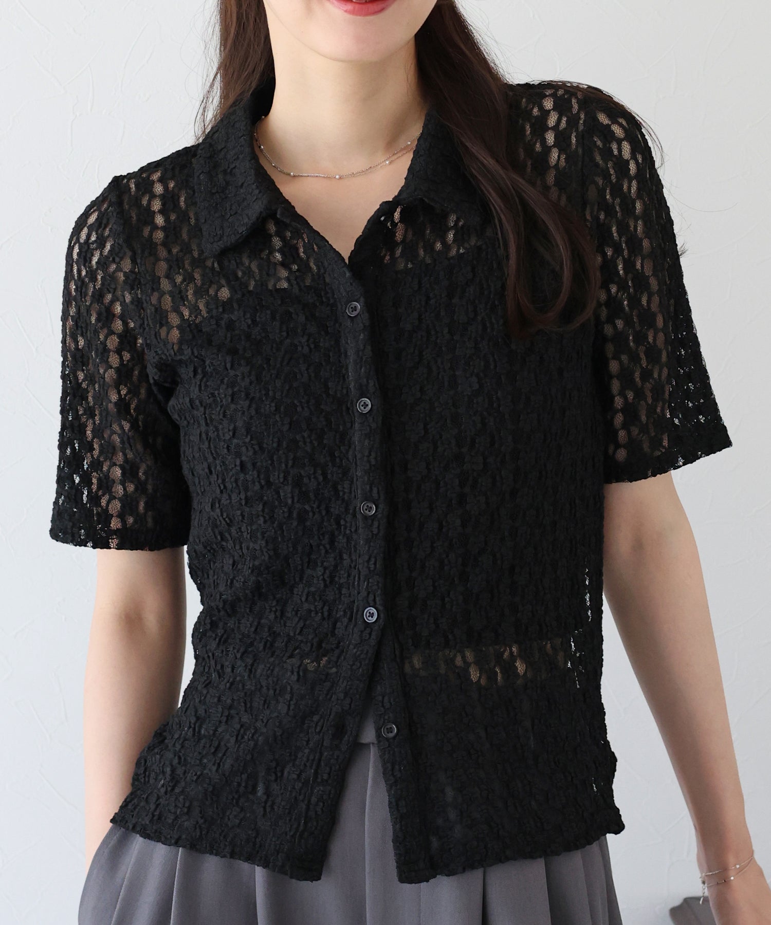ヘルシーな透け感を楽しめるポロ襟フラワーレースシャツ