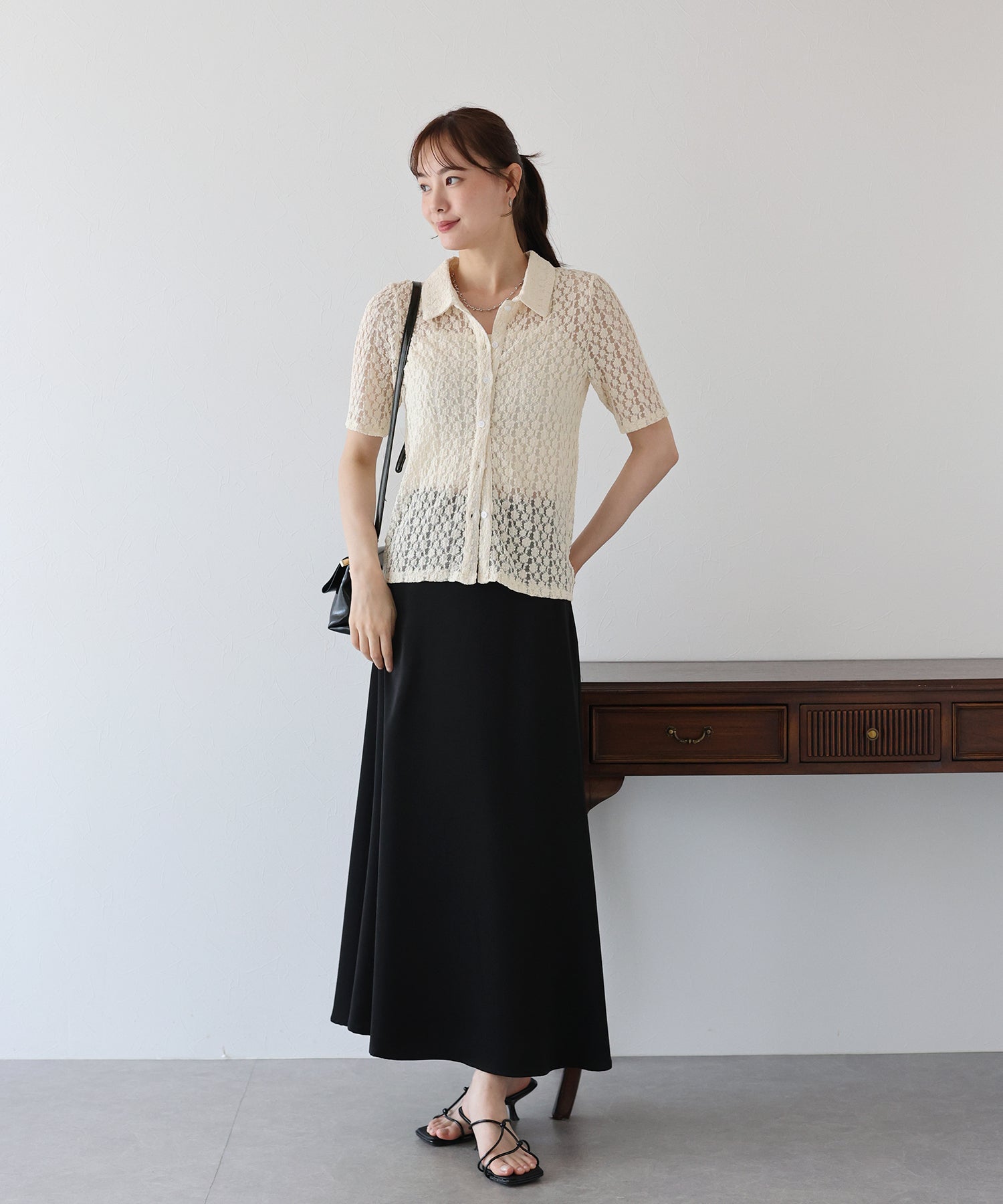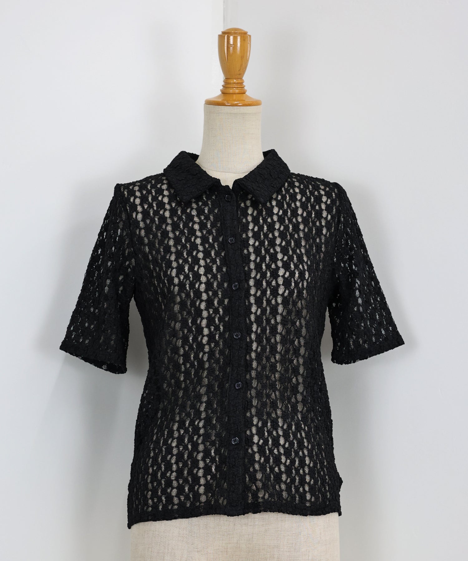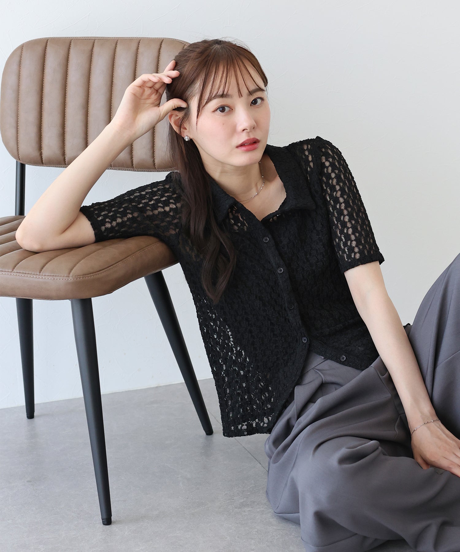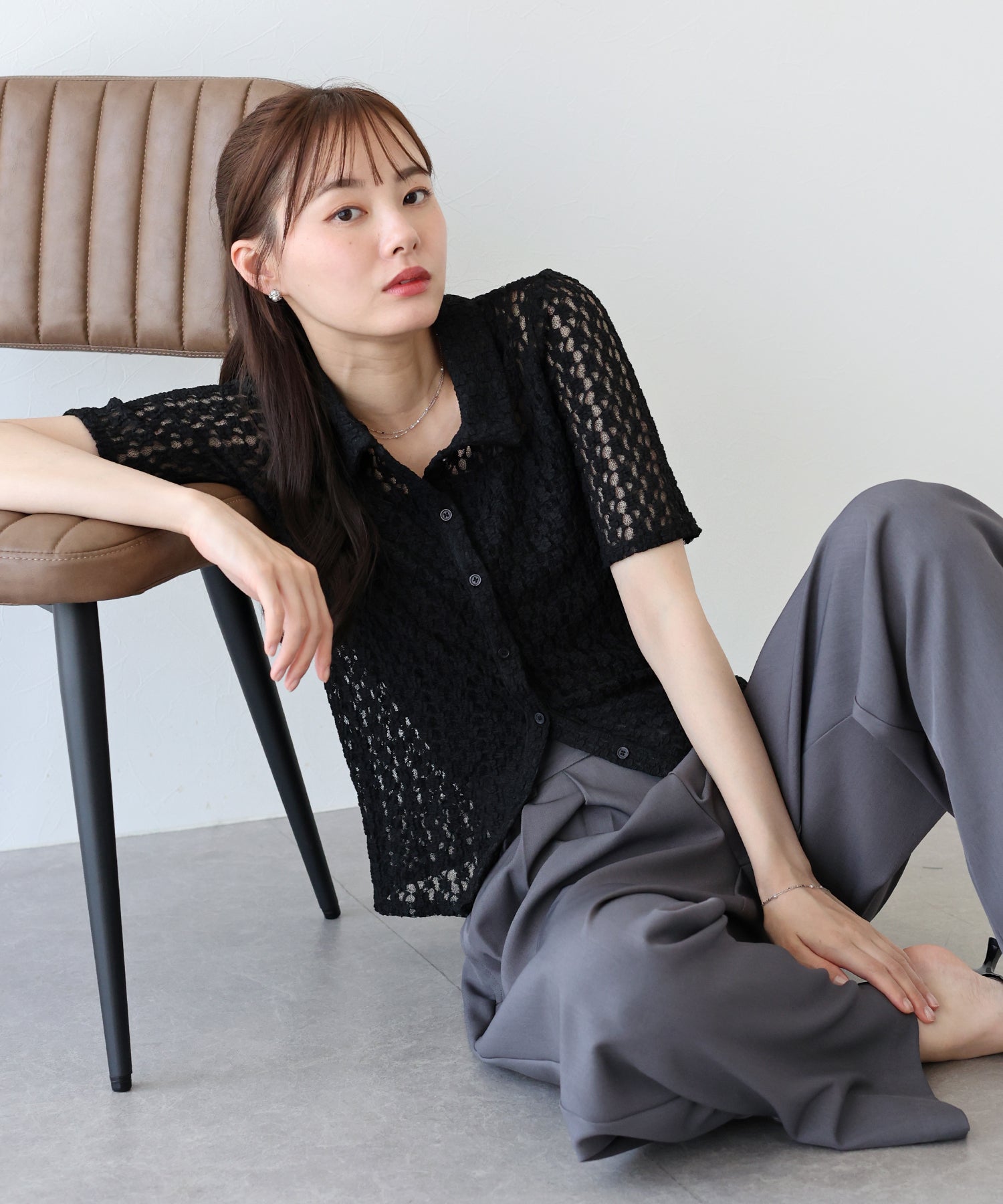 ヘルシーな透け感を楽しめるポロ襟フラワーレースシャツ