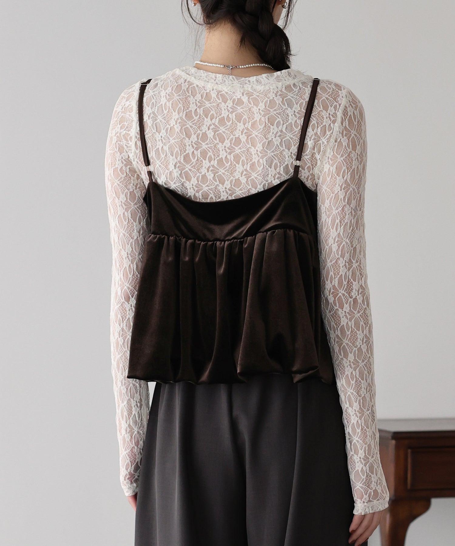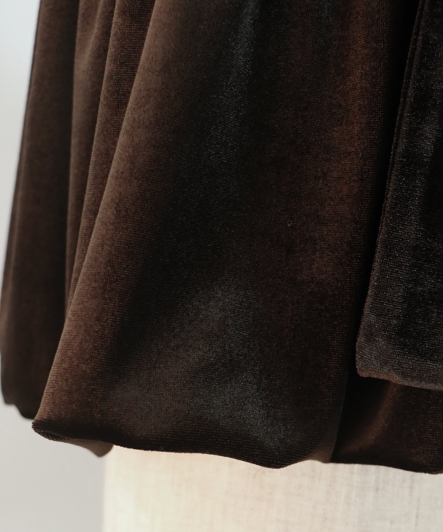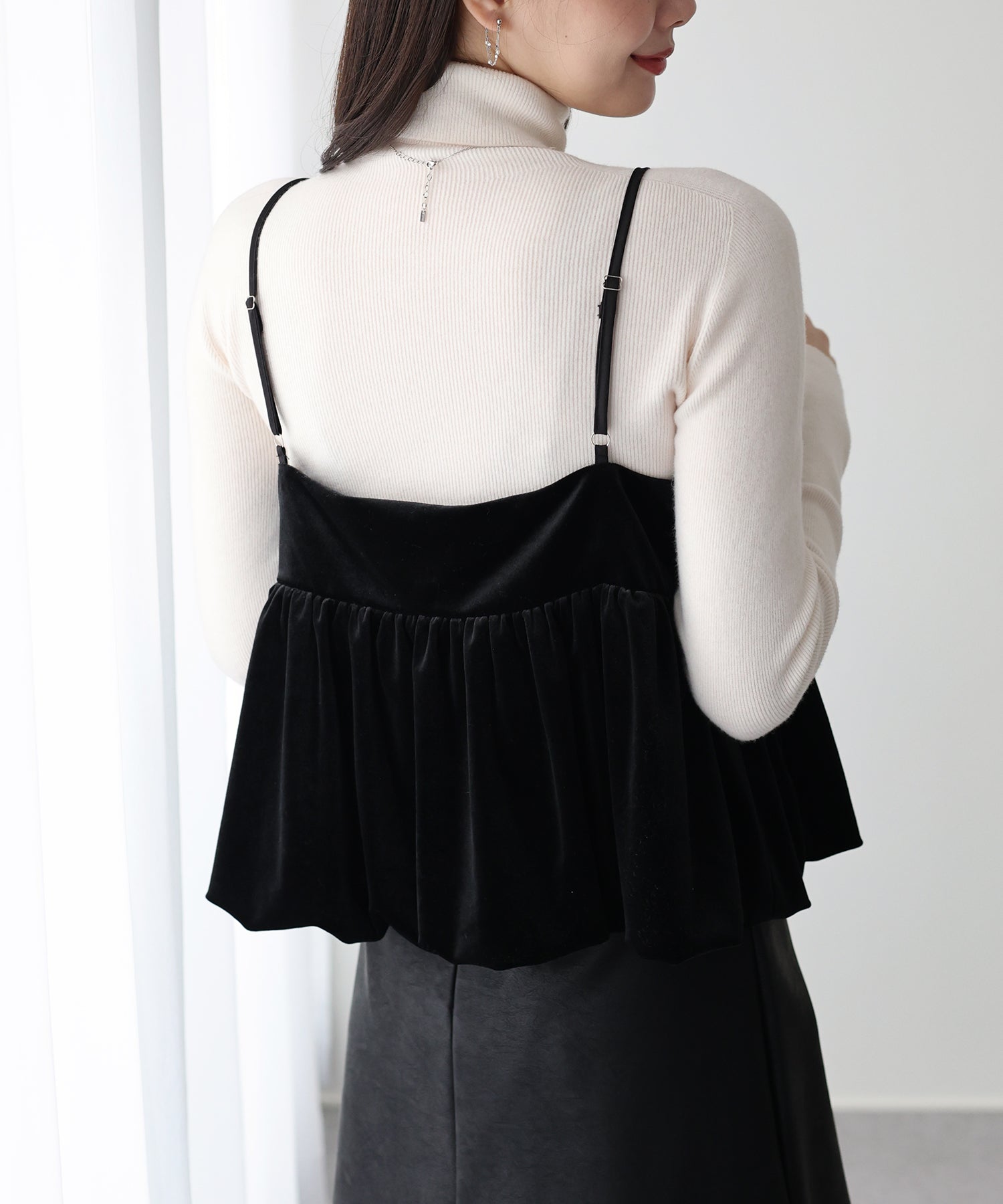 ふわっと広がるバルーンシルエットと上品な光沢が魅力のベロアビスチェ
