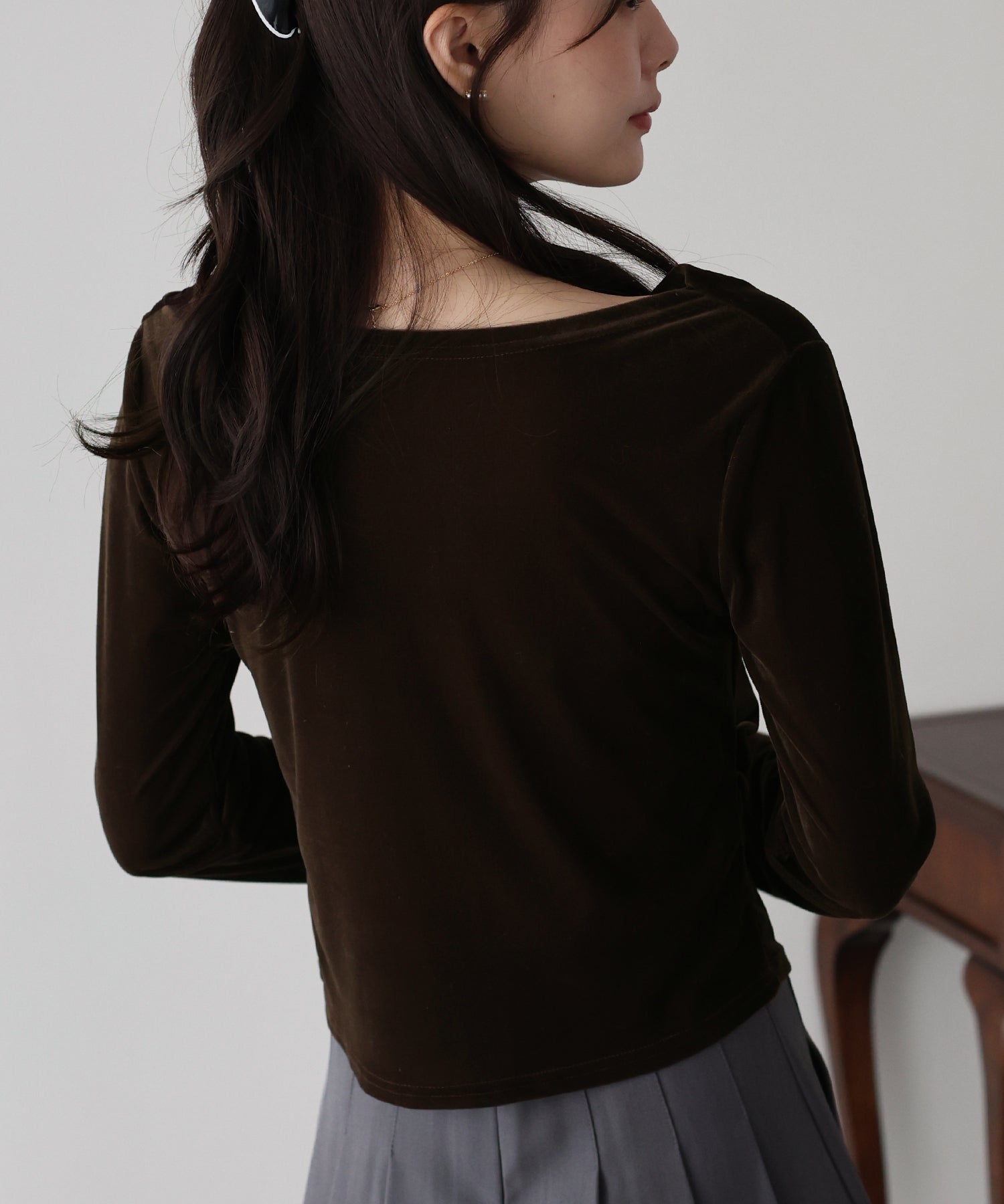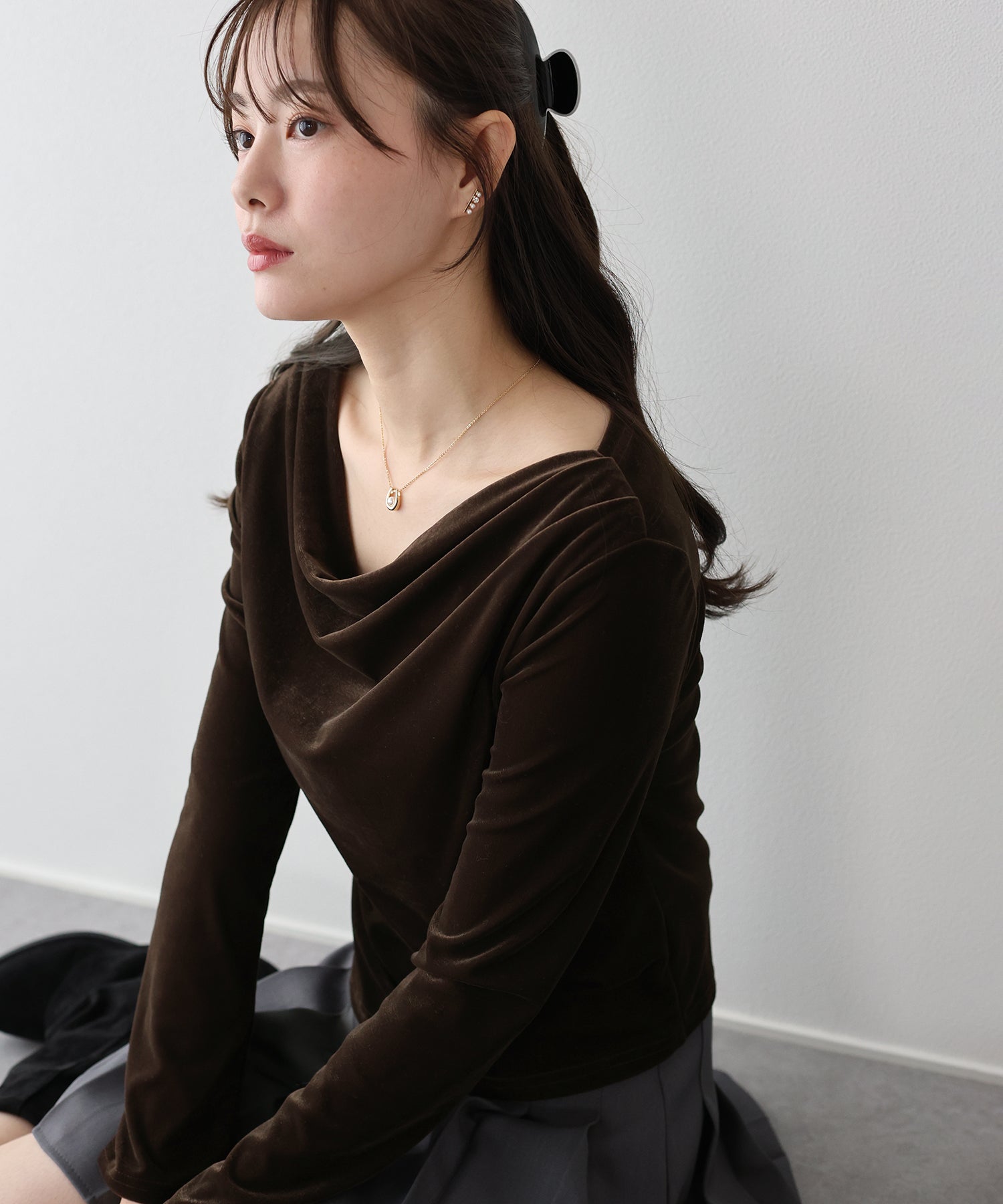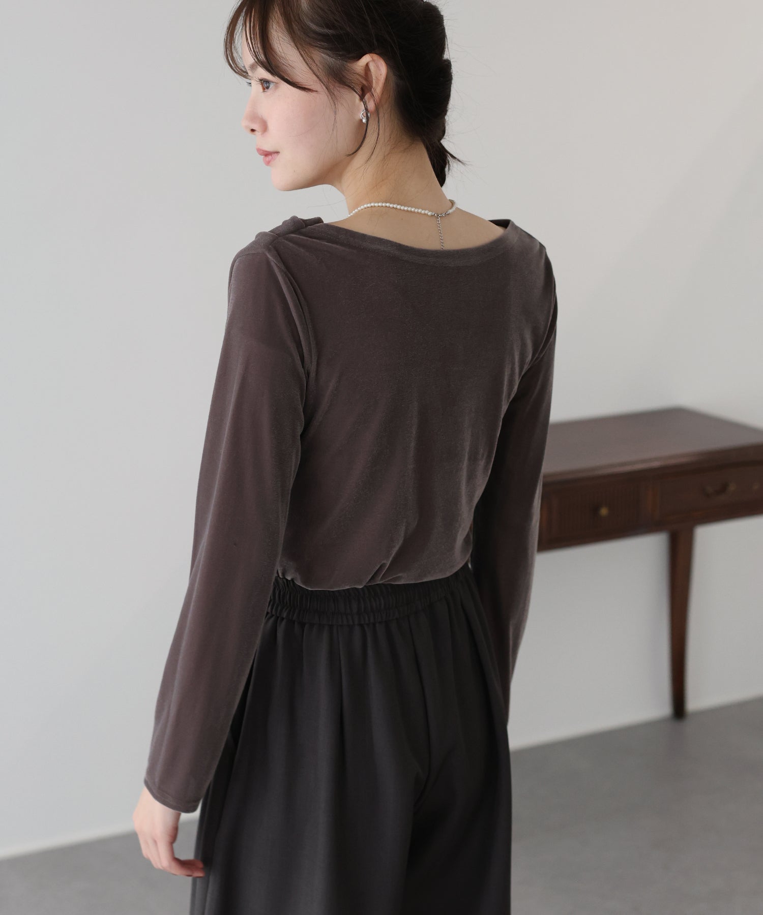 流れるようなドレープ感たっぷりのネックラインの、うっすらと透け感のあるシアーベロアカットソー。