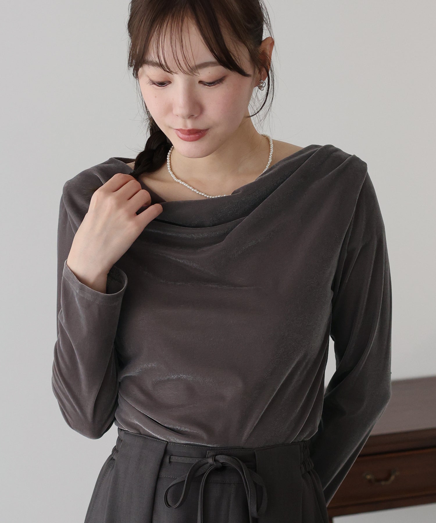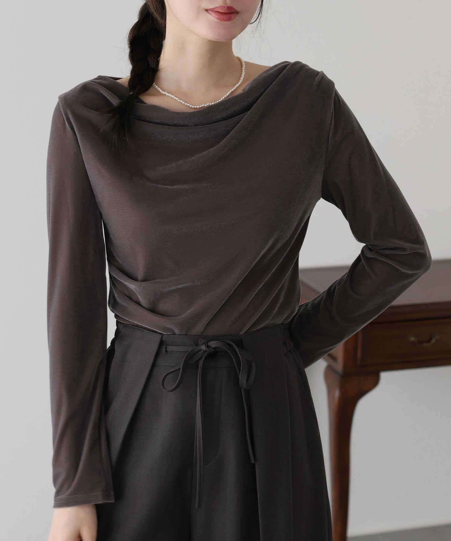 華奢な雰囲気を演出するドレープネックオフショルダートップス