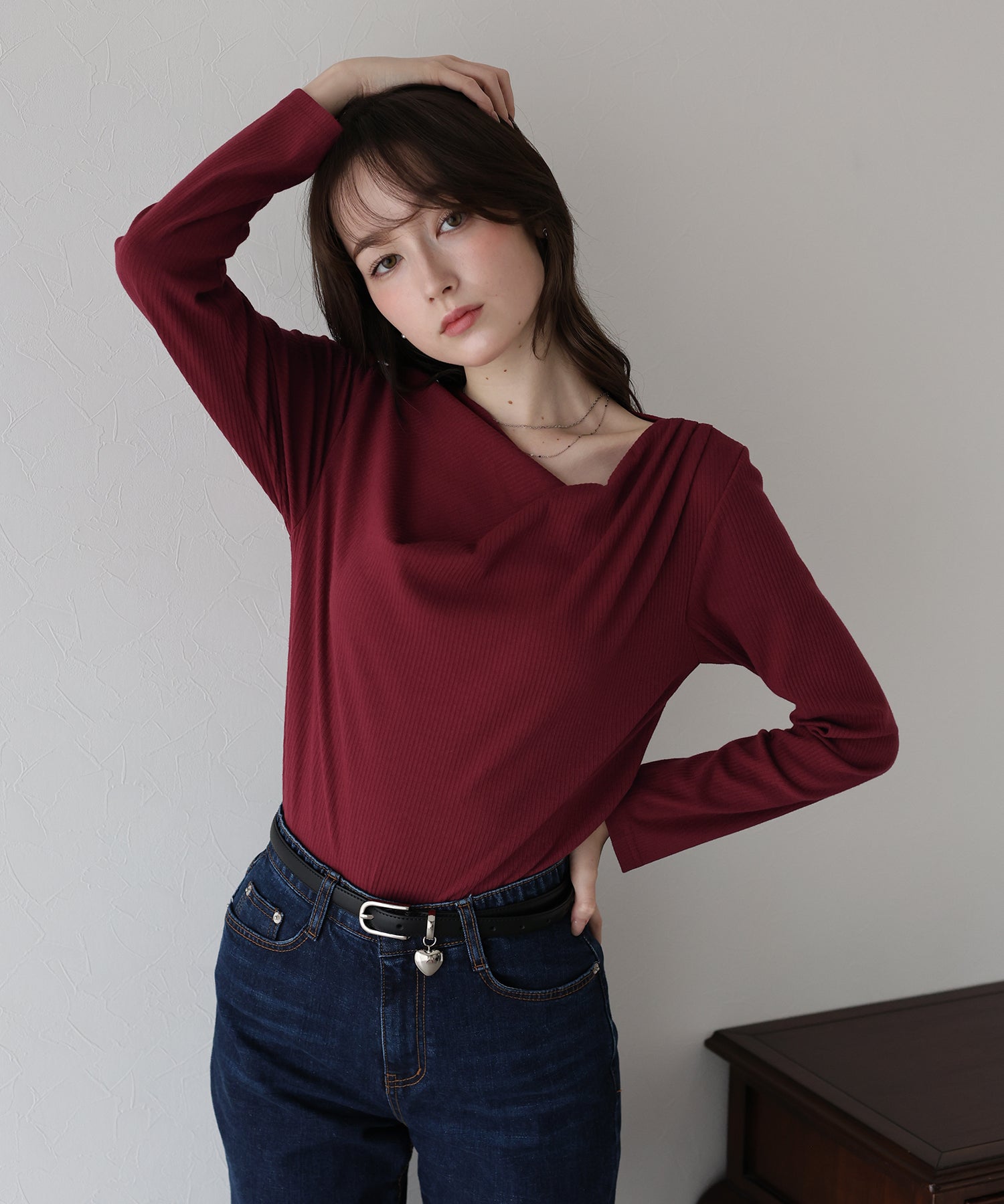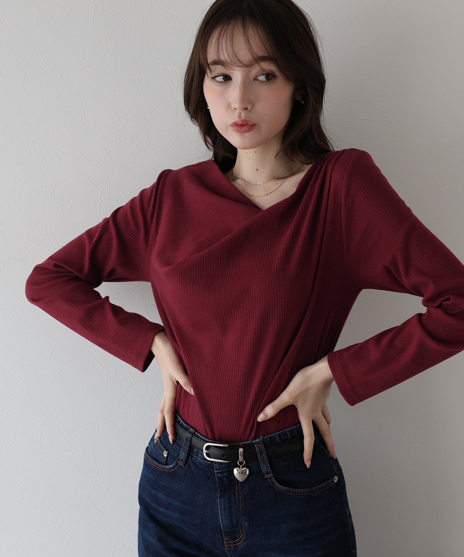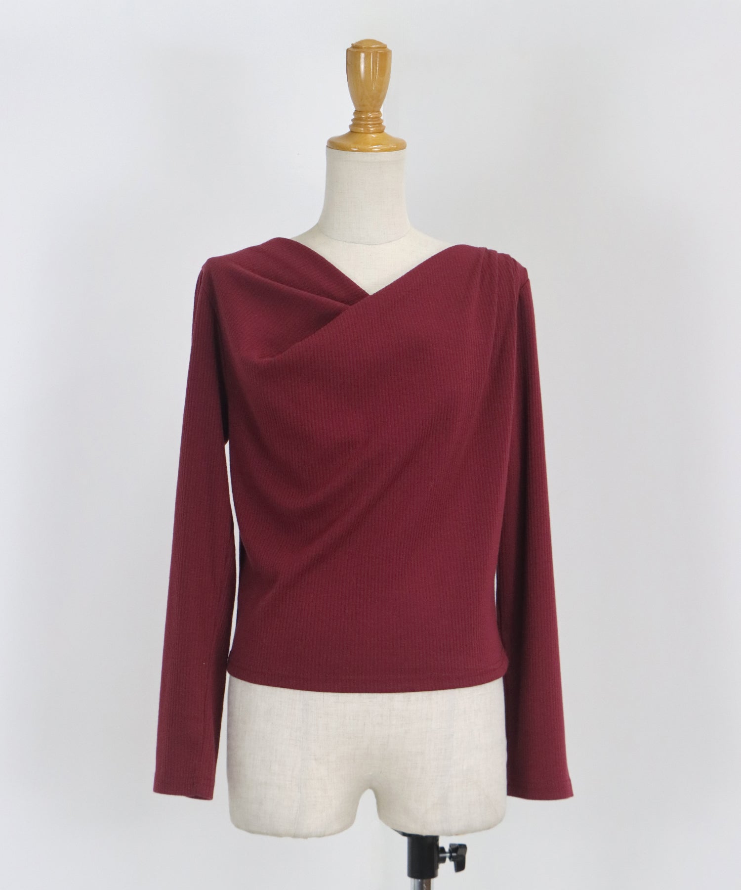 デコルテを美しく見せてくれるドレープデザインで、カジュアルながらも女性らしさを演出します。