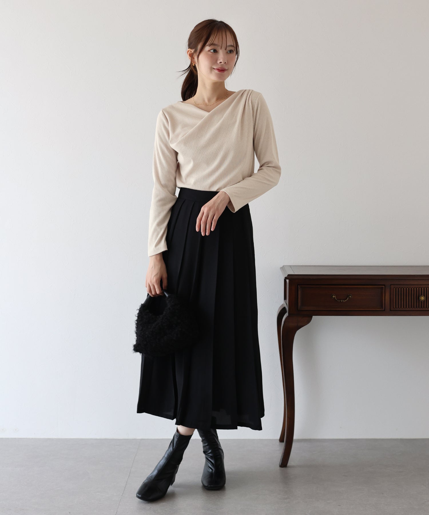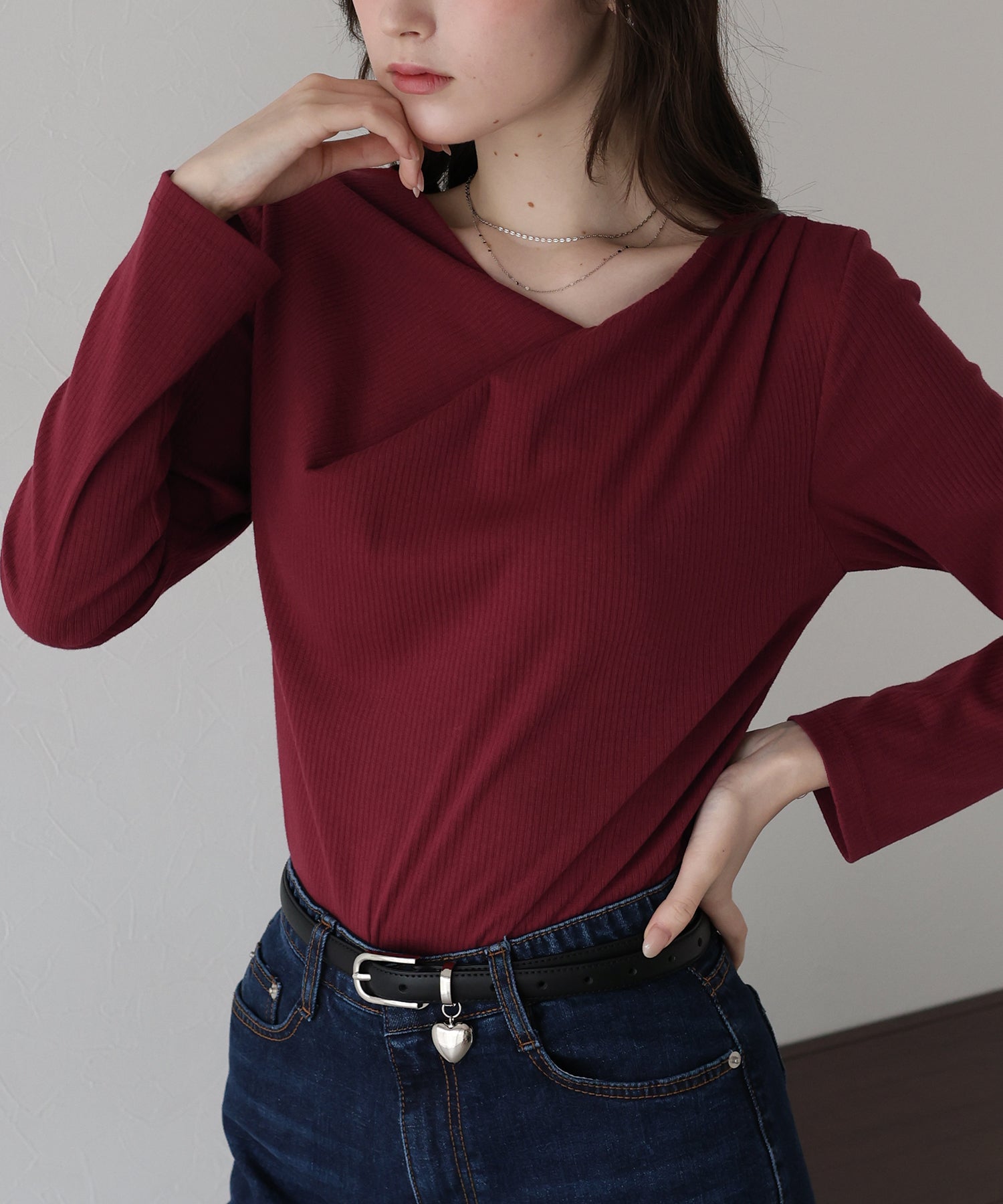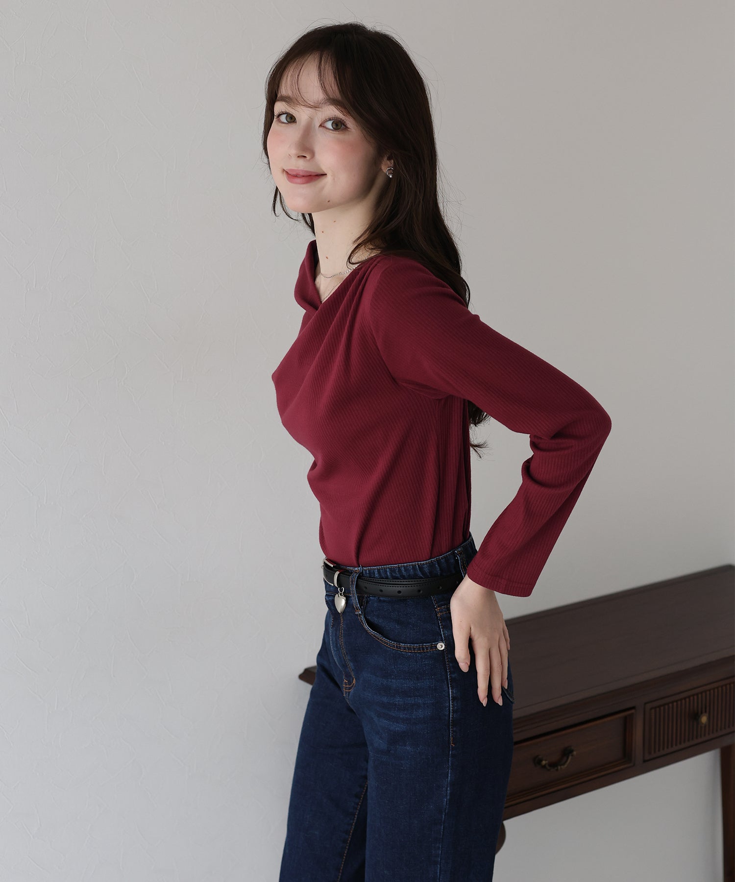 デコルテを美しく見せてくれるドレープデザインで、カジュアルながらも女性らしさを演出します。