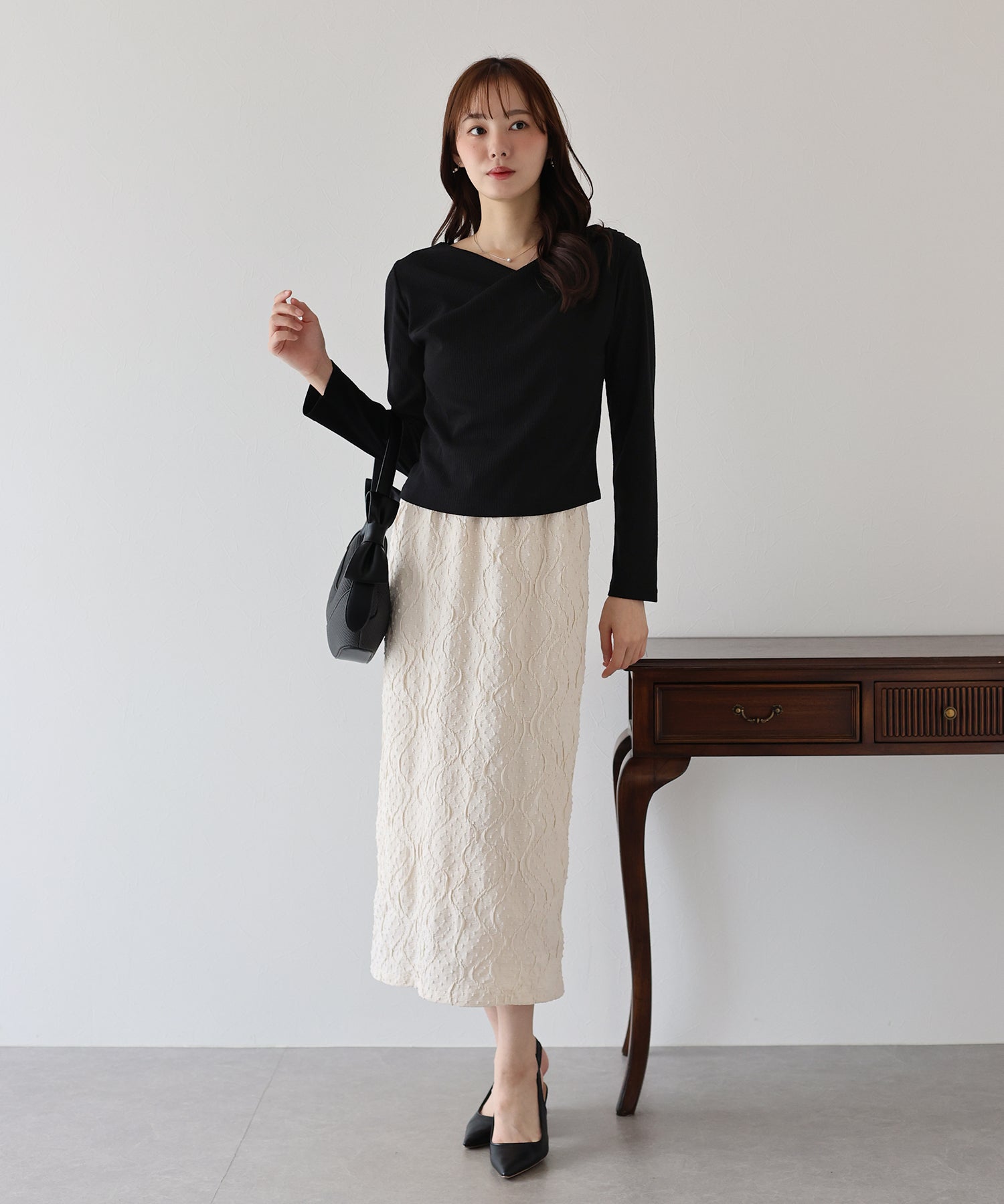 流れるようなドレープ感たっぷりのカシュクール風ネックラインが上品なTシャツ。
