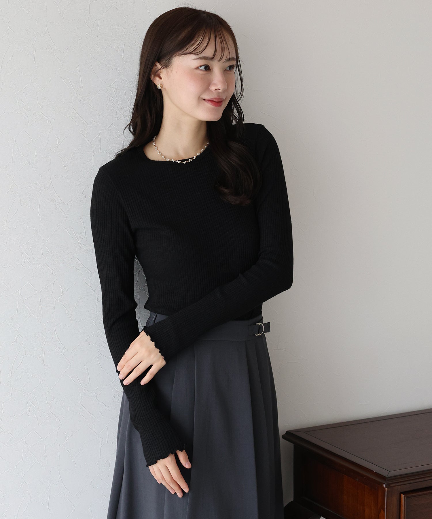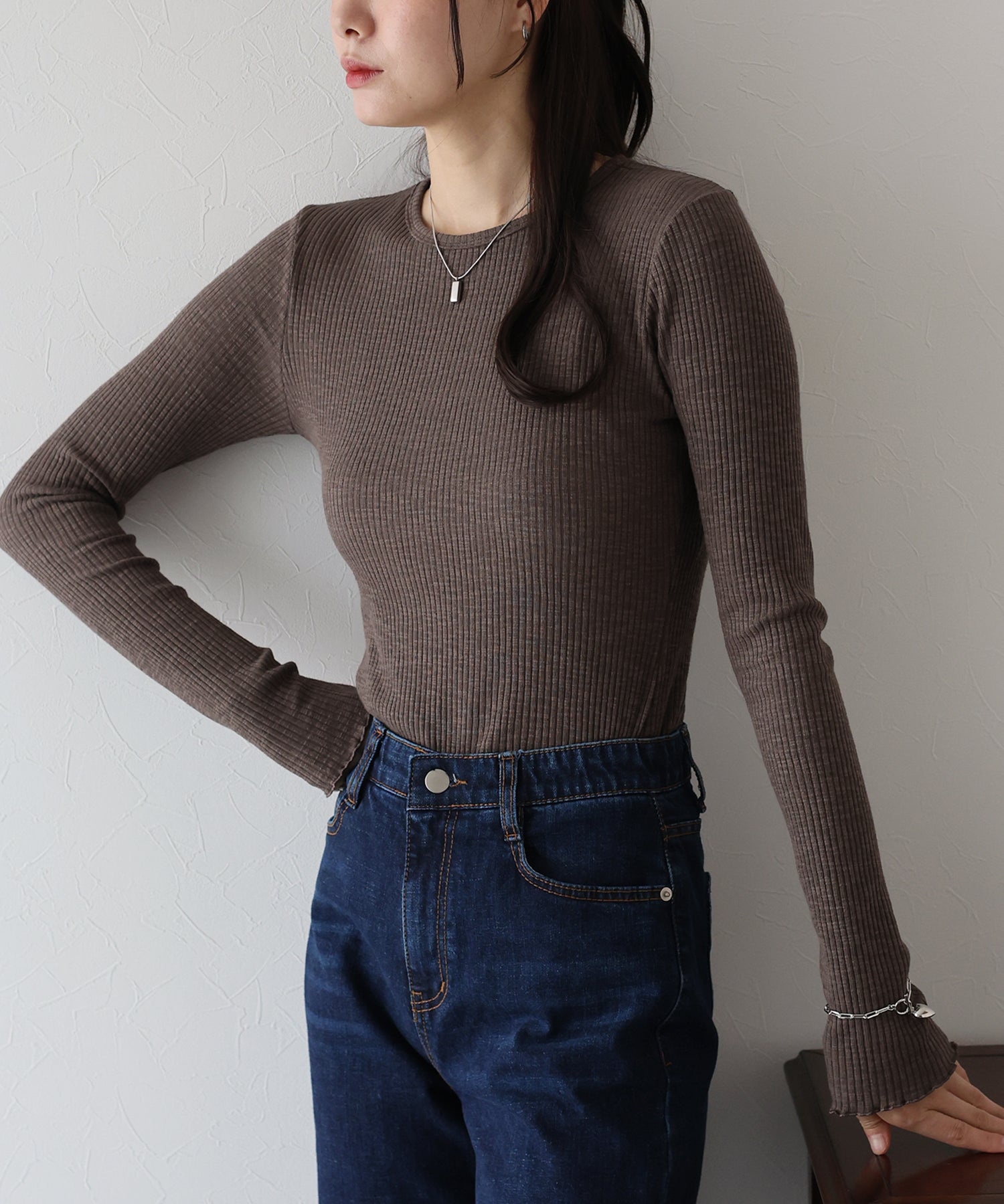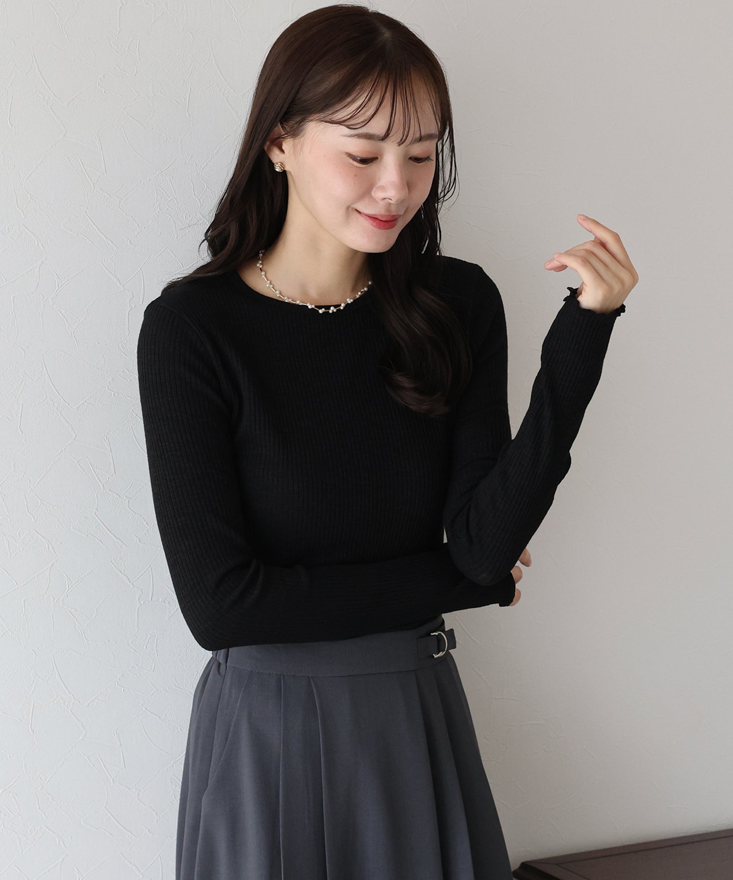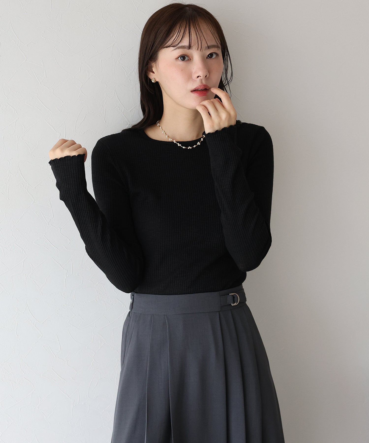 クルーネックのシンプルな首元は顔まわりをすっきり見せつつ、ネックレスやピアスとの相性も抜群です。