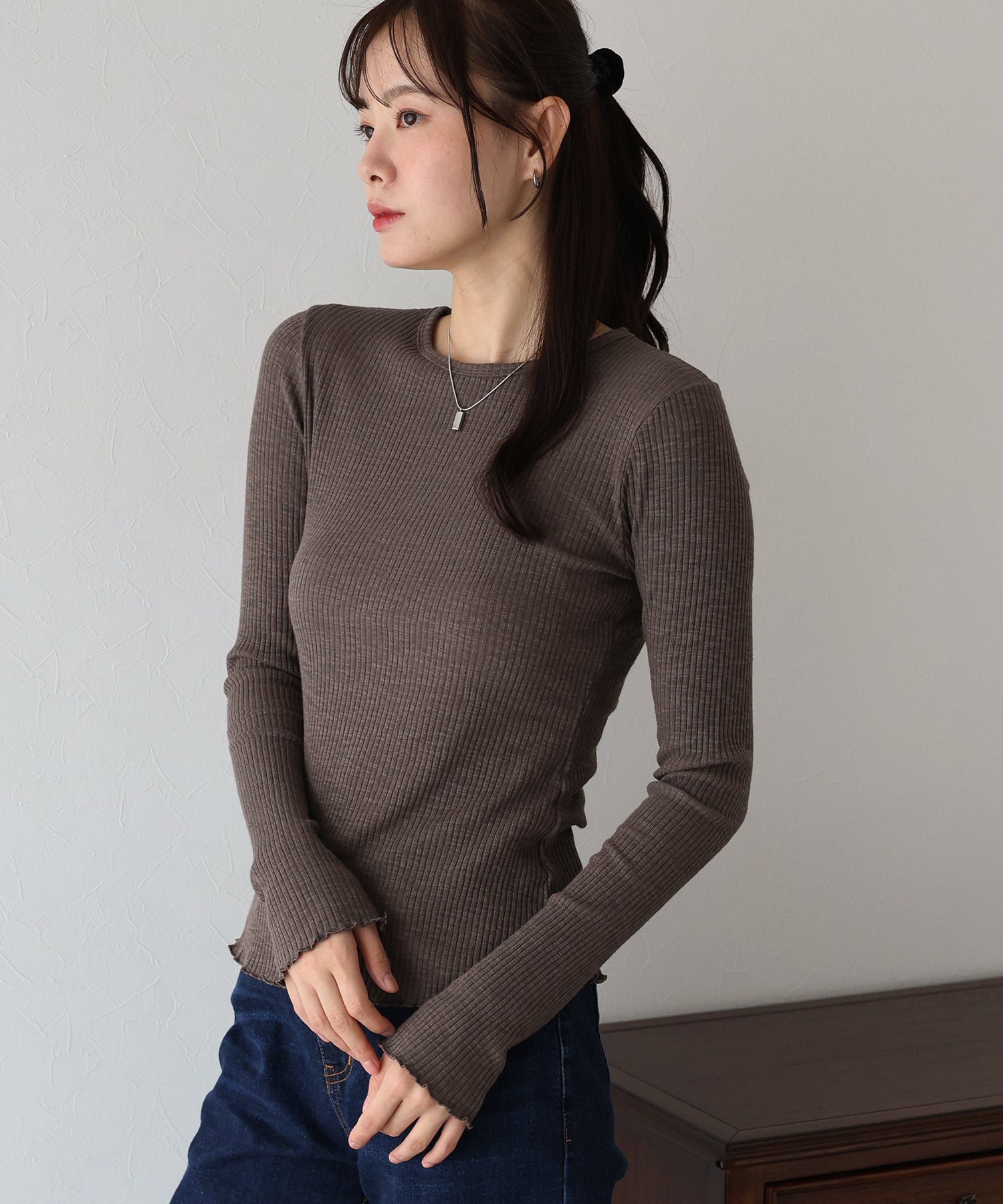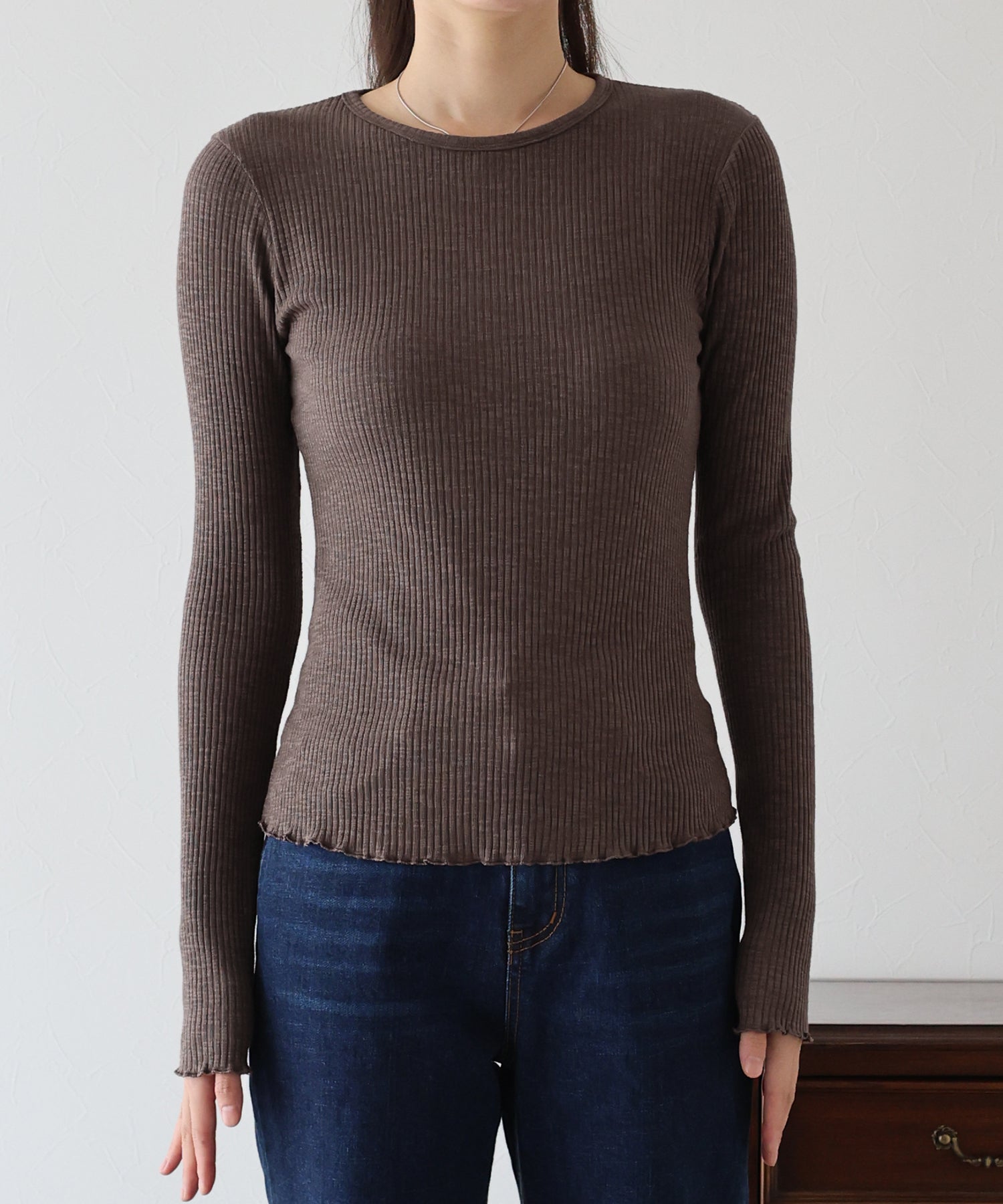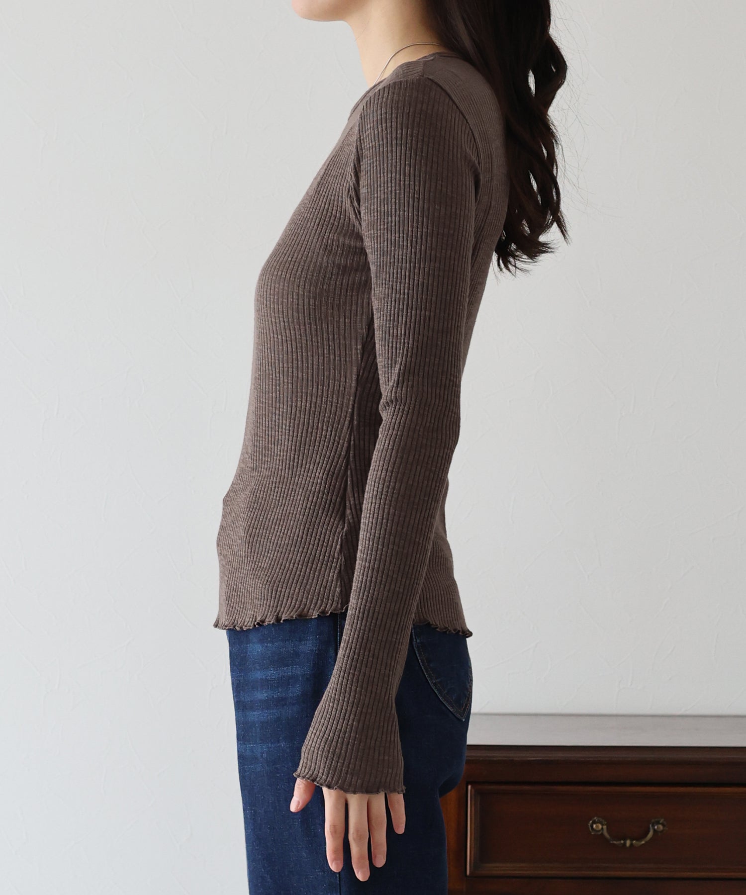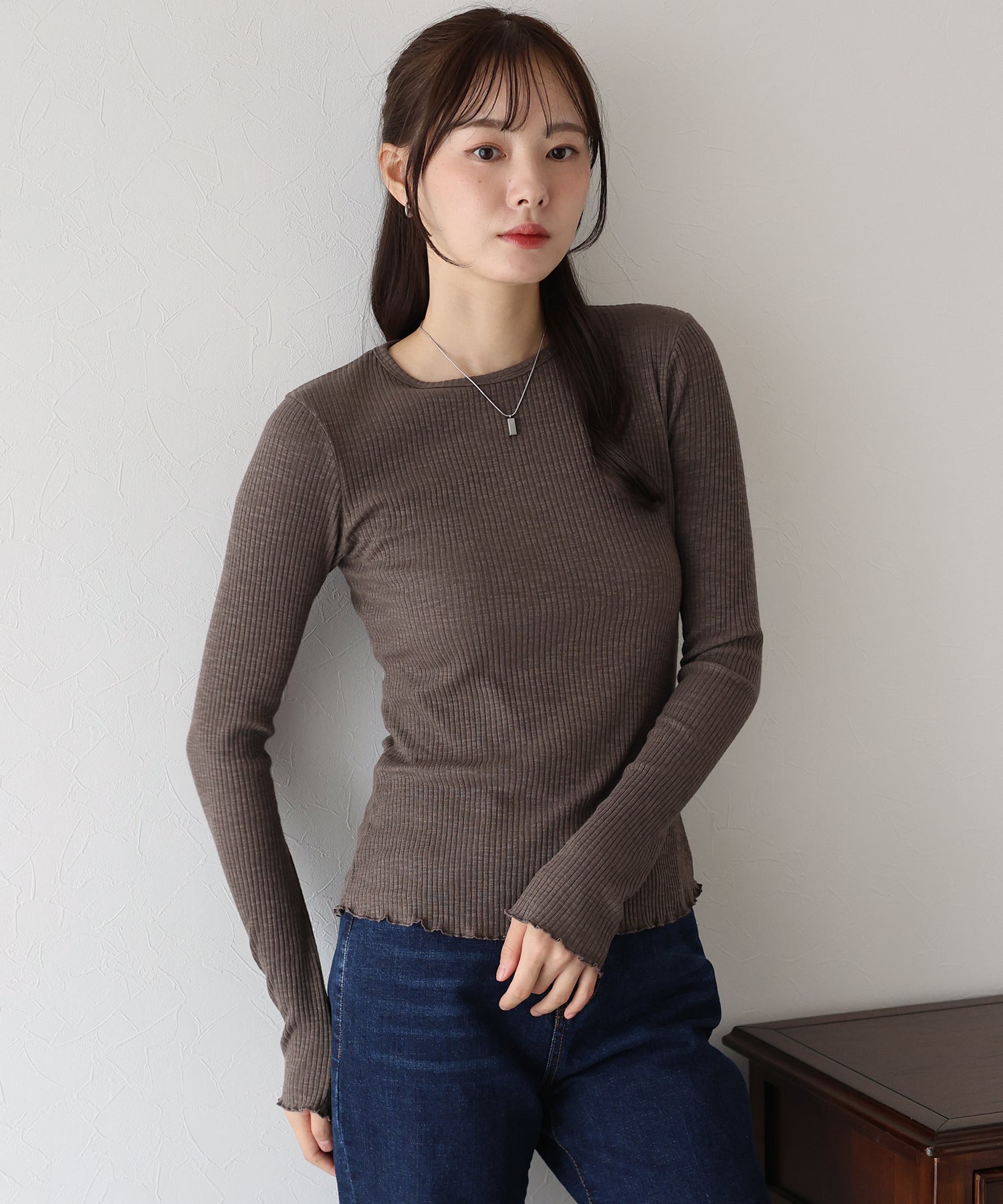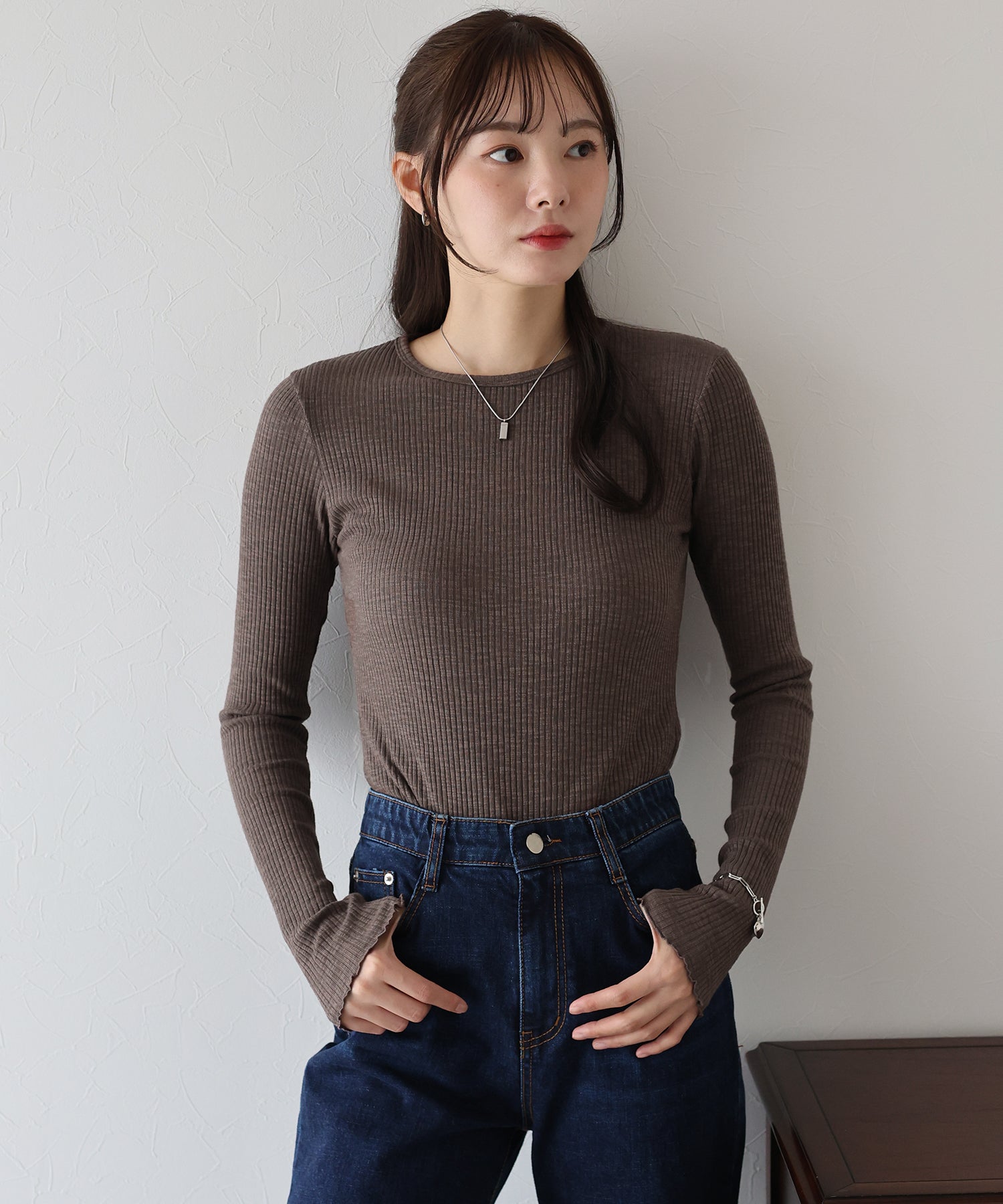 クルーネックのシンプルな首元は顔まわりをすっきり見せつつ、ネックレスやピアスとの相性も抜群です。