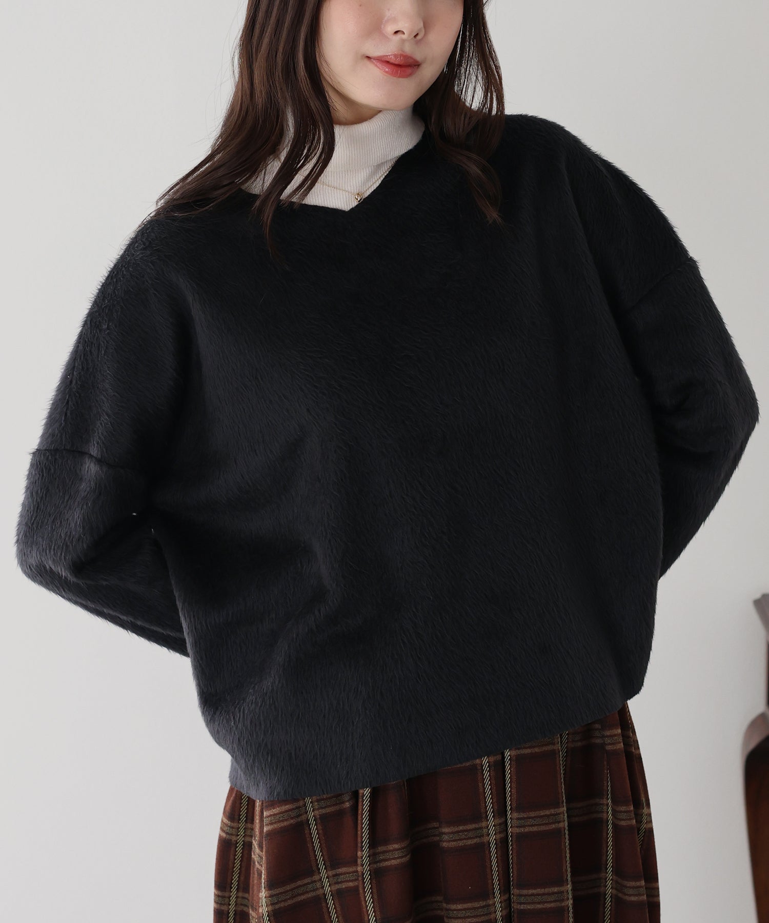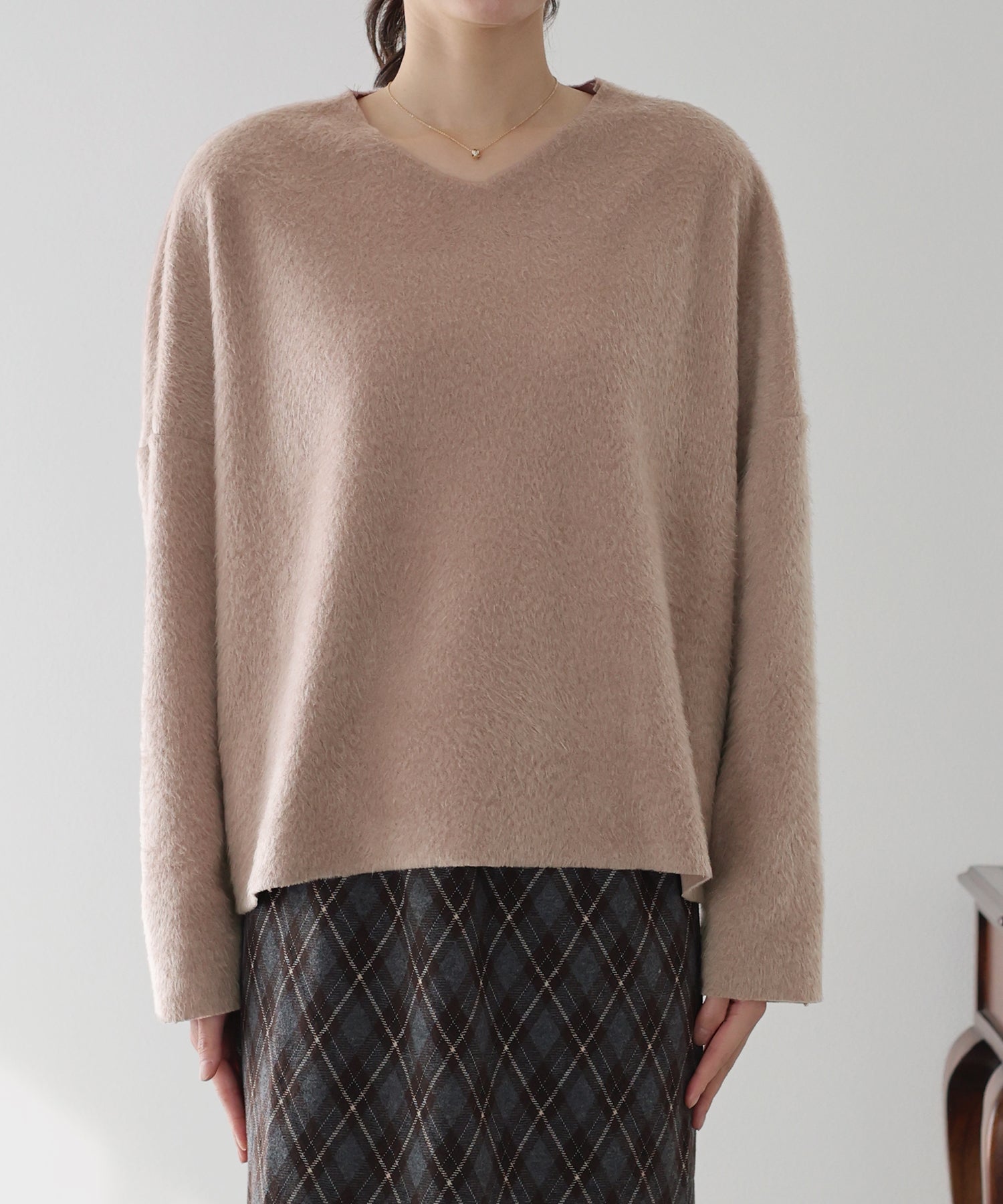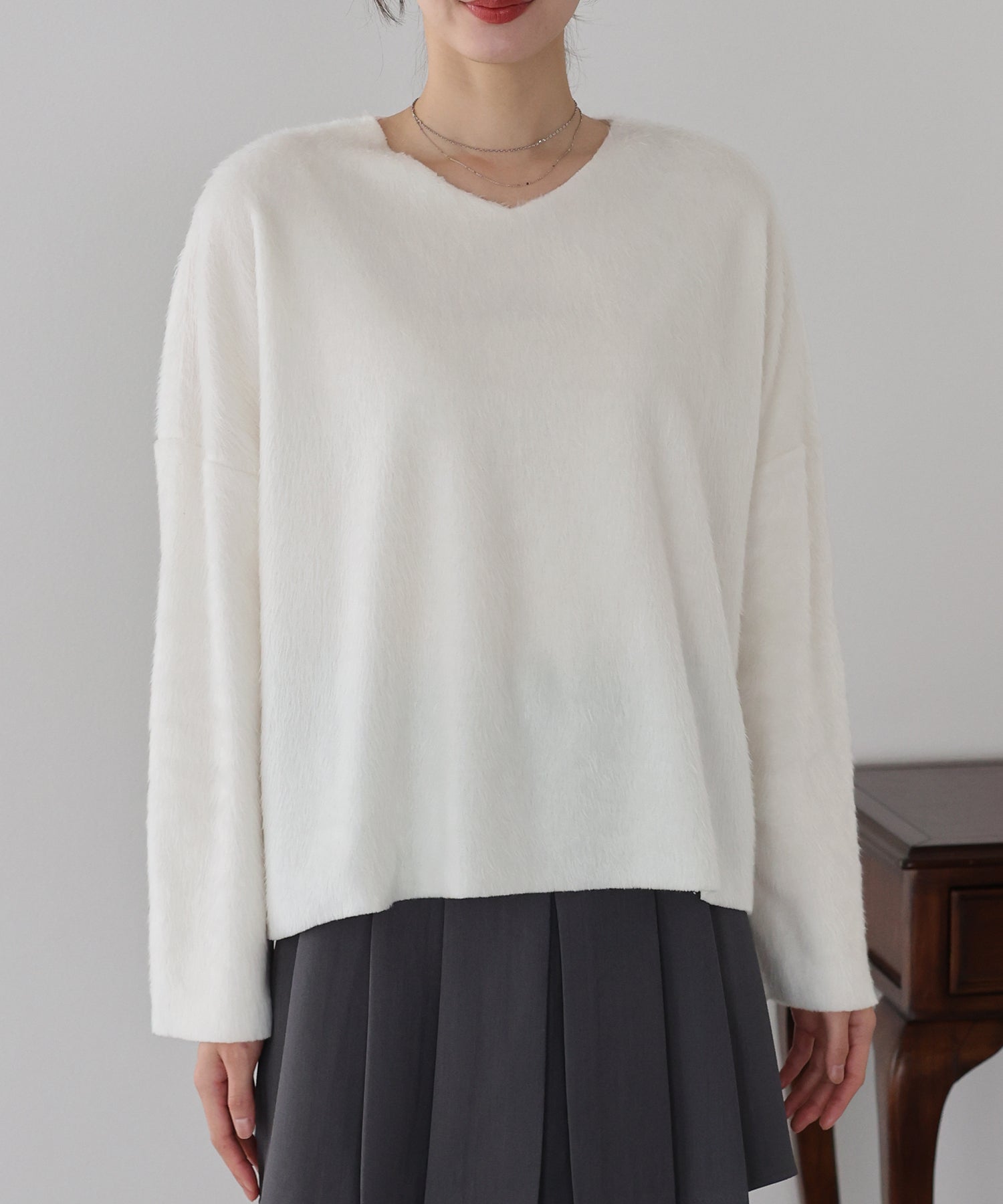 Vネックデザインが程よい抜け感を演出し、首元やデコルテを美しく演出します。