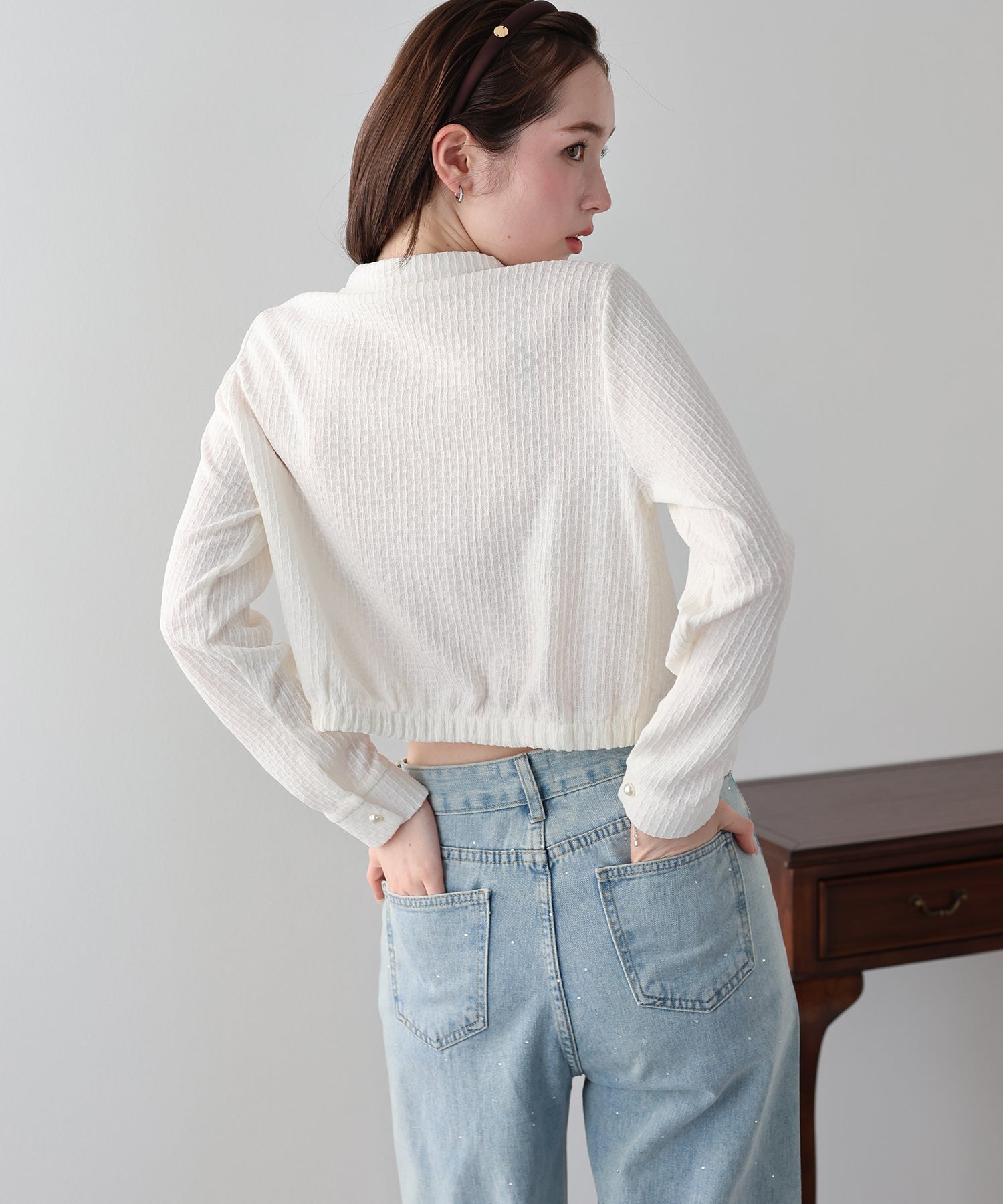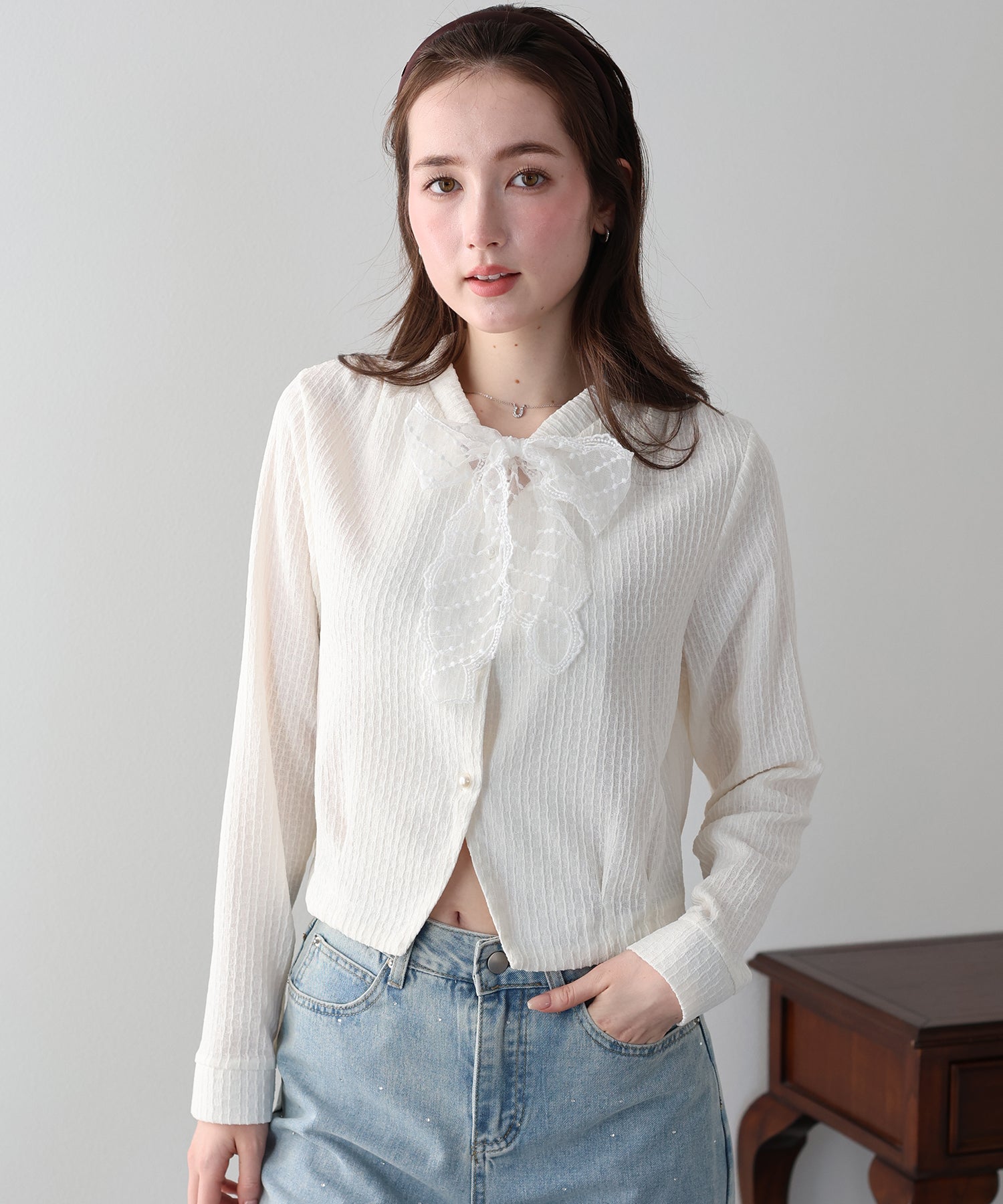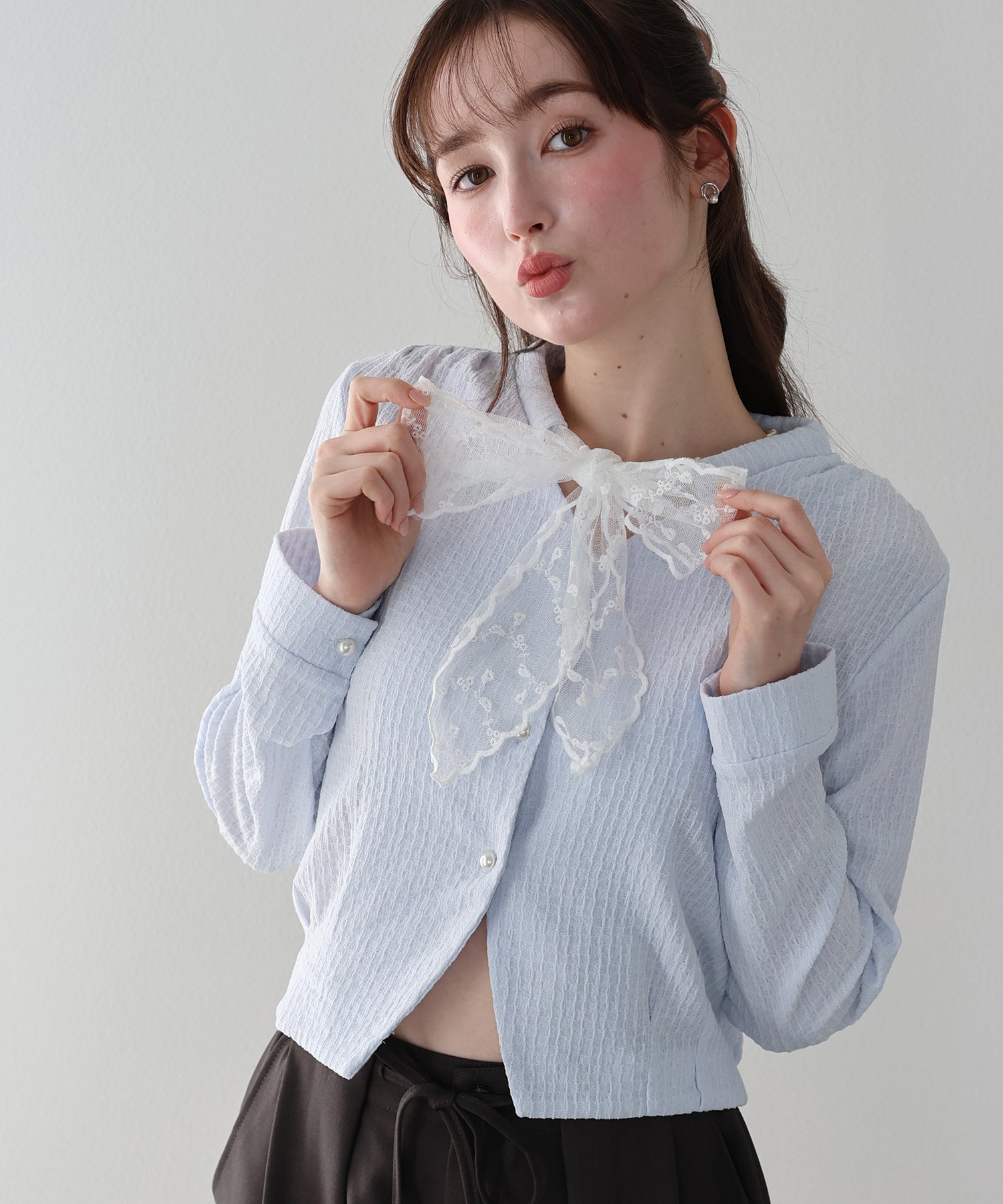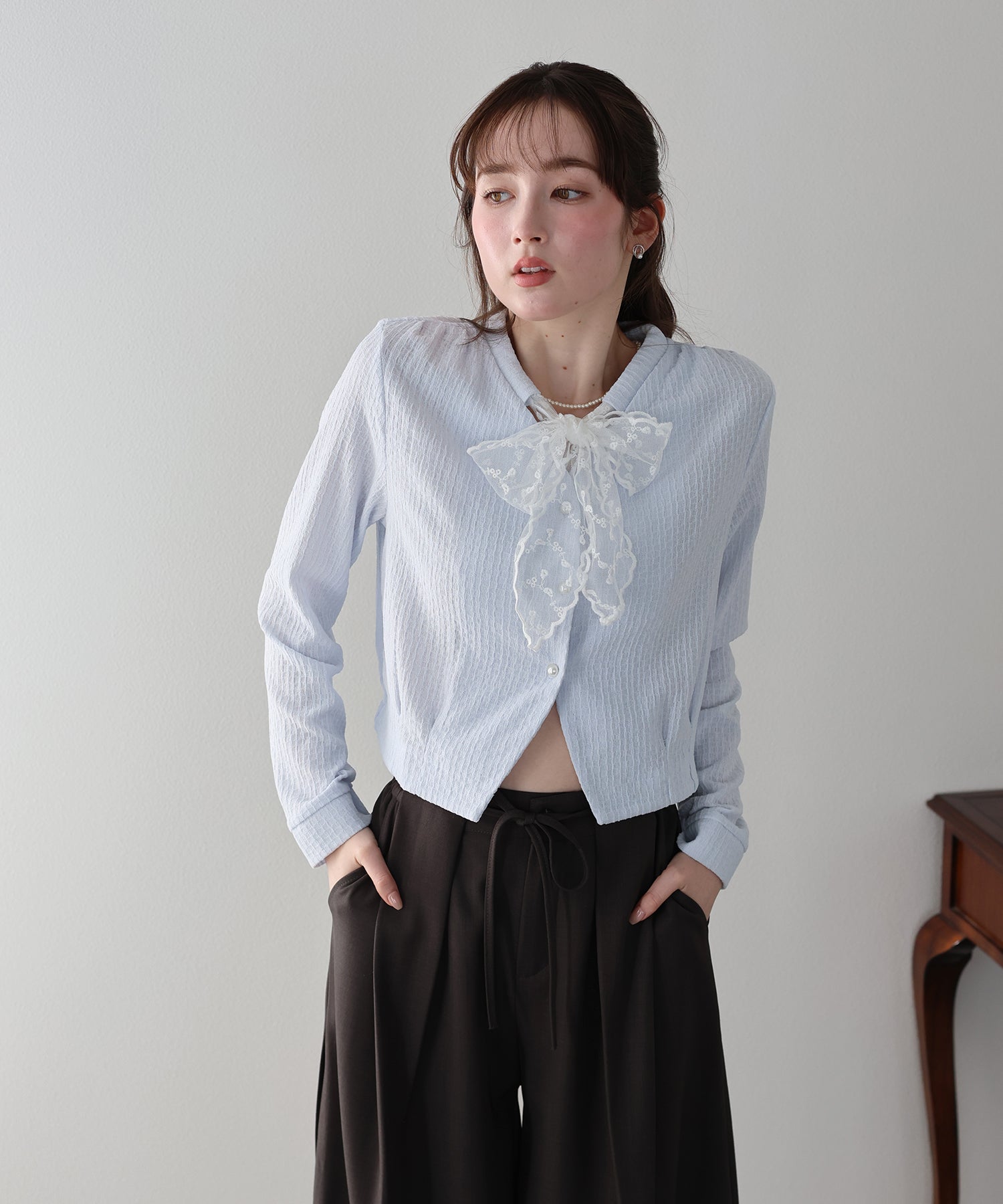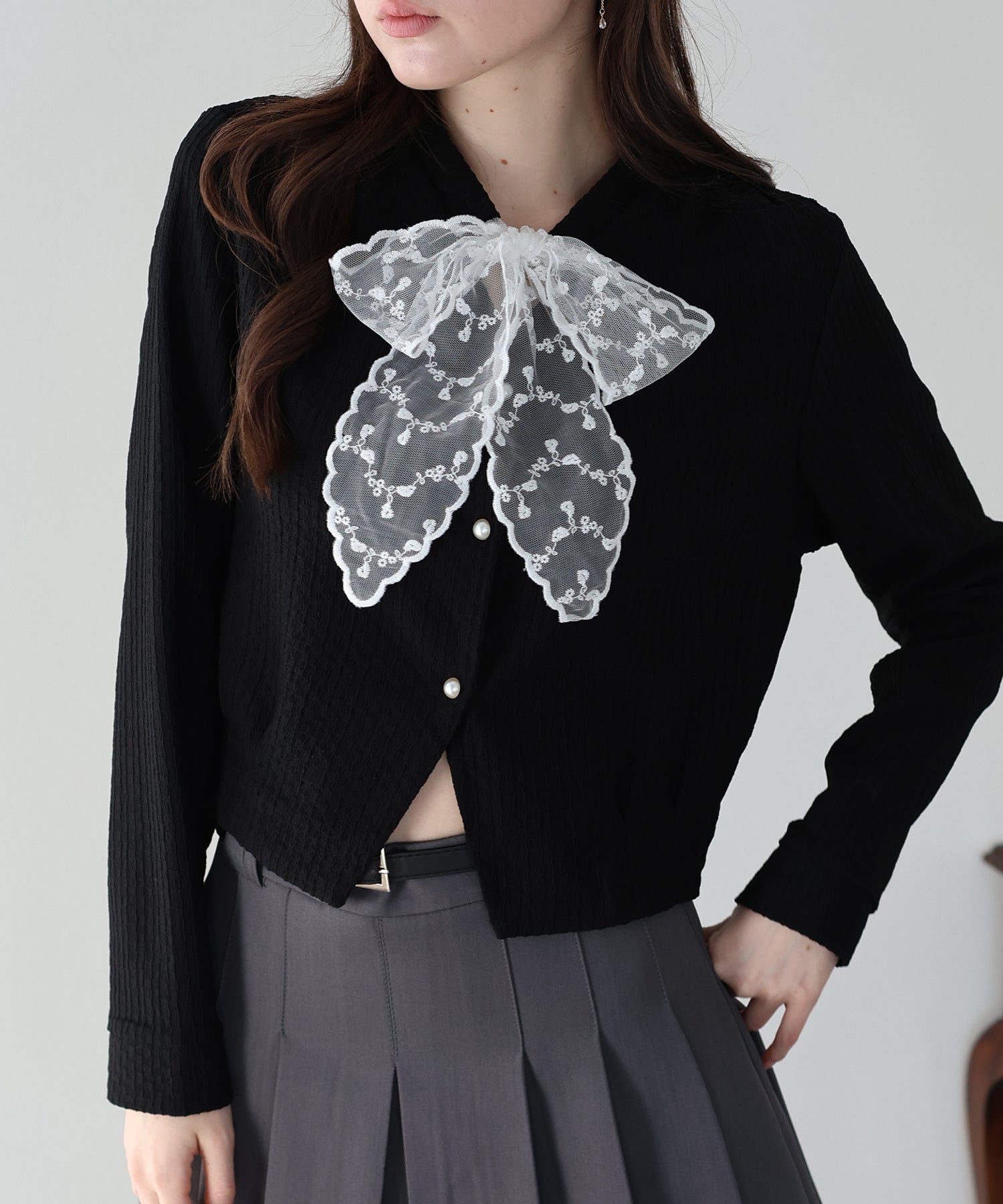 お顔周りに華やかさを添えるレースリボンと、気品溢れるパールボタンが目を惹くカーディガン。