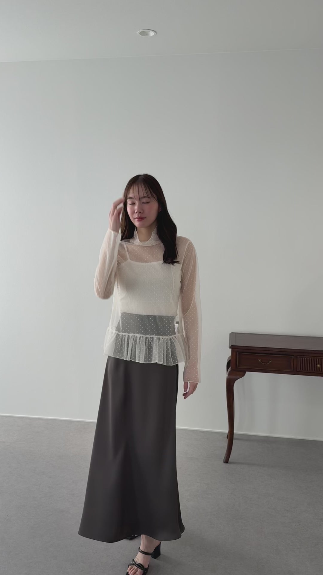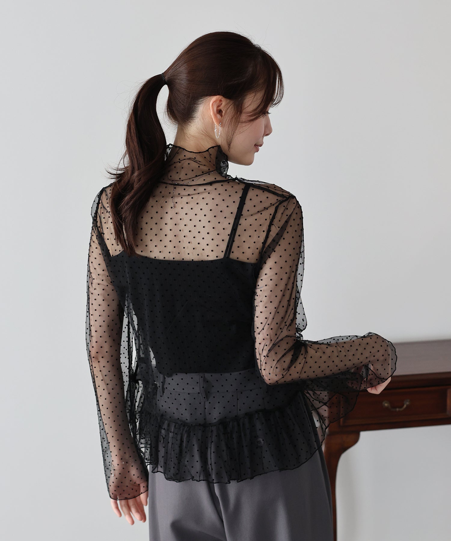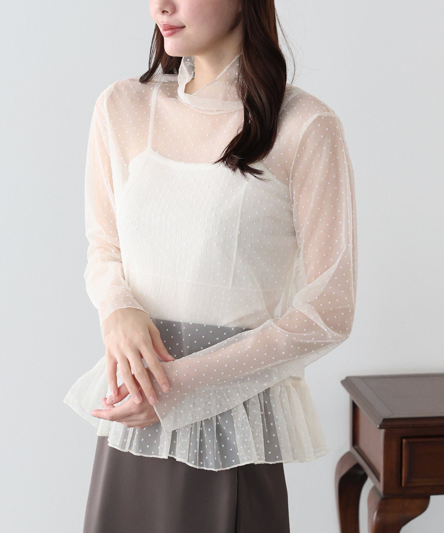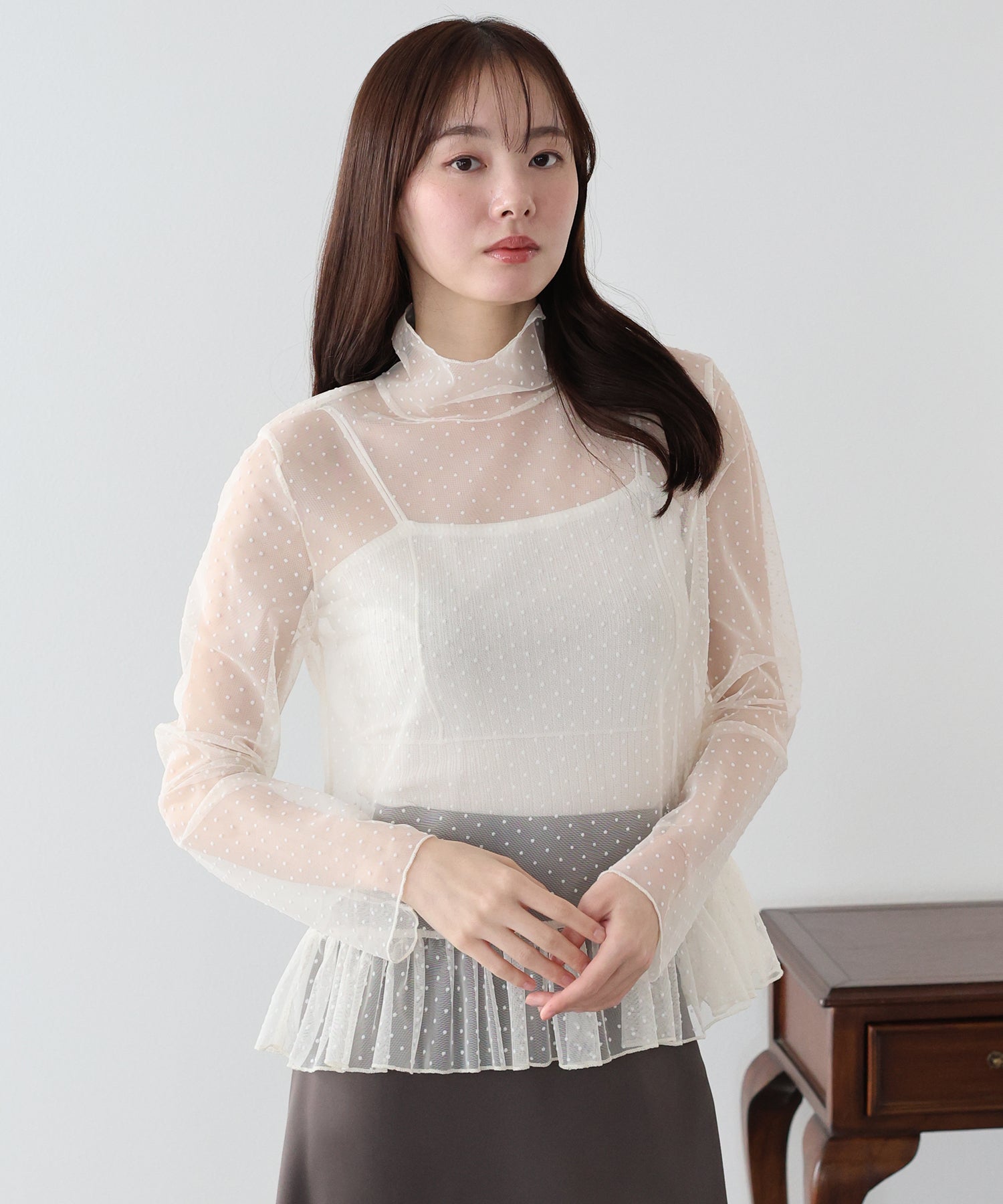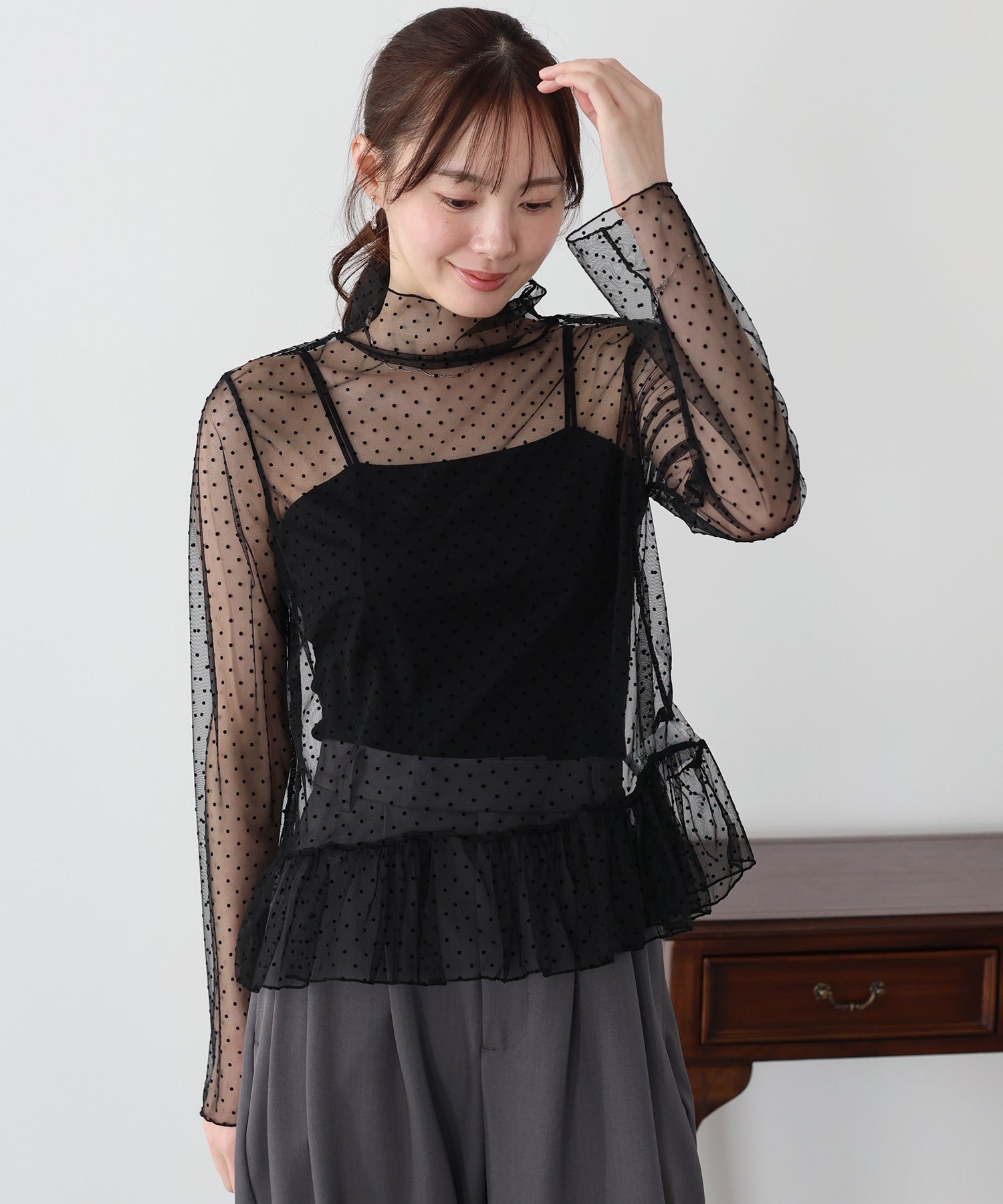 表面感のあるフロッキードット柄のシアートップス。