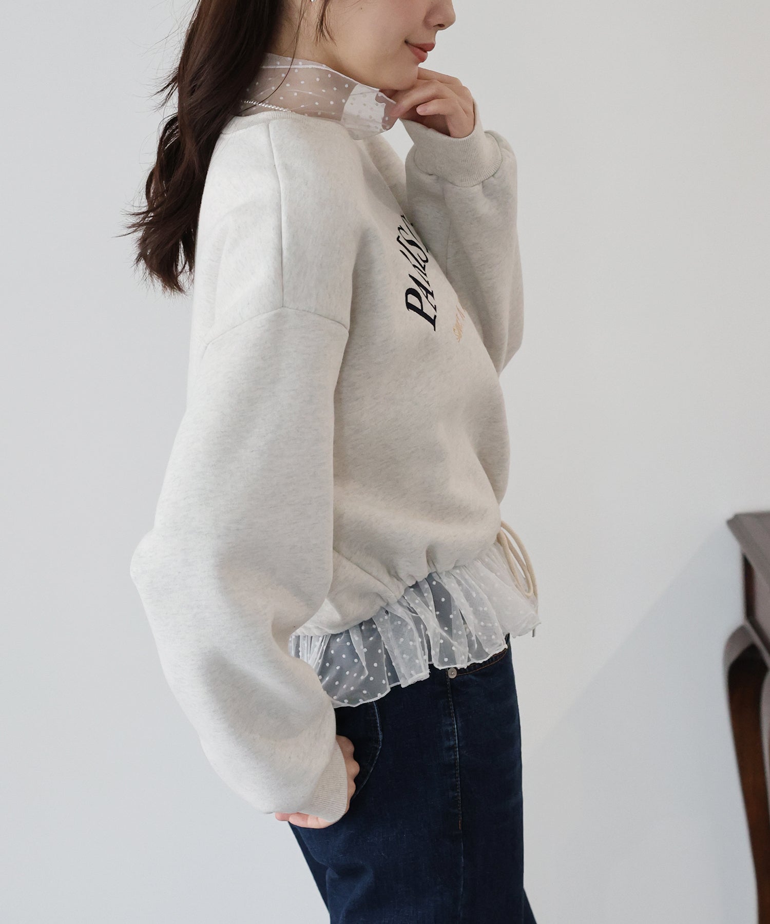 ハイネック&裾ギャザーデザインなので、
